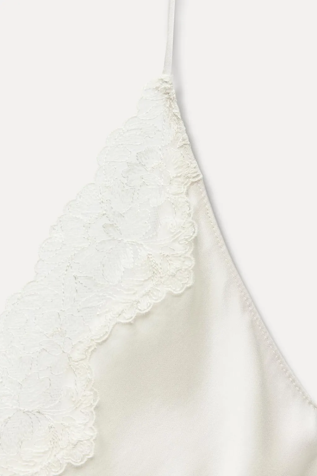 Top confeccionado en hilatura de viscosa. Escote pico y tirantes finos. Detalle de aplicación de encaje.