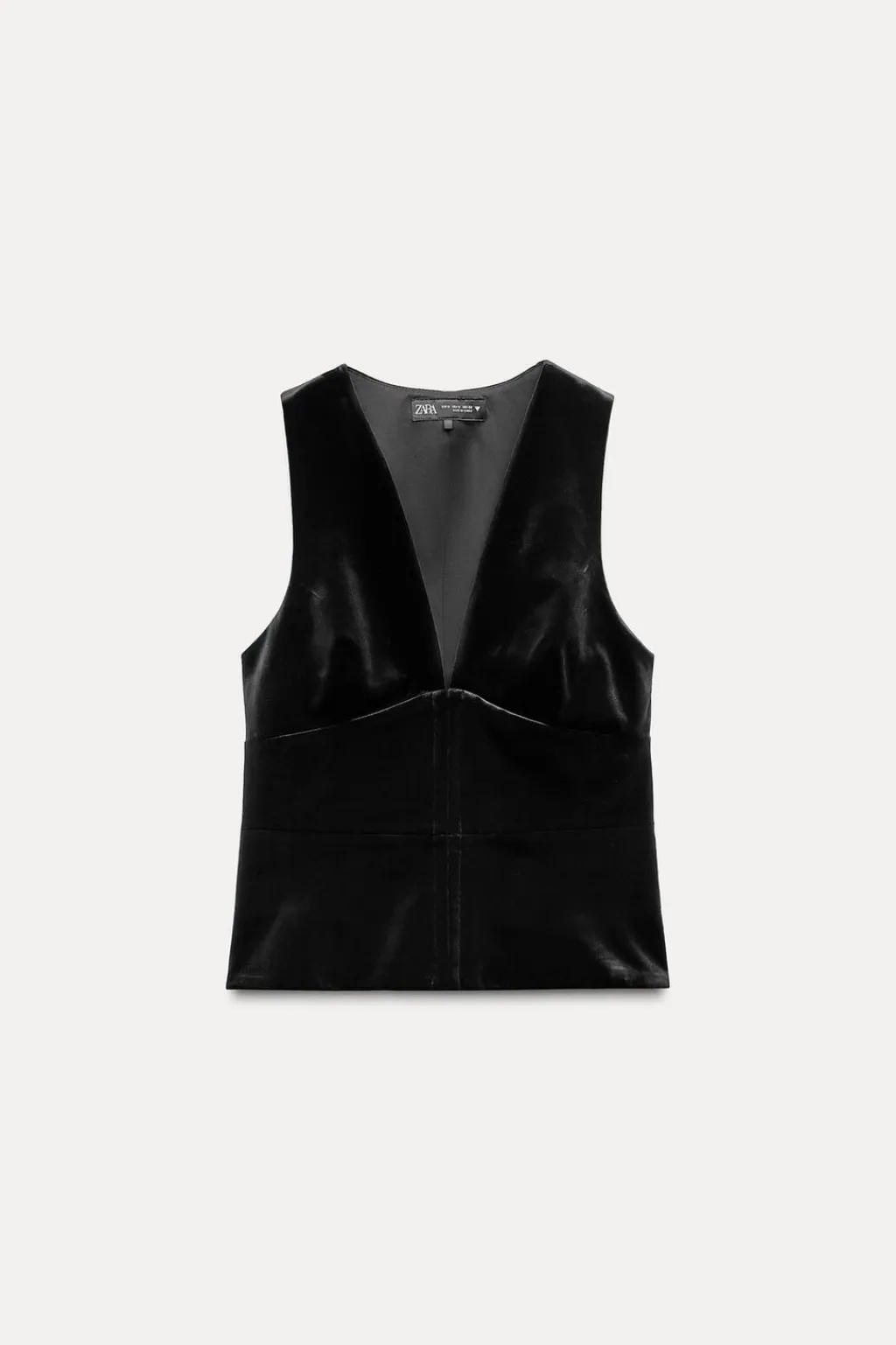 Top de escote pico y manga sisa. Forro interior. Cierre frontal con ganchos metálicos.