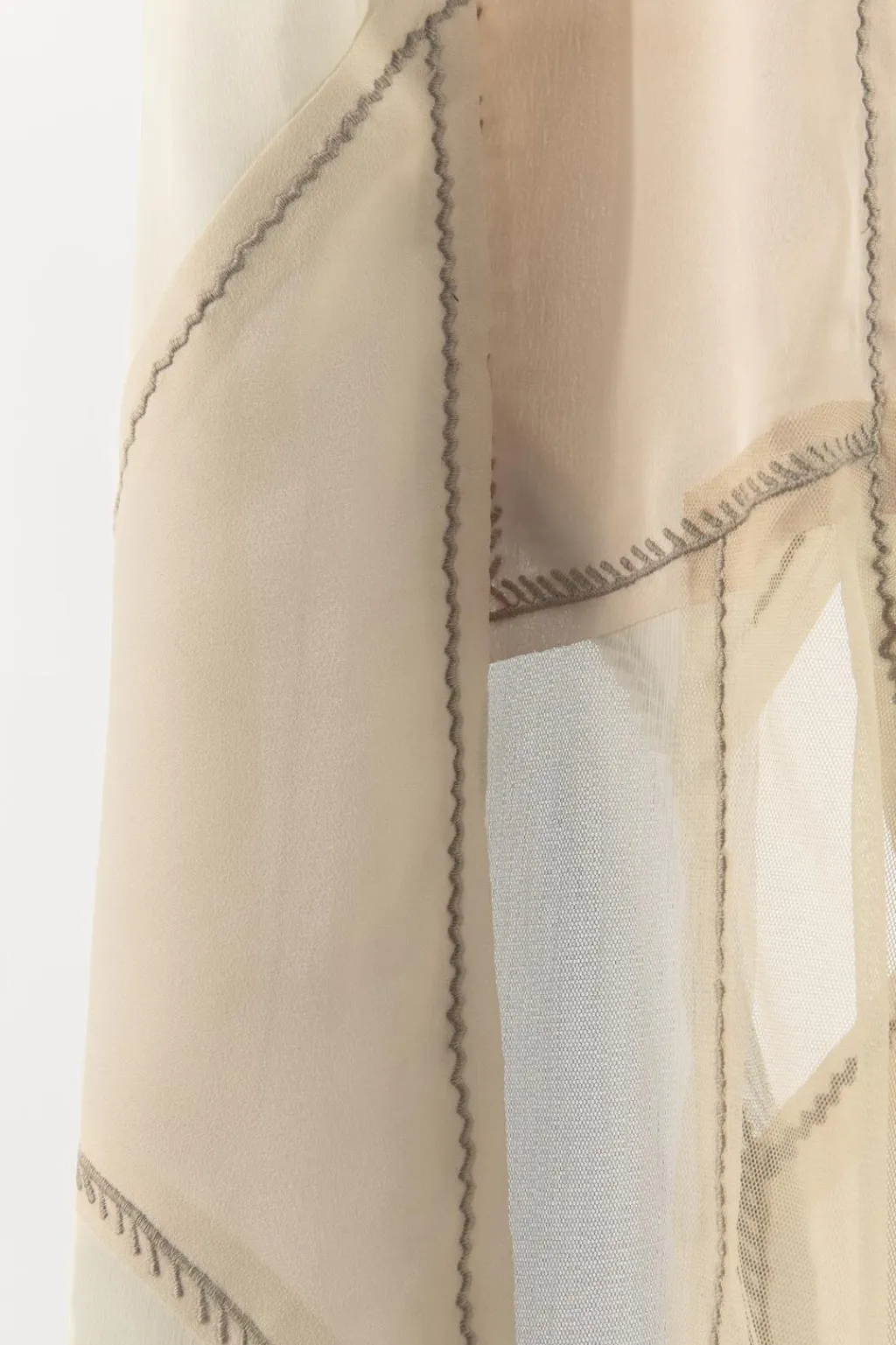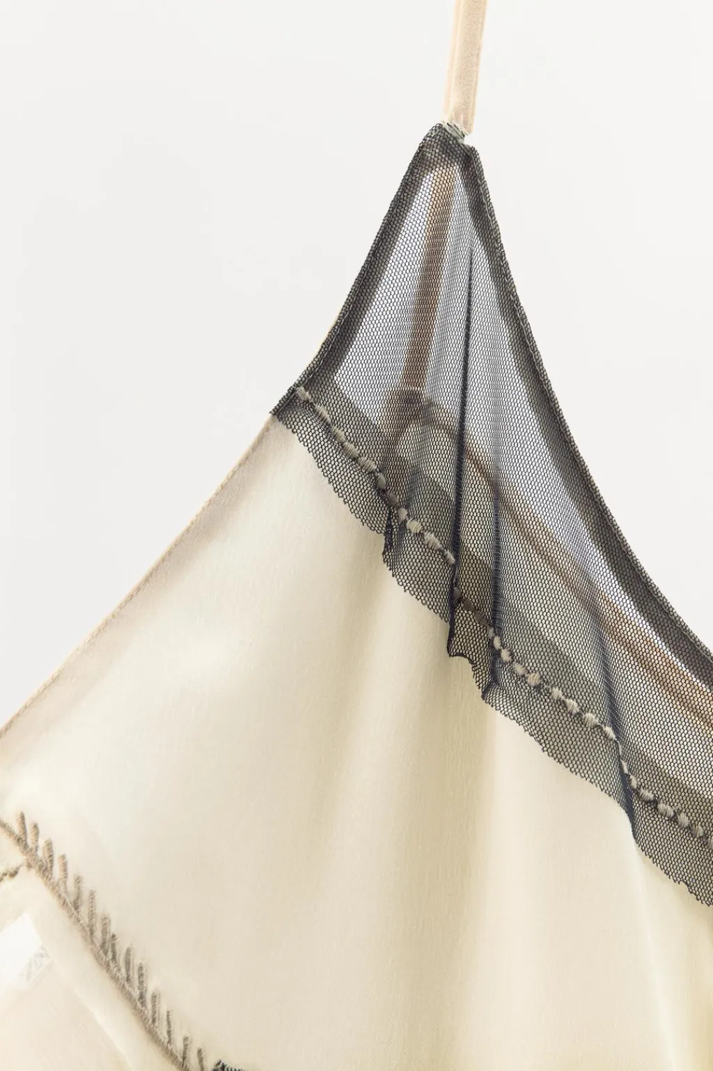 Vestido largo tipo lencero de escote pico y tirantes finos. Detalle combinación de tejidos y bordados a contraste.