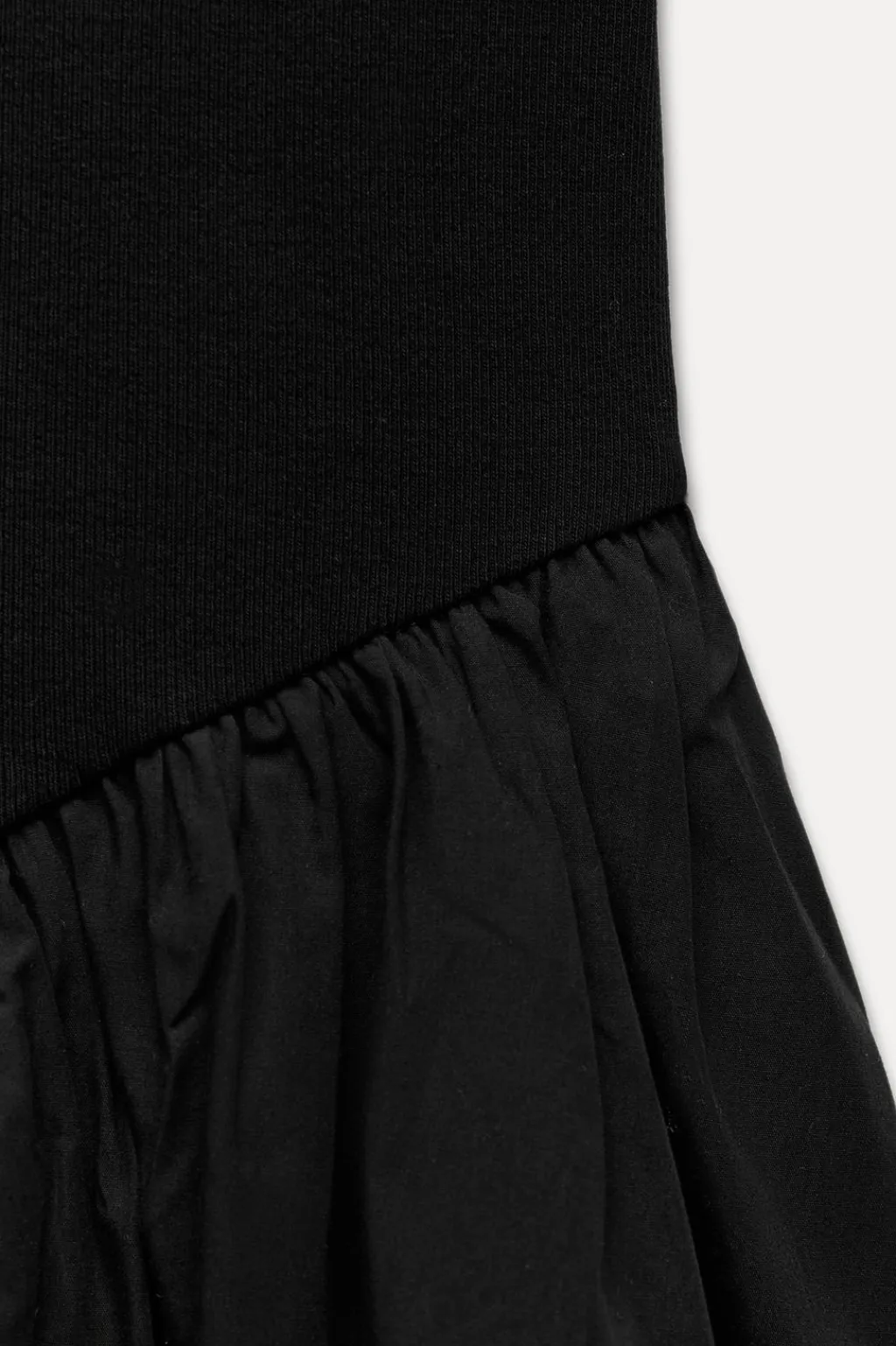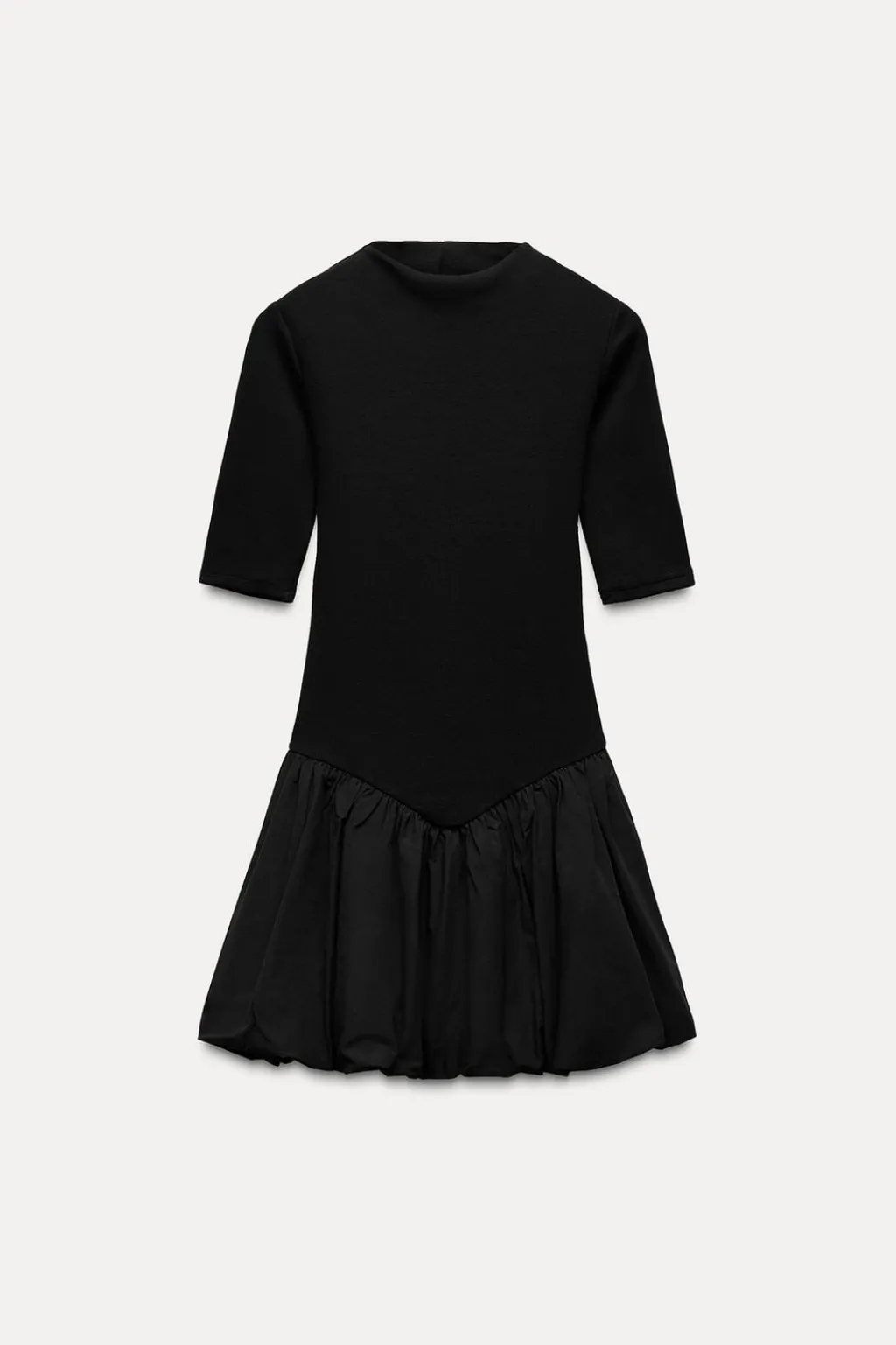 Vestido corto de cuello subido y manga corta. Bajo combinado en popelín con pliegues efecto globo.