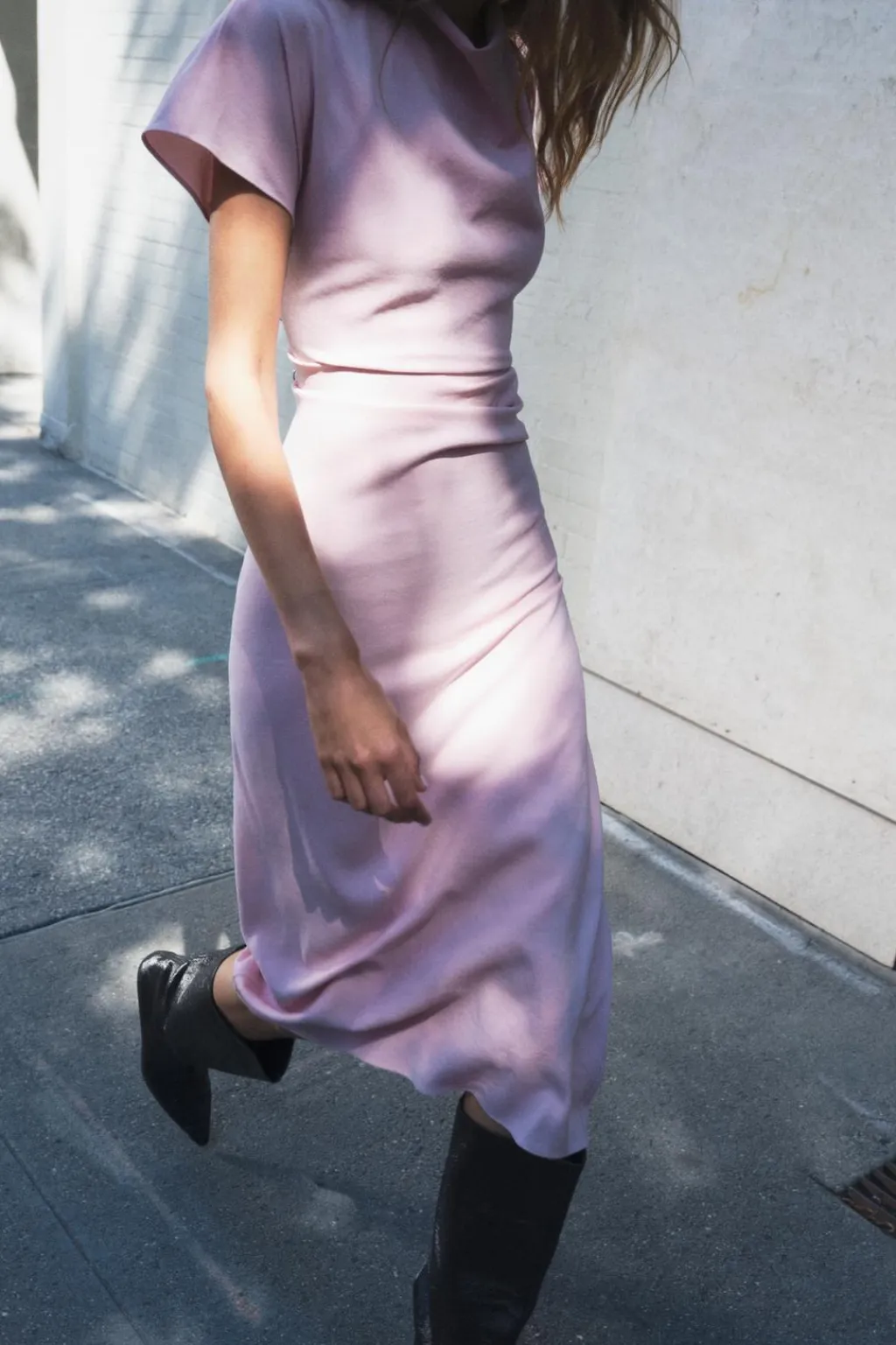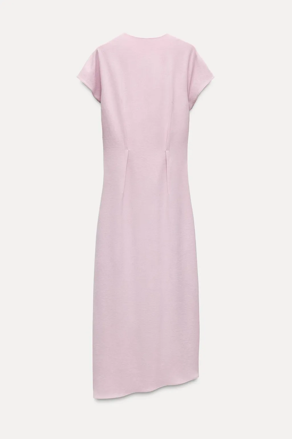 Vestido midi de cuello fluido y manga corta. Detalle de drapeado lateral. Bajo asimétrico. Cierre en espalda con cremallera oculta en costura.