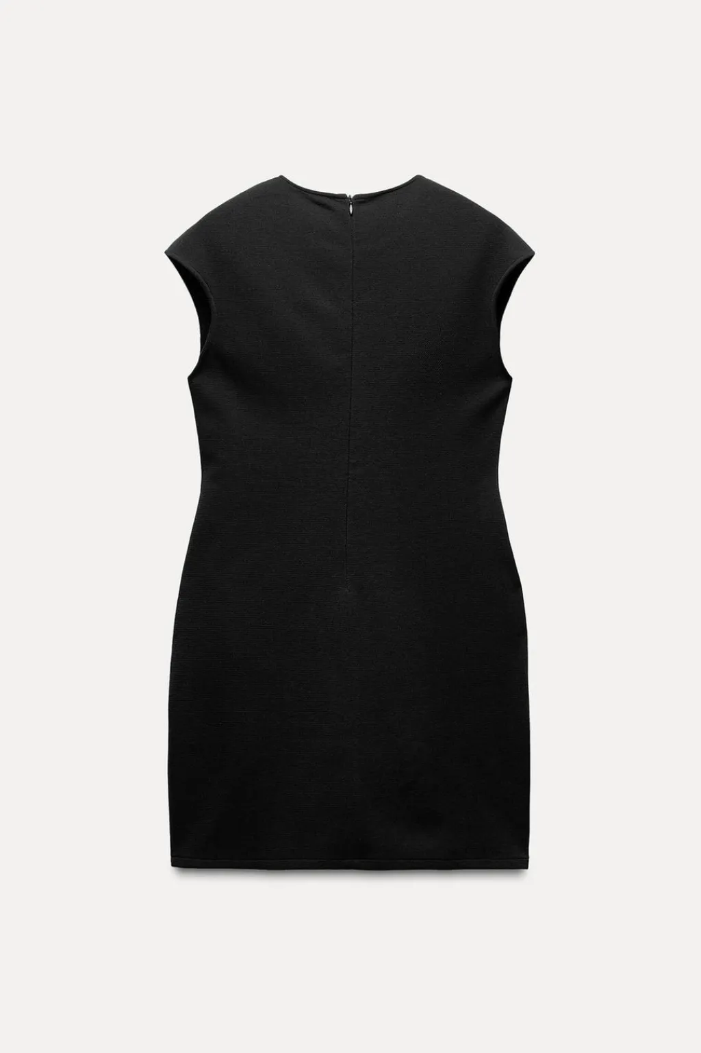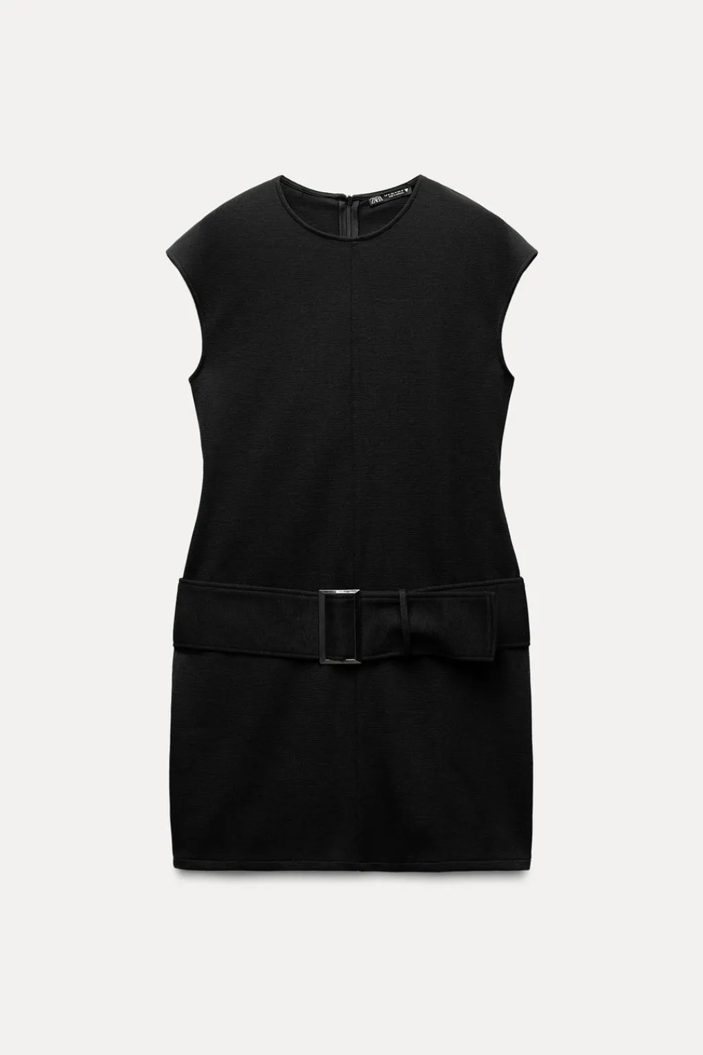 Vestido corto confeccionado en tejido de punto elástico y flexible con trama compacta, mullida y opaca. Cuello redondo y manga sisa. Detalle de cinturón en mismo tejido con hebilla cuadrada. Cierre en espalda con cremallera oculta en costura.