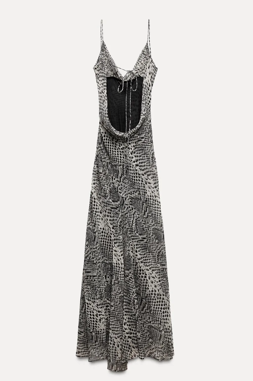 Vestido largo de escote fluido y tirantes finos. Espalda descubierta con tejido drapeado y lazada. Forro interior combinado.