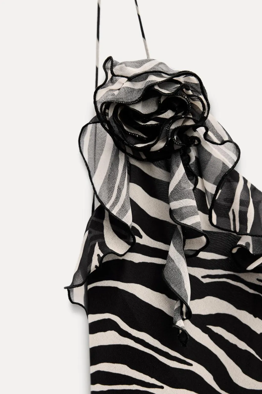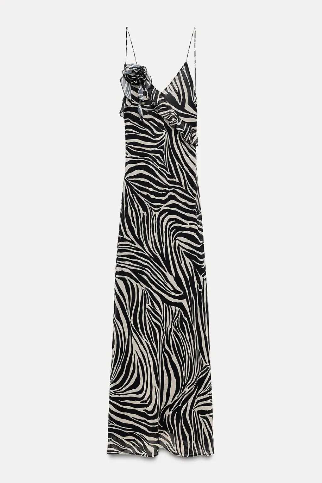 Vestido largo de escote pico y tirantes finos. Espalda descubierta. Detalle de flor en relieve y volantes en mismo tejido. Forro interior. Cierre lateral con cremallera oculta en costura.