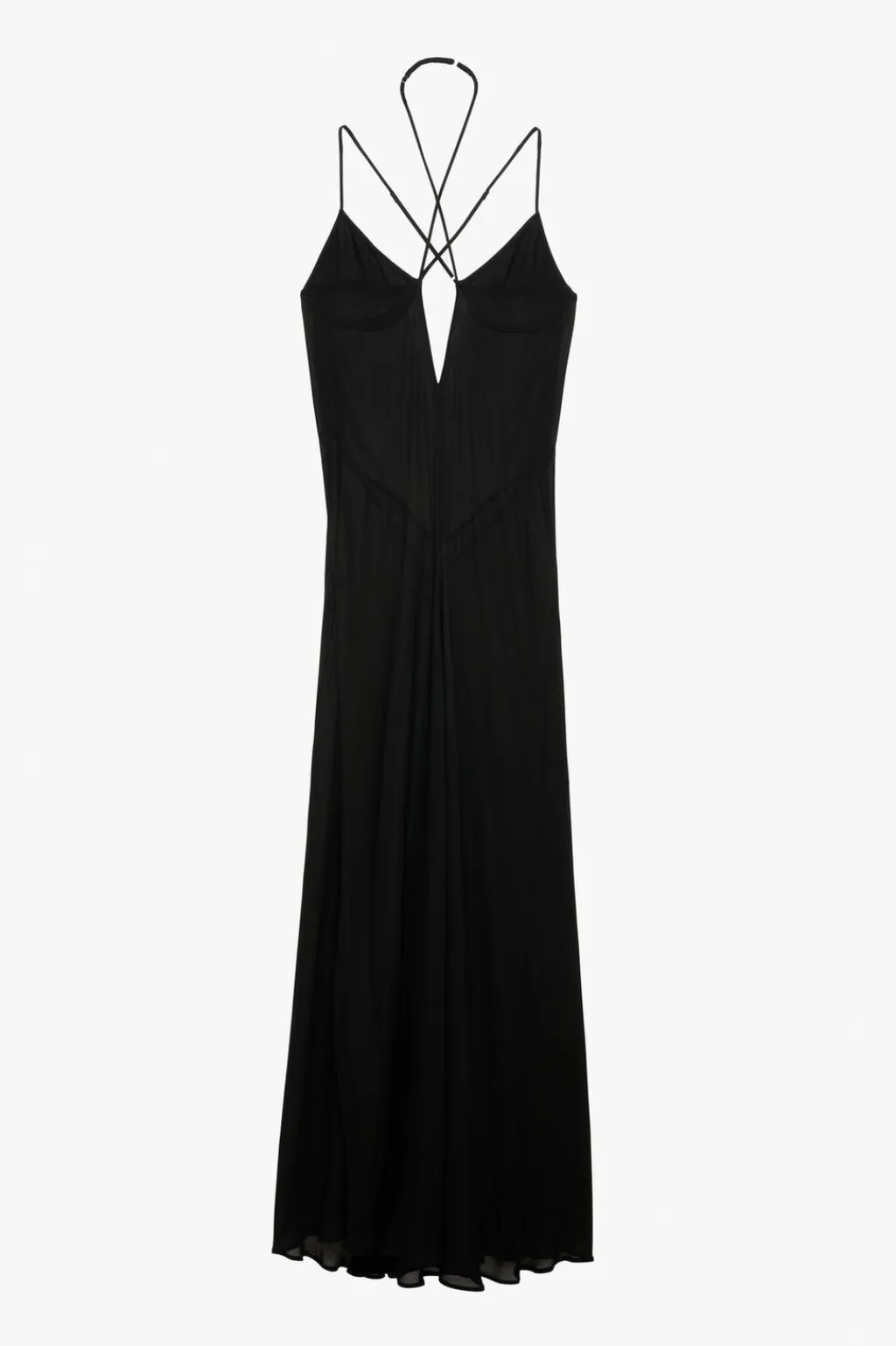 Vestido largo confeccionado en hilatura de viscosa. Escote pico y tirantes finos ajustables cruzados en espalda. Bajo acabado en línea evasé.