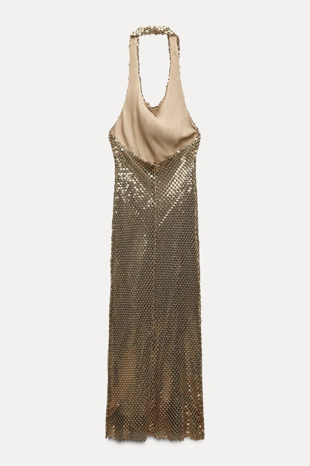 Vestido de cuello halter con escote fluido y espalda descubierta. Forro interior.