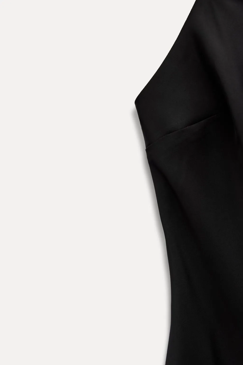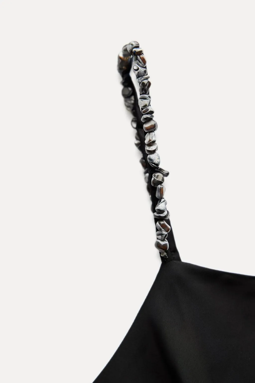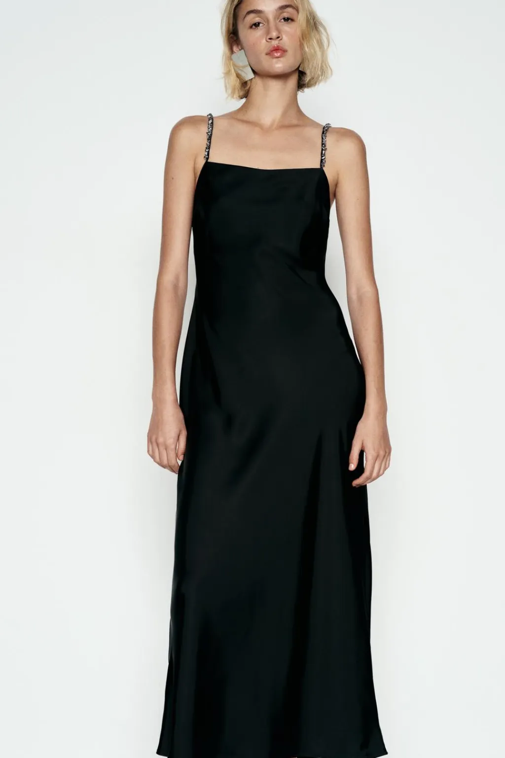 Vestido midi satinado de escote recto y tirantes finos con aplicación de abalorios.