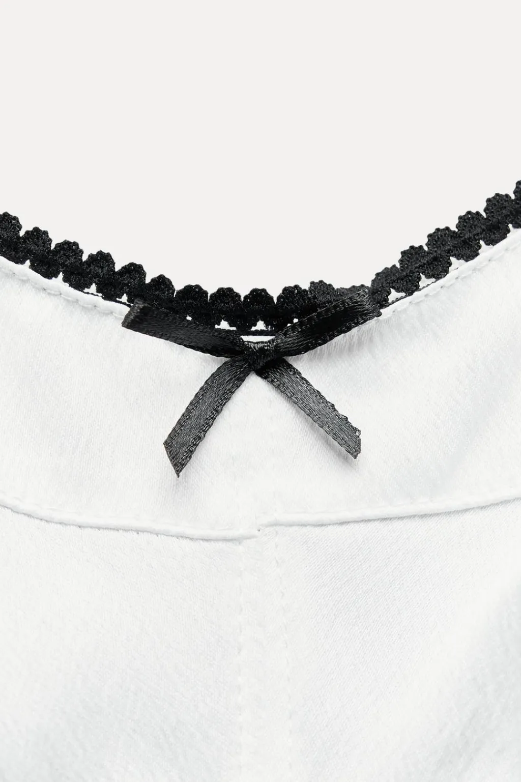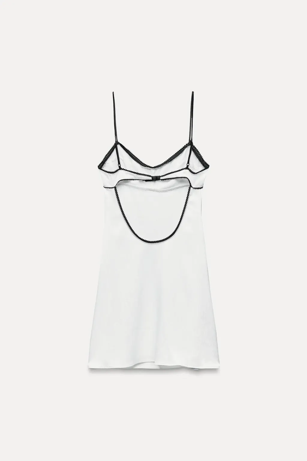 Vestido corto de escote pico y tirantes finos ajustables. Acabados en puntilla y detalle de lazo combinados a contraste. Espalda con abertura y cierre con gancho metálico.