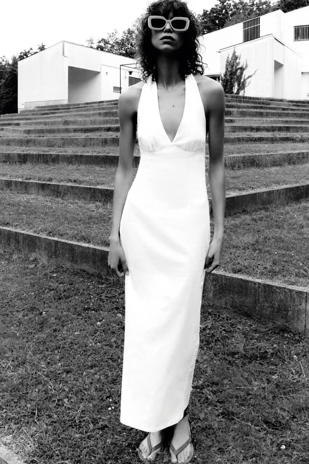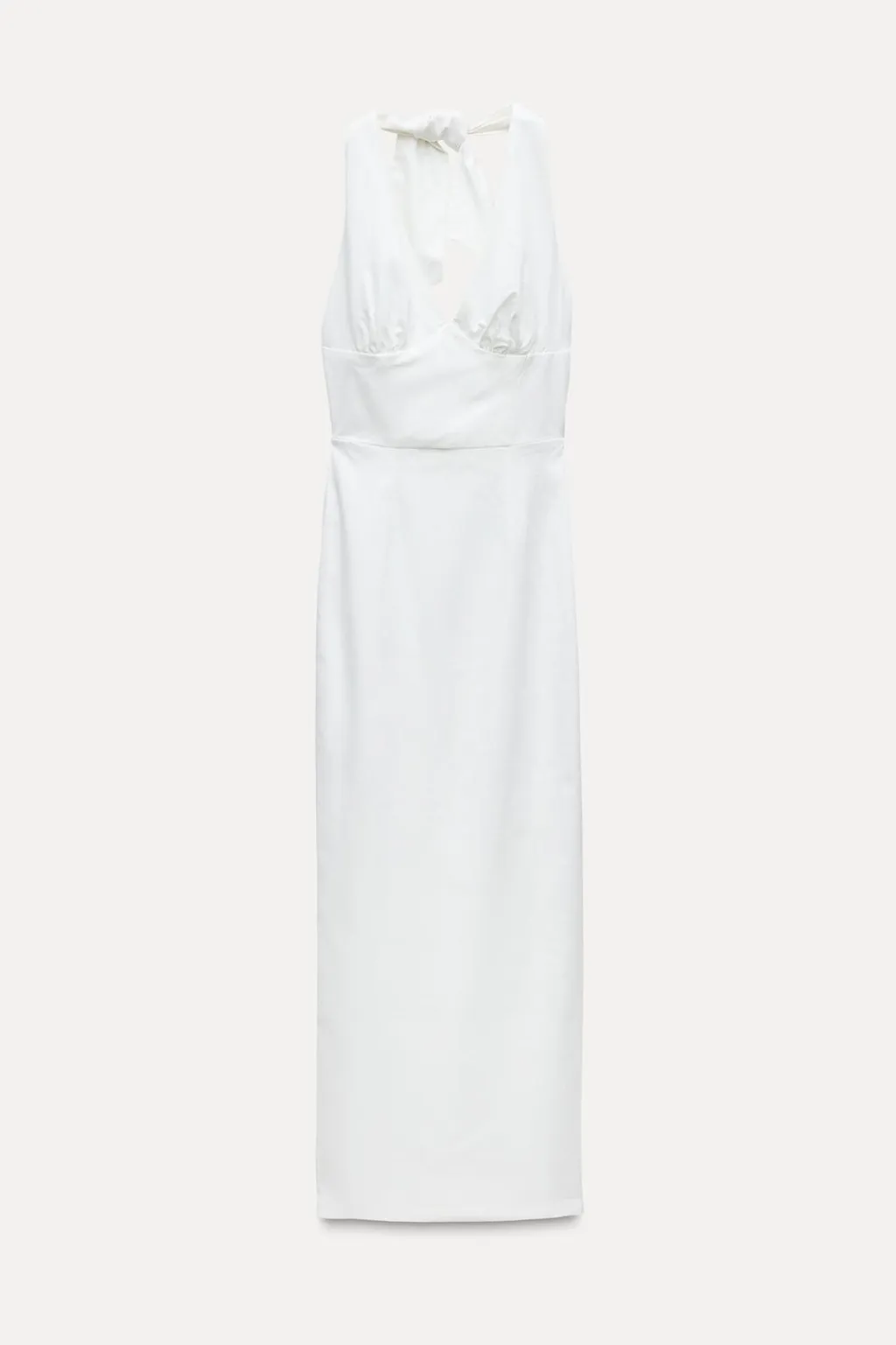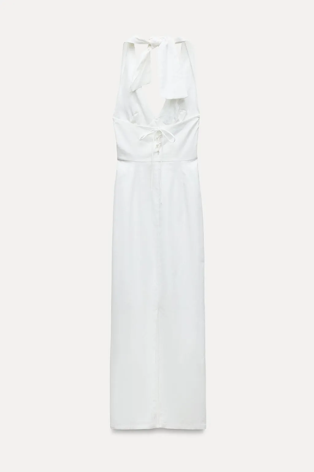 Vestido confeccionado con lino. Escote pico con tiras anudadas en el cuello. Cintura entallada con cordón en espalda. Bajo con abertura trasera. Cierre lateral con cremallera oculta en costura.