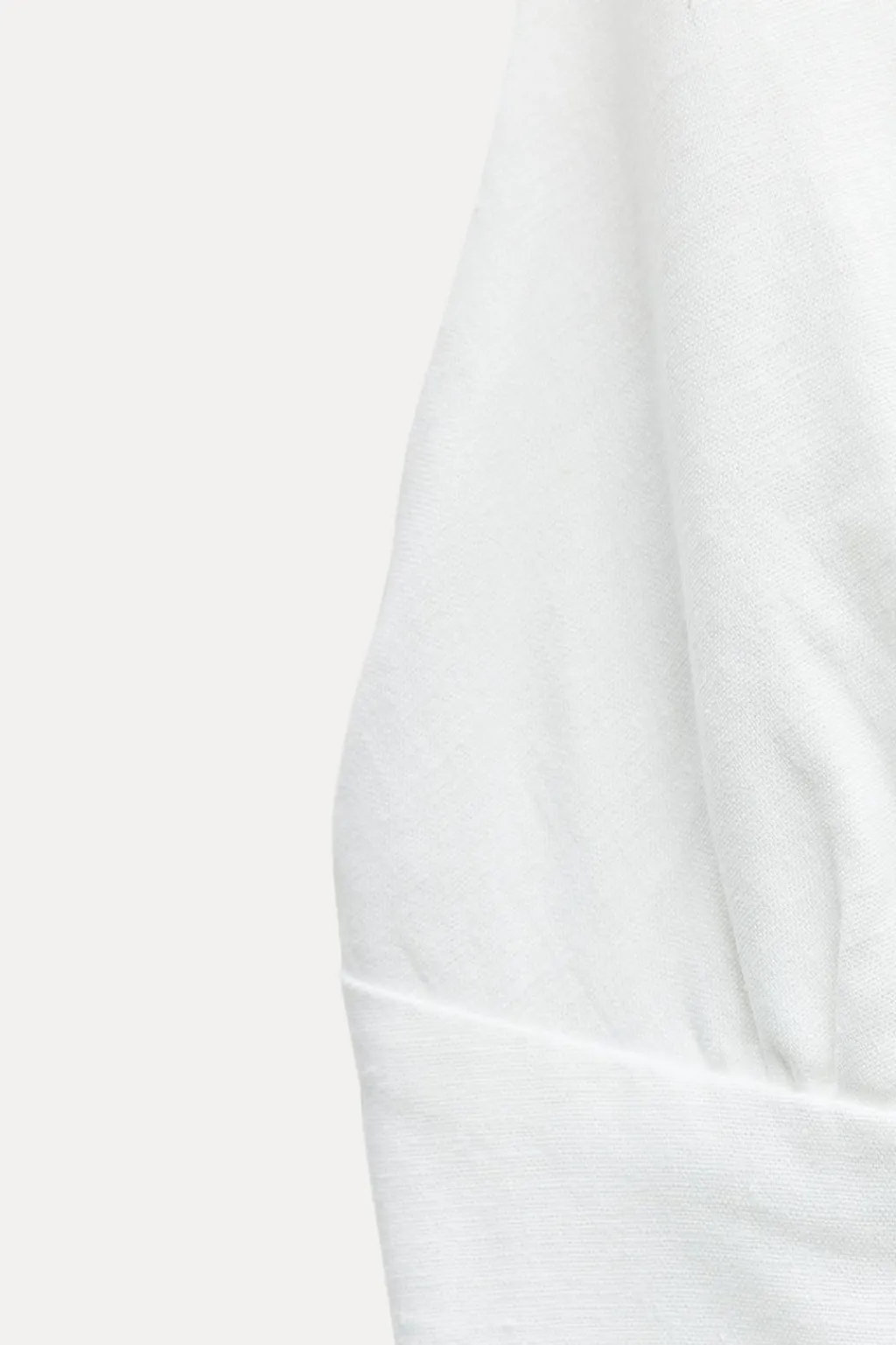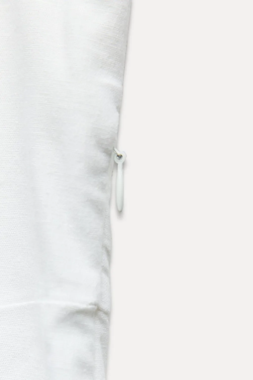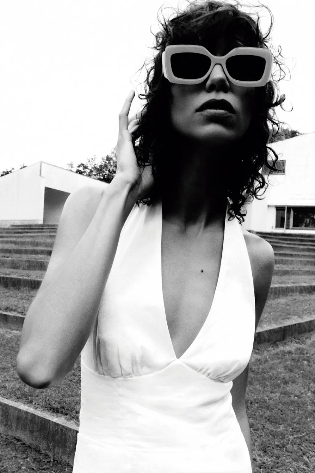 Vestido confeccionado con lino. Escote pico con tiras anudadas en el cuello. Cintura entallada con cordón en espalda. Bajo con abertura trasera. Cierre lateral con cremallera oculta en costura.
