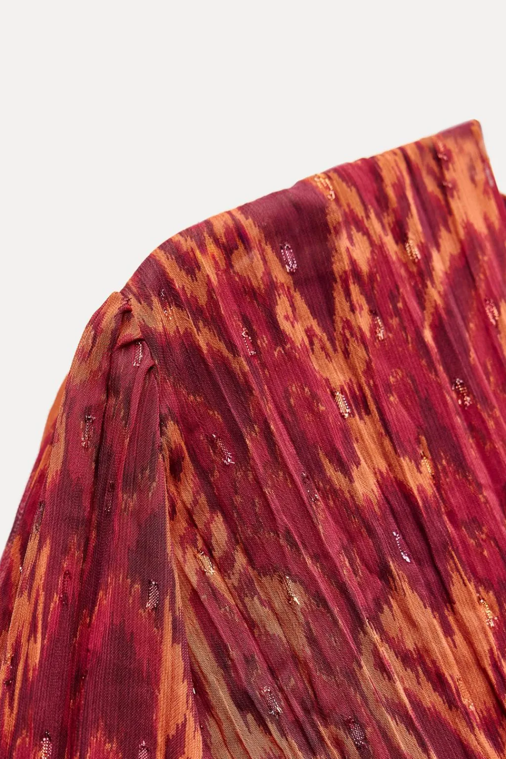 Vestido de escote pico cruzado y manga larga. Detalle de frunces en cintura y tejido con hilo metalizado.