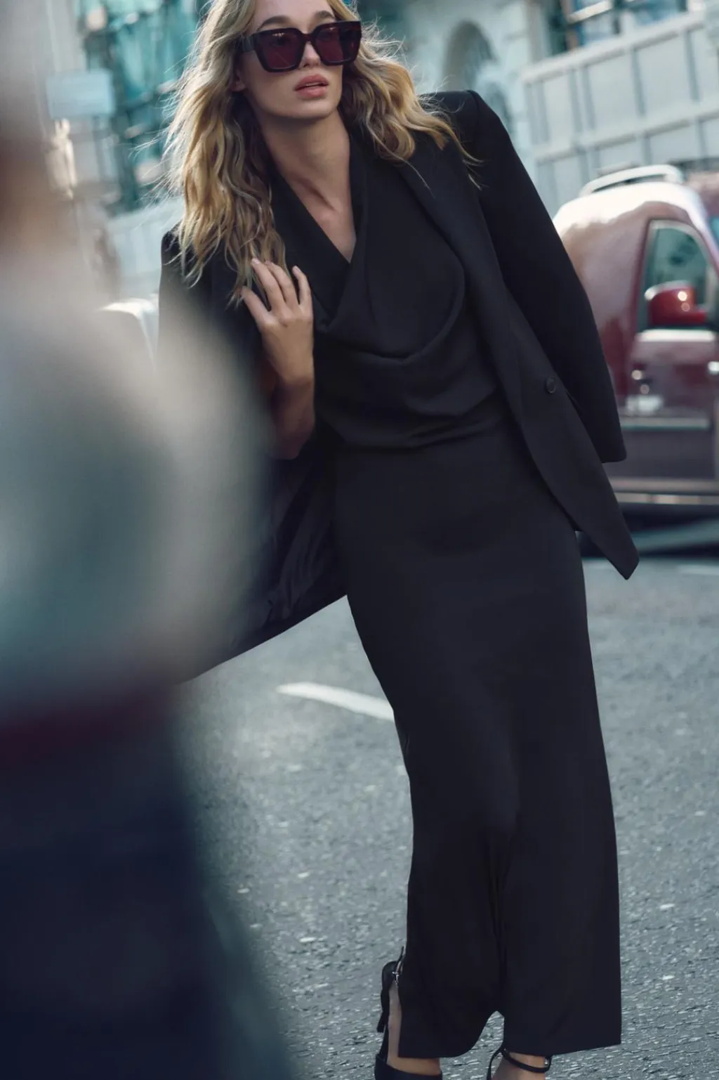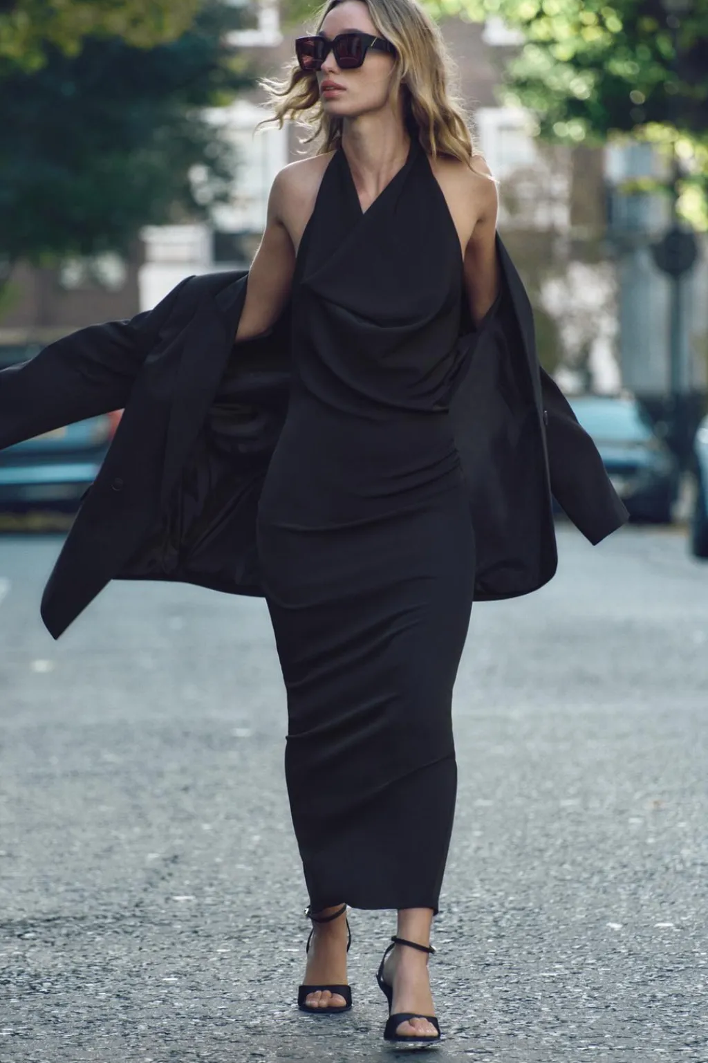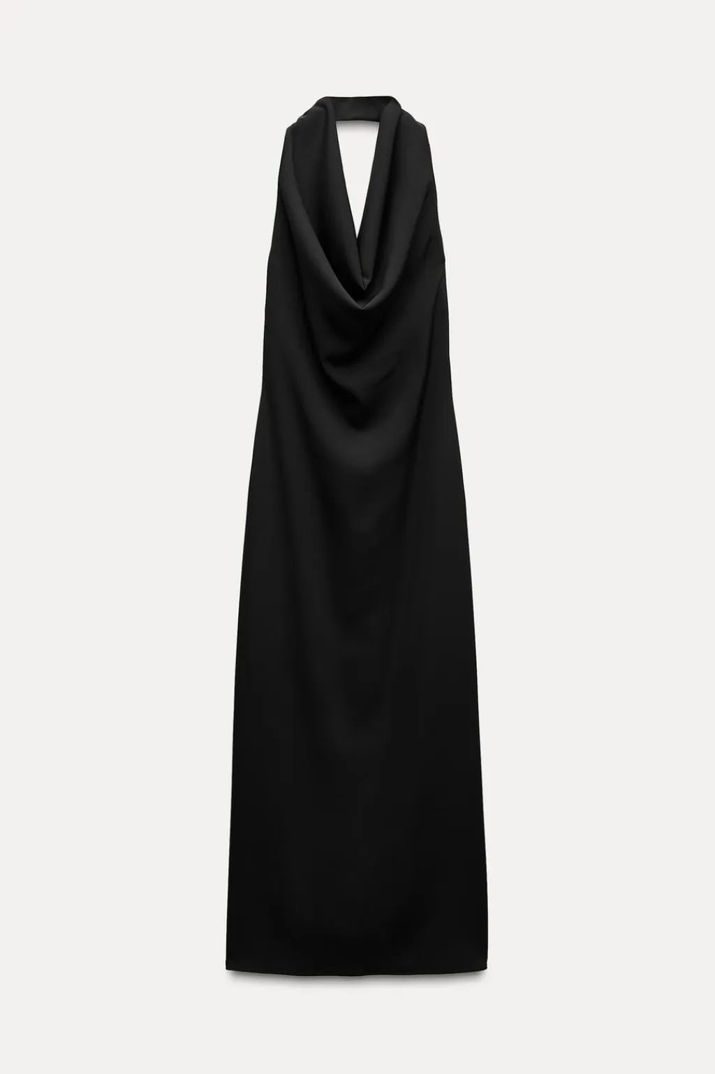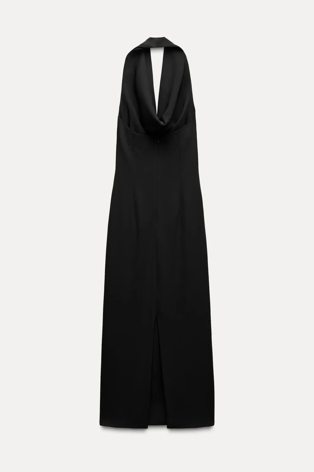 Vestido de cuello halter con escote fluido y espalda descubierta.