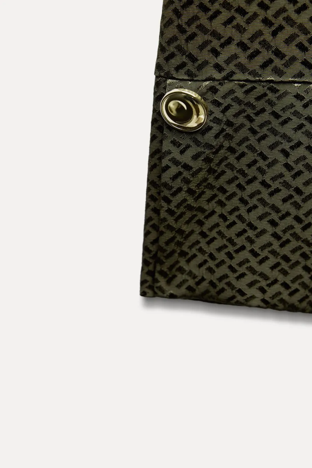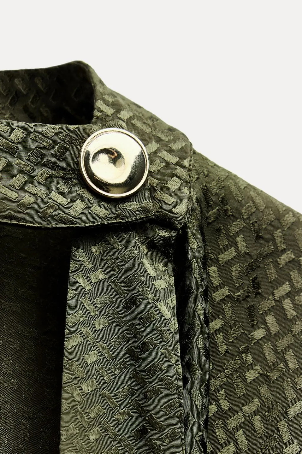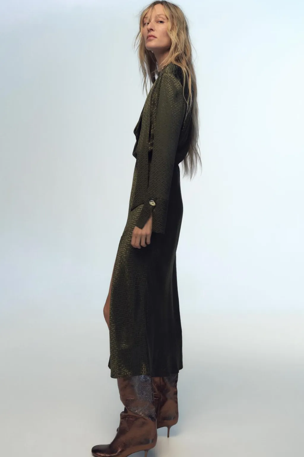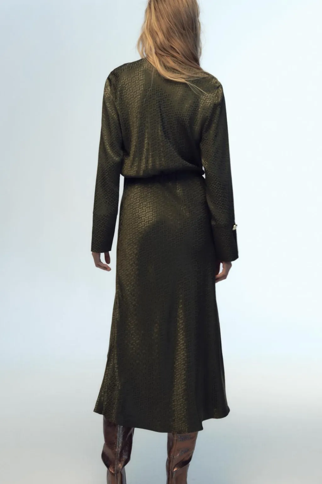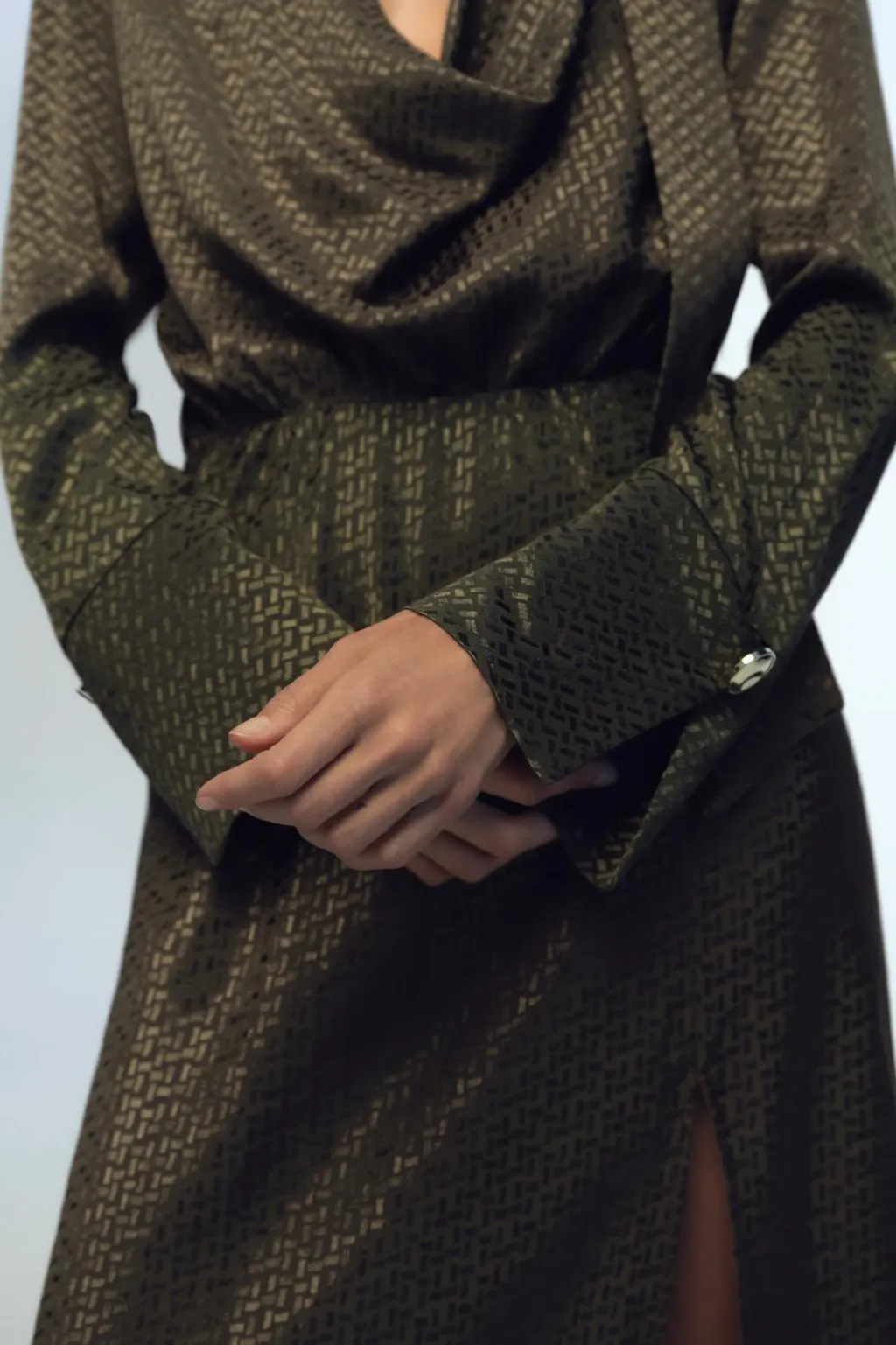 Vestido de cuello subido con botón dorado. Escote fluido y manga larga. Cintura elástica. Bajo con abertura frontal.
