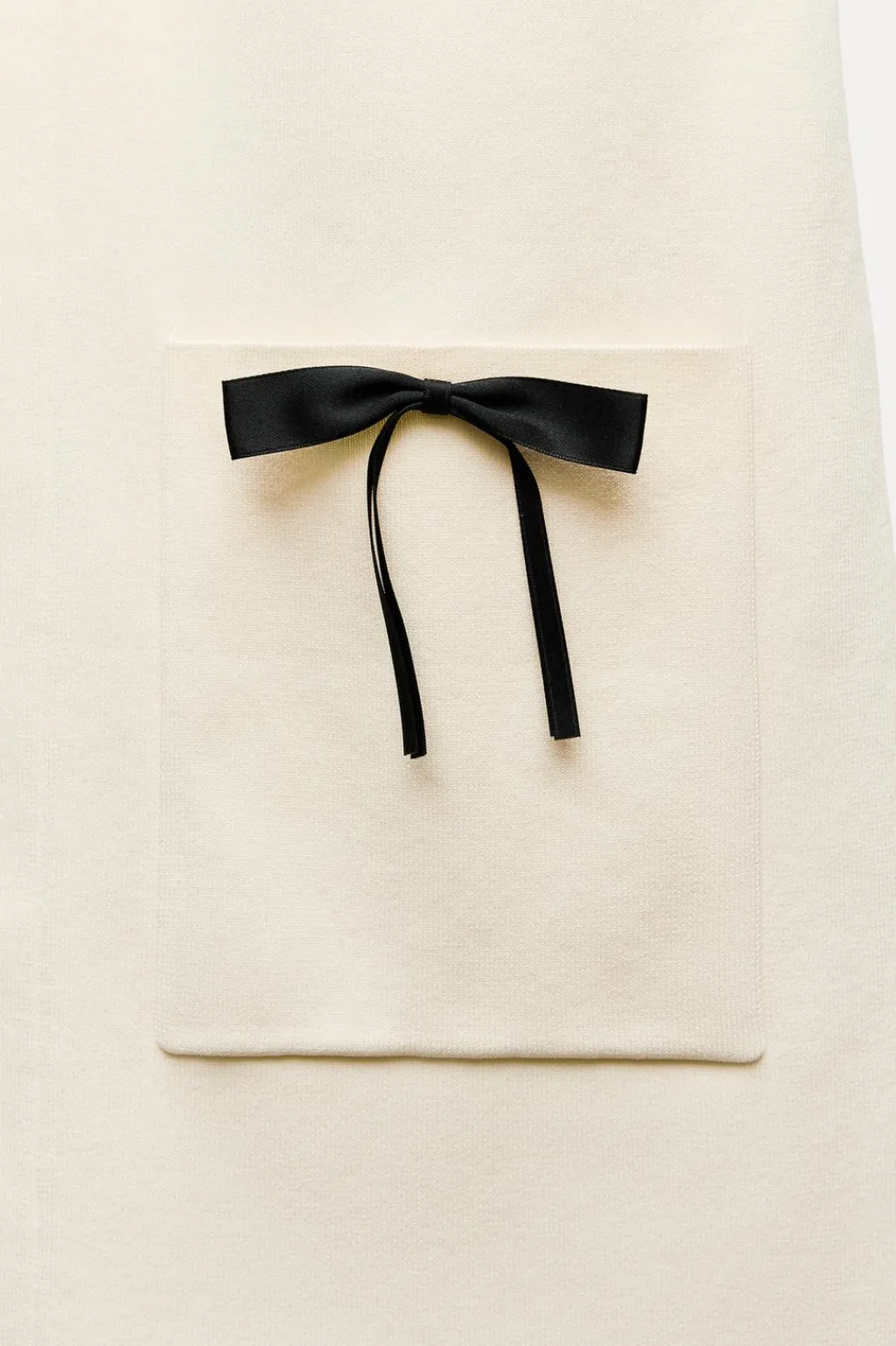 Vestido de cuello redondo y manga sisa. Bolsillos delanteros de plastrón. Detalle de lazos delanteros combinados a contraste.