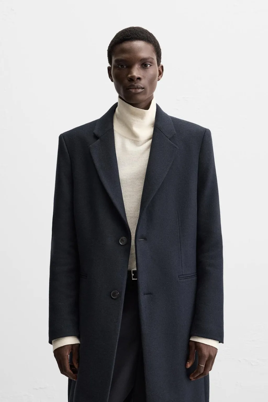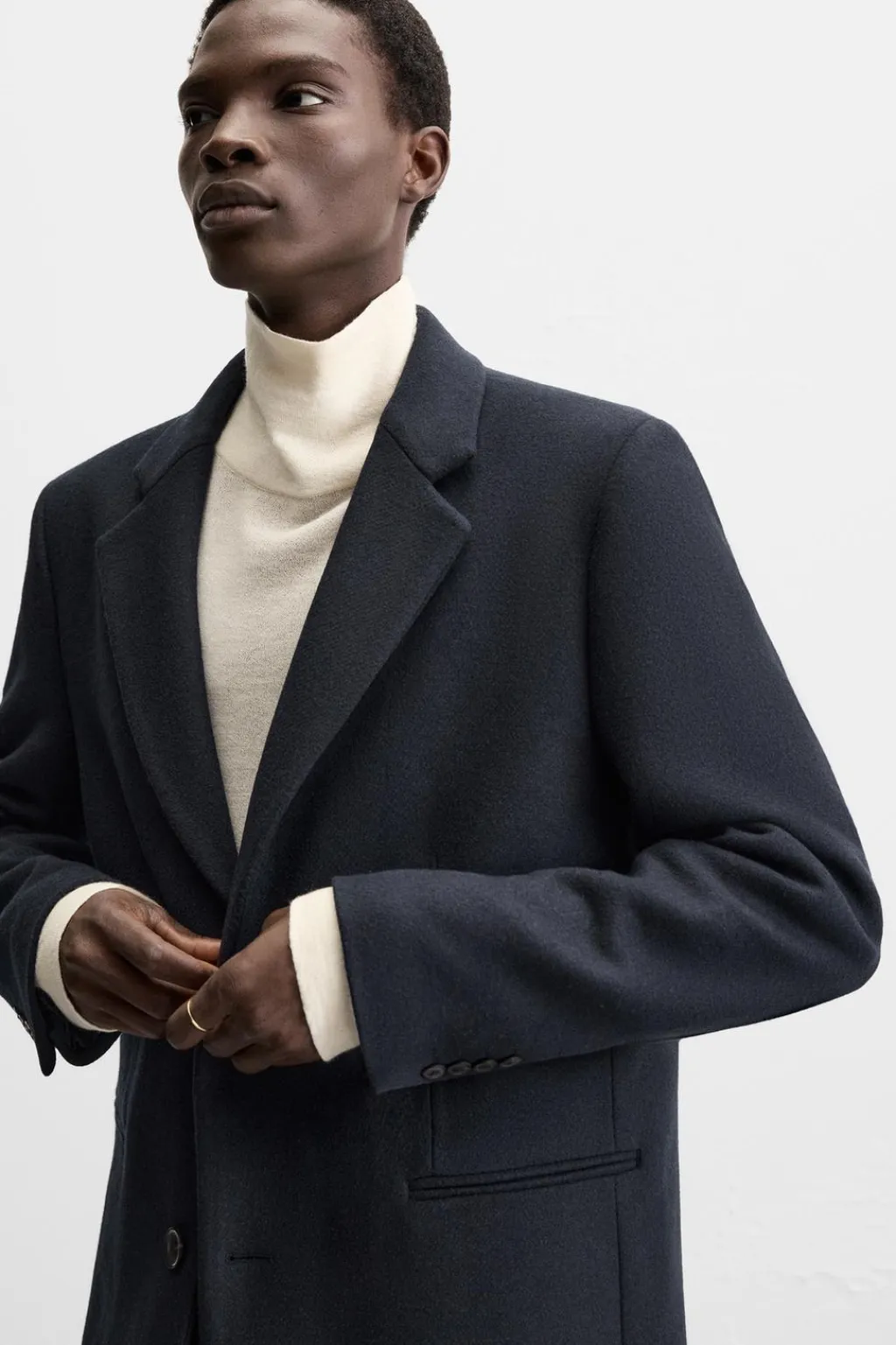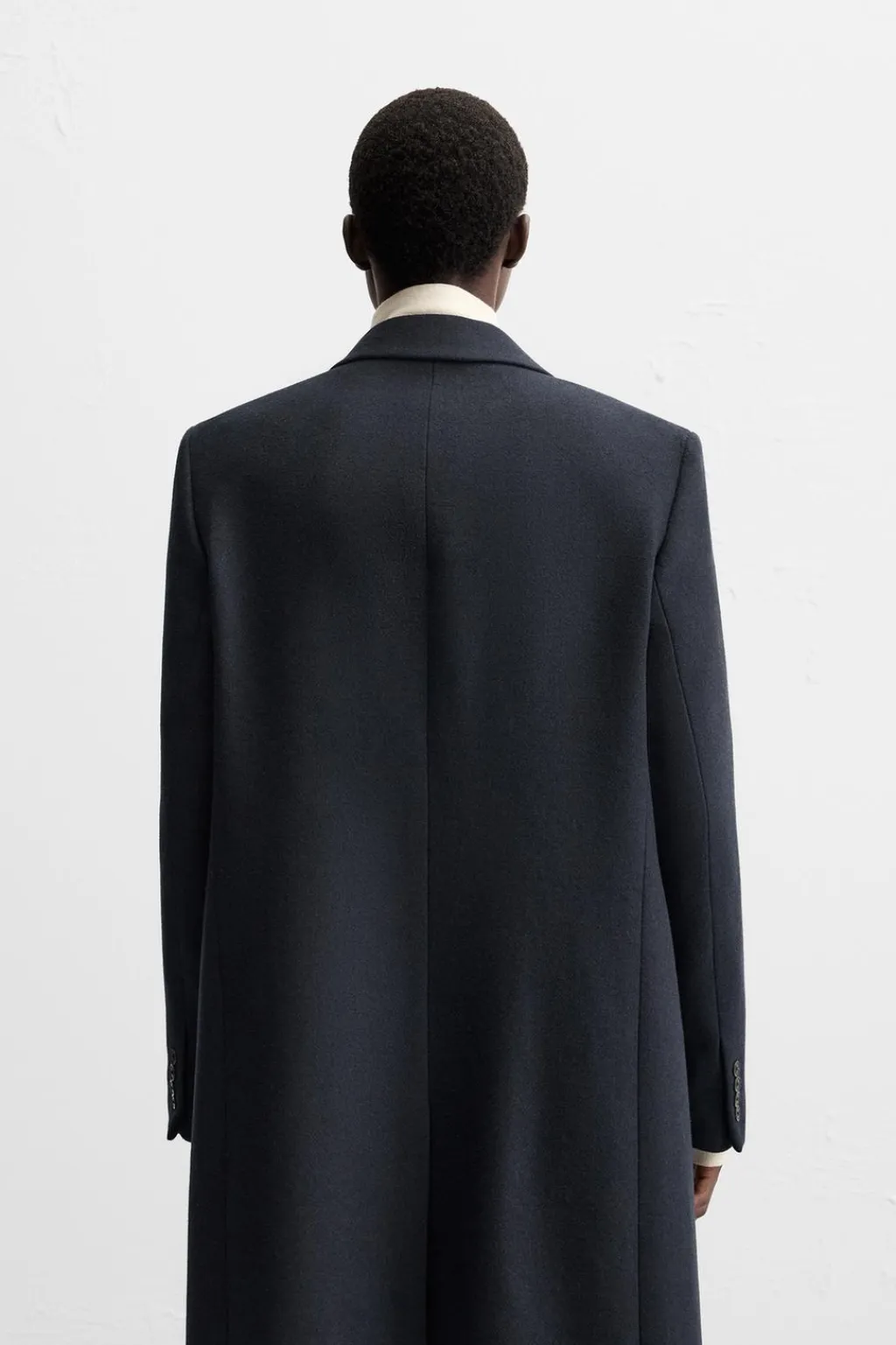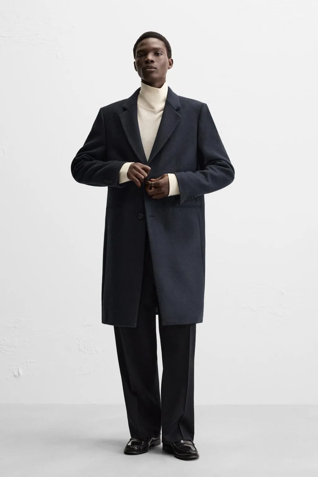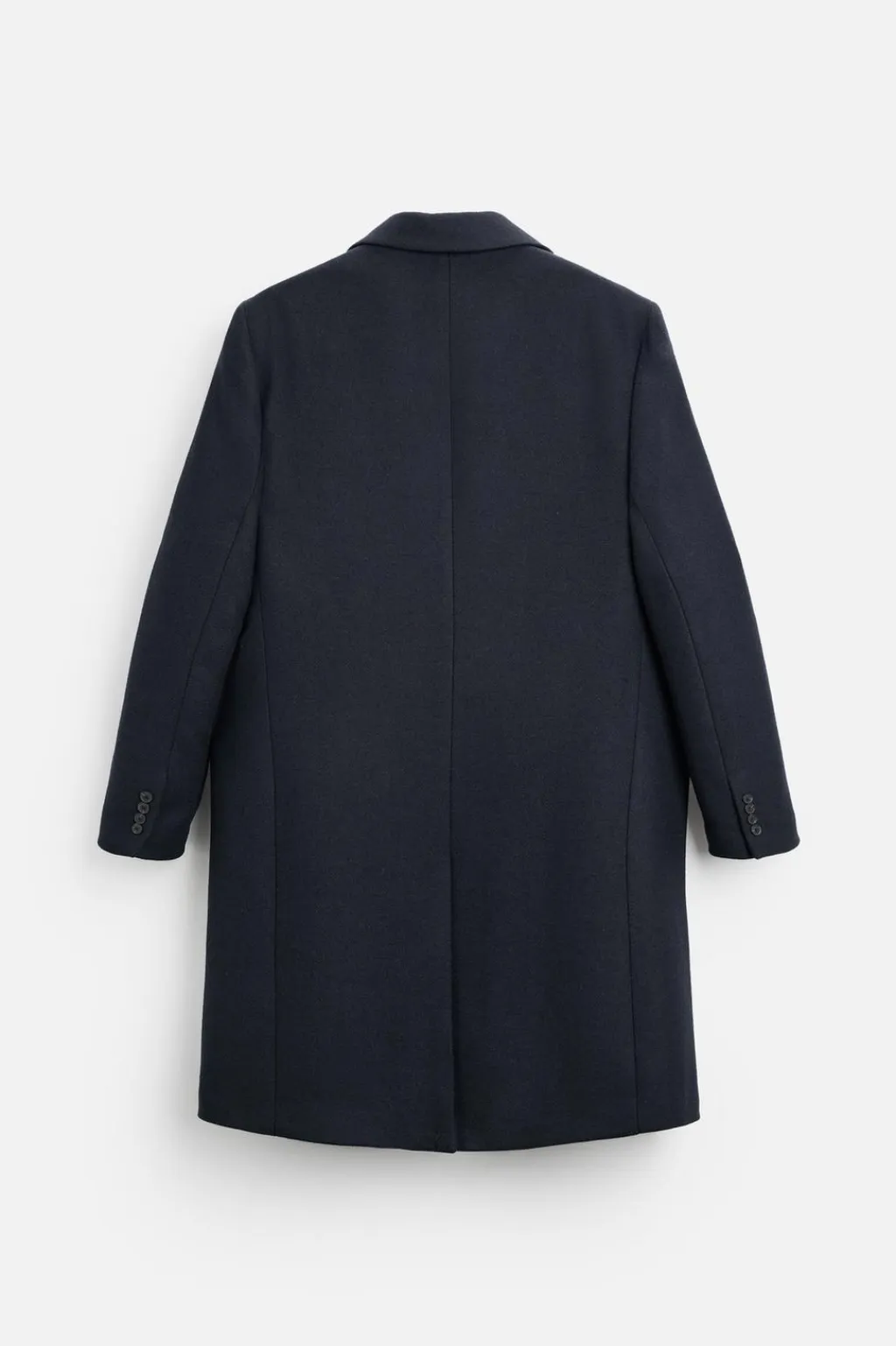 Abrigo regular fit confeccionado en tejido con lana. Cuello con solapas de muesca y manga larga acabada en puño con botones. Bolsillos de vivo en cadera y detalle de bolsillo interior. Bajo con abertura en centro espalda. Cierre frontal de botonadura.