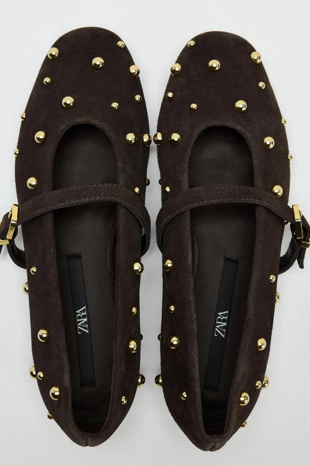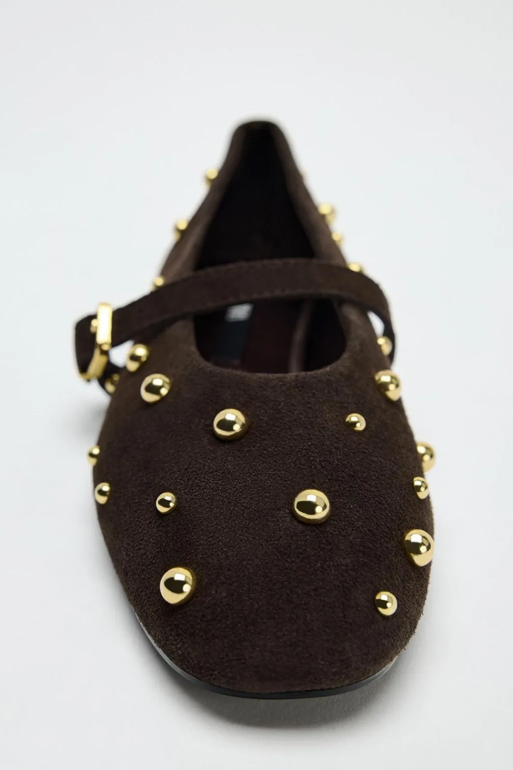 Zapato tipo bailarina en serraje. Detalle de tachas en el cuerpo. Tira con hebilla ajustable. Acabado en punta redonda.