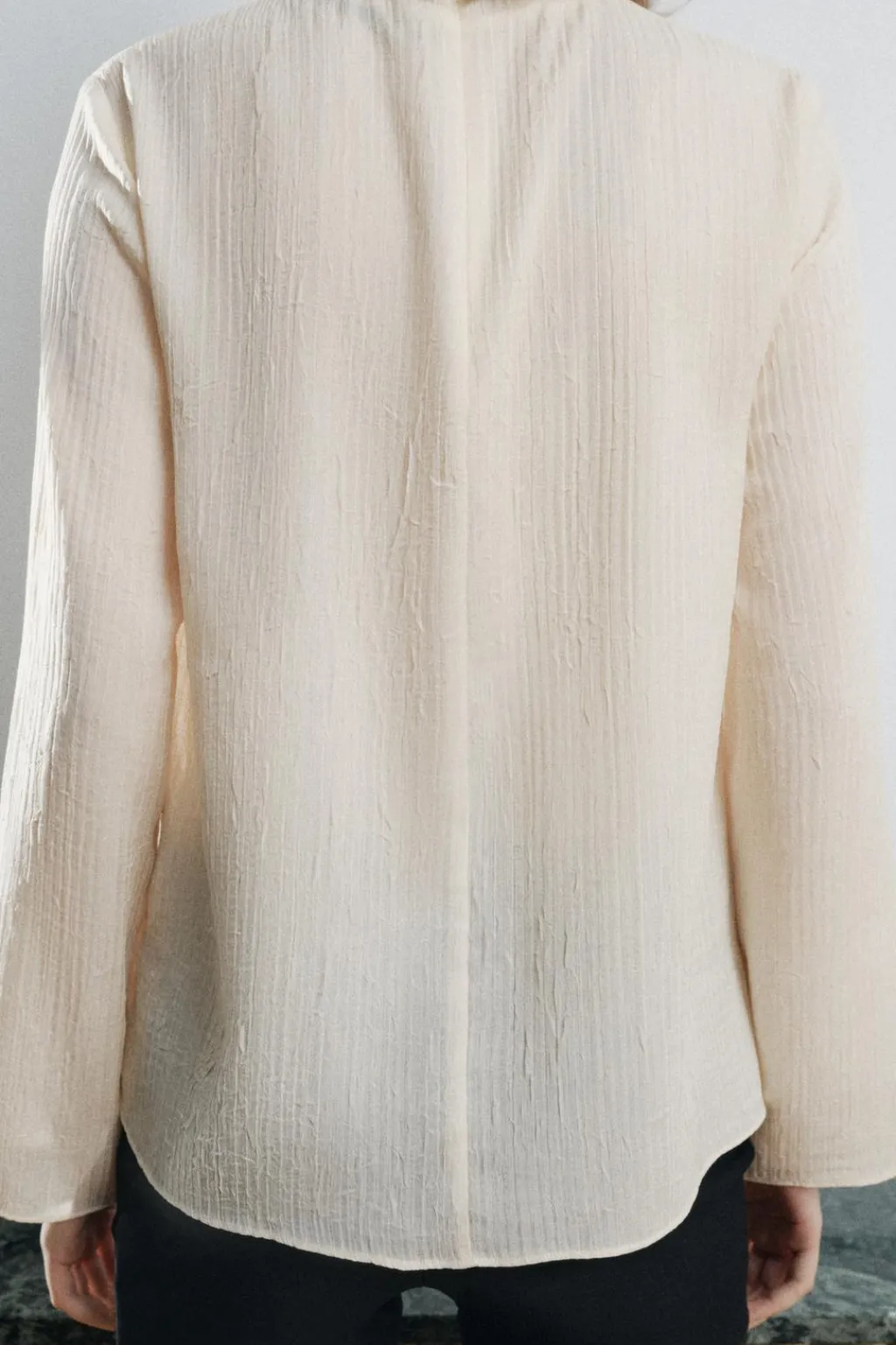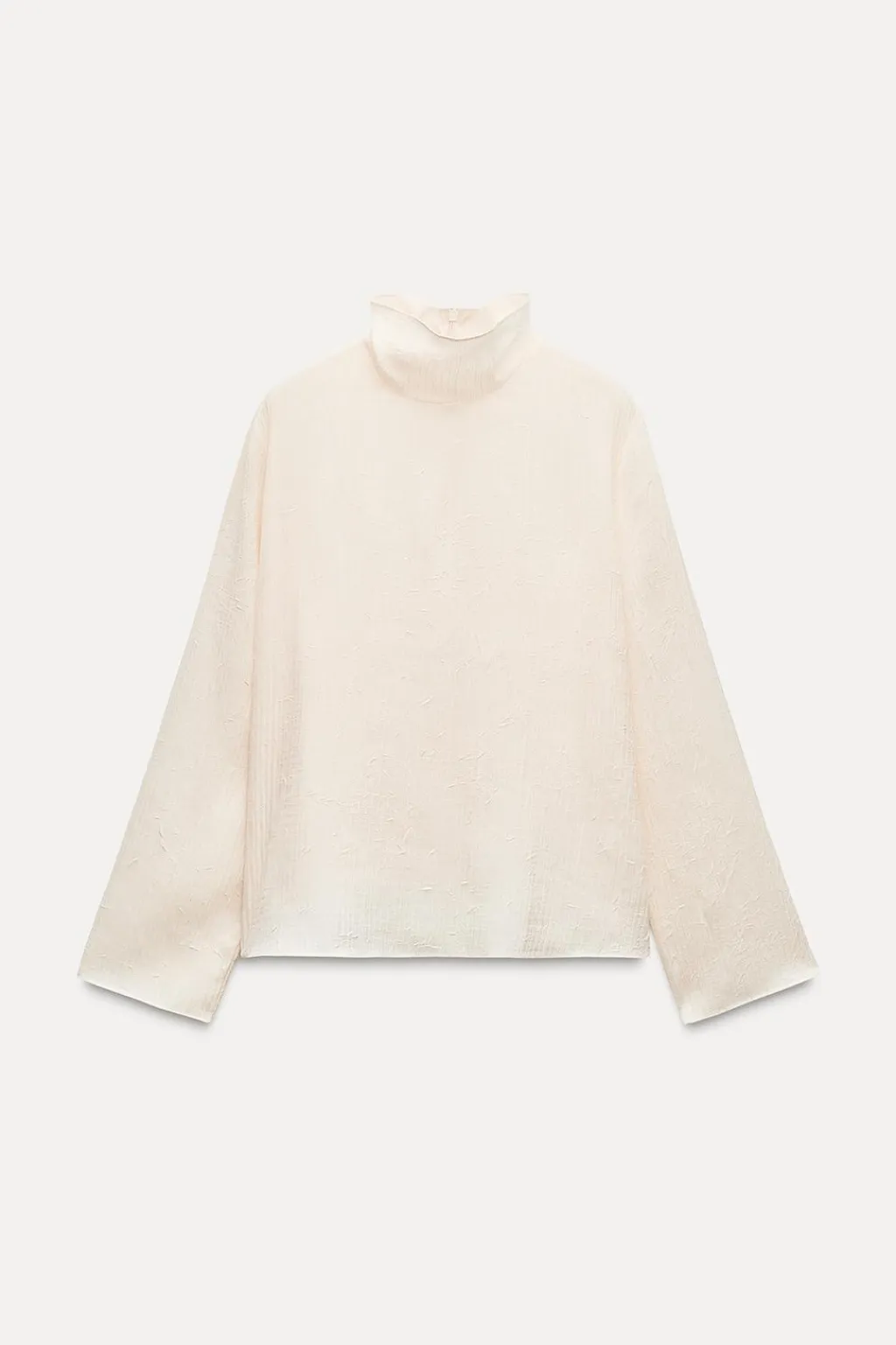 Blusa semitransparente confeccionada en tejido efecto arrugado. Cuello subido y manga larga. Cierre en espalda con cremallera oculta en costura.