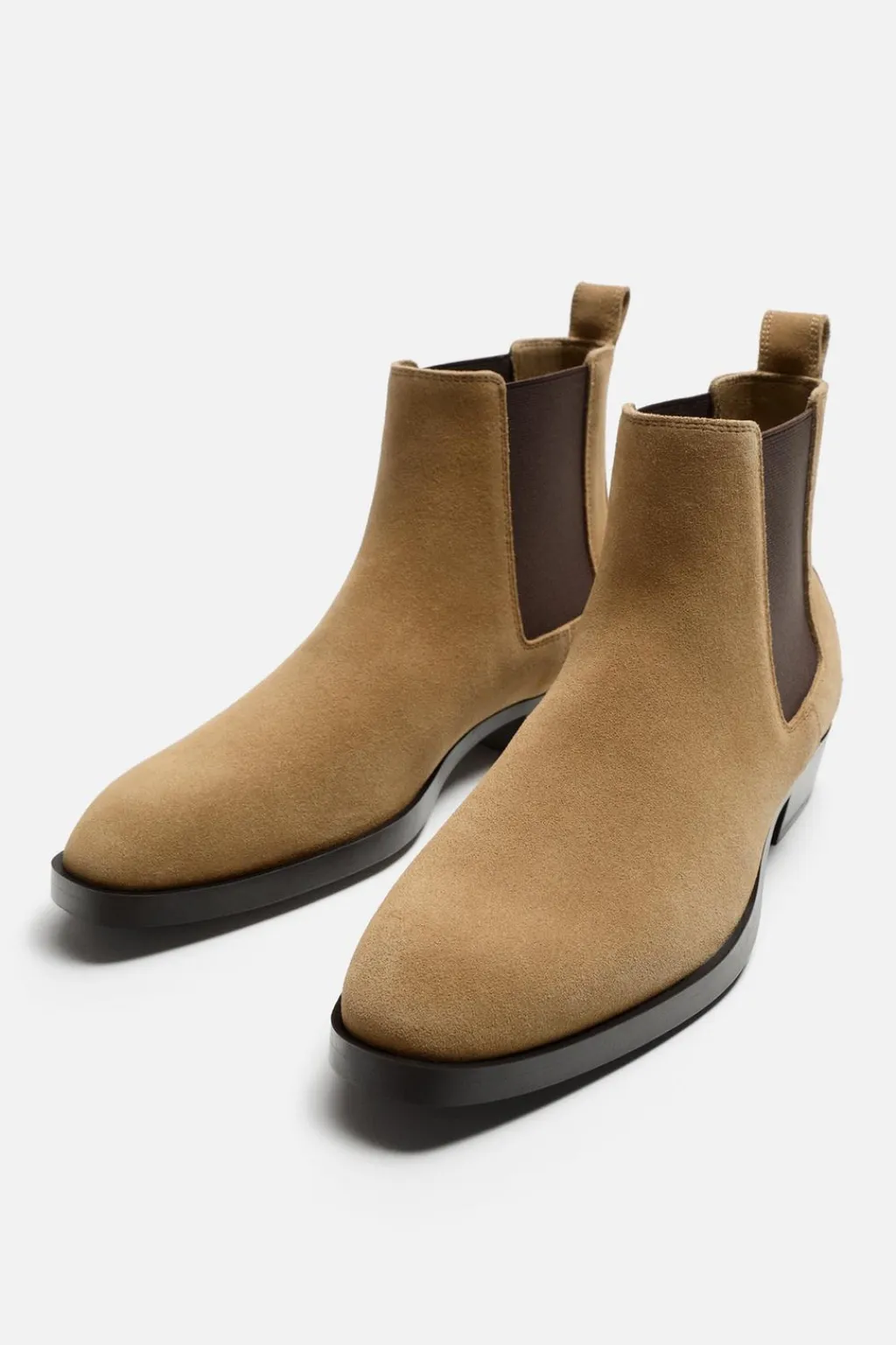 Bota estilo chelsea. Parte superior fabricada en piel con acabado serraje. Cuenta con dos piezas elásticas laterales y tirador trasero para facilitar el calce. Horma en punta