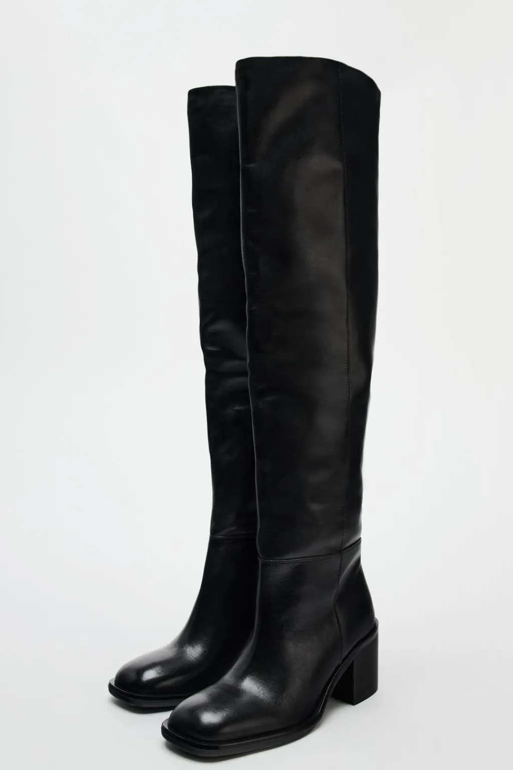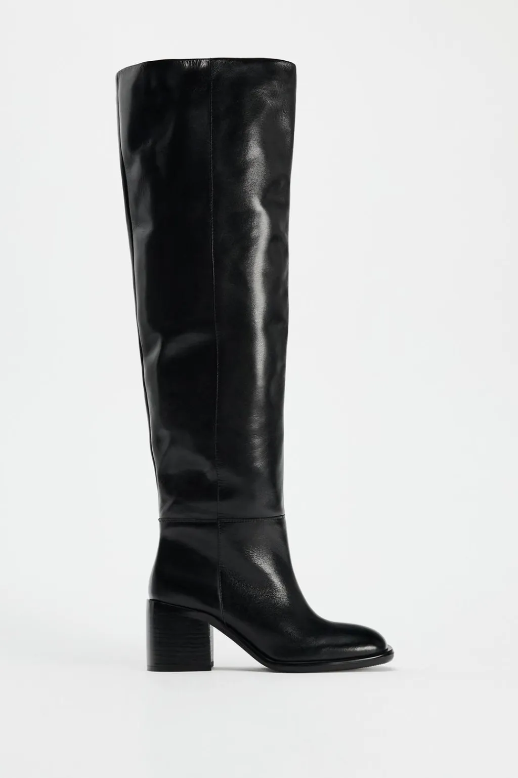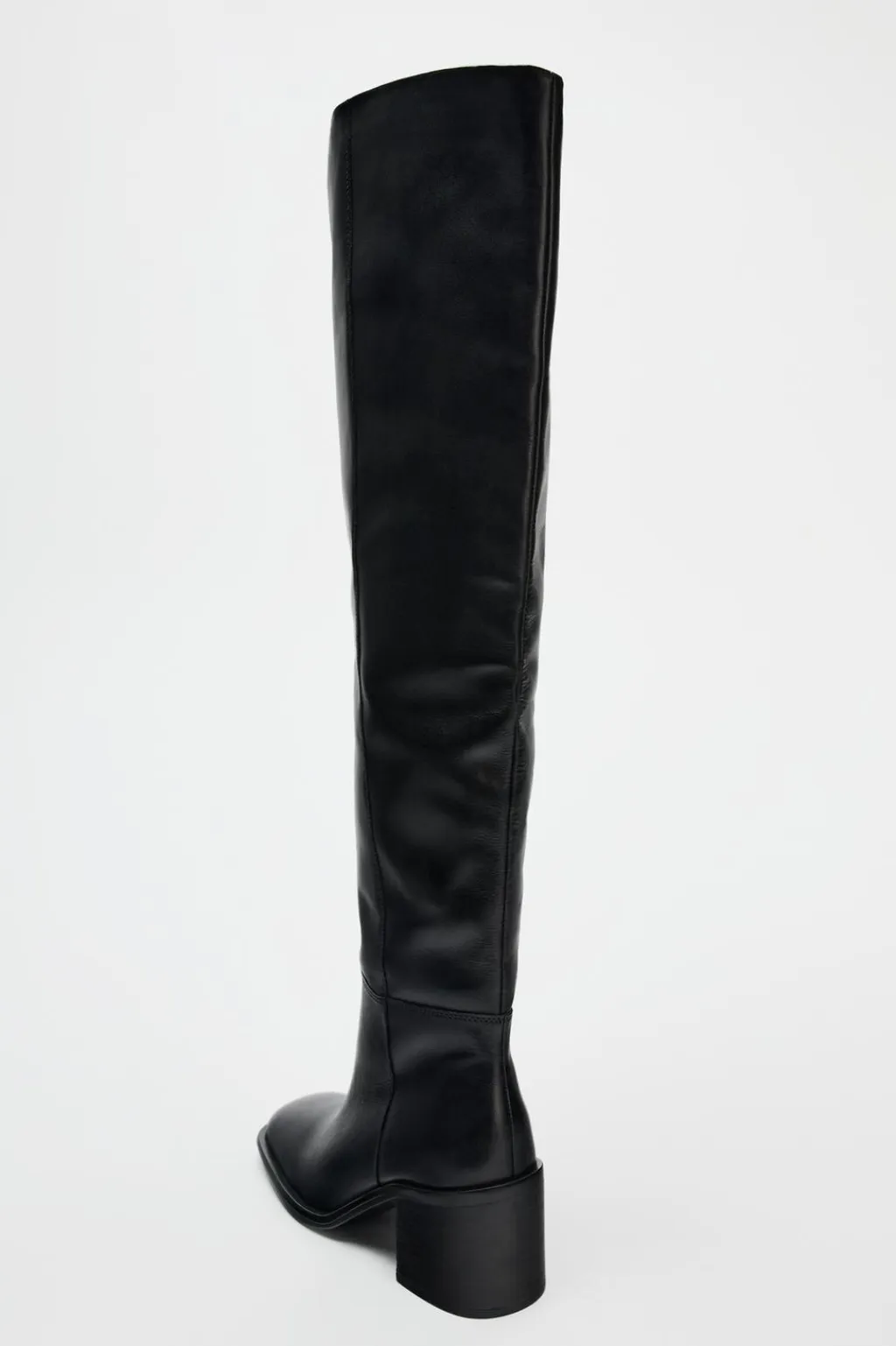 Zapato tipo bota en piel. Tacón ancho y caña alta. Detalle de pespunte en el corte. Acabado en punta cuadrada.