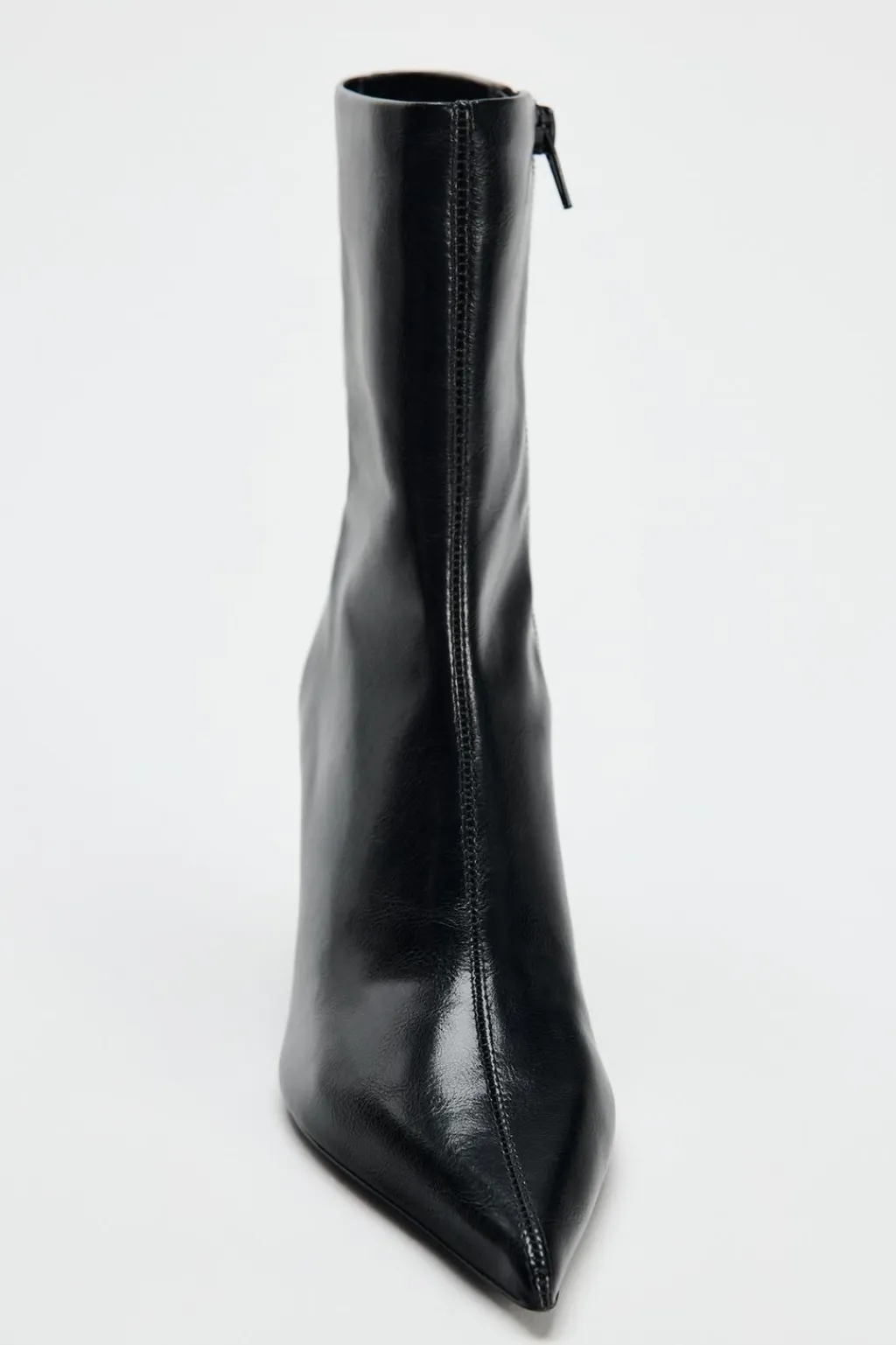 Zapato tipo botín efecto acharolado. Tacón fino. Cierre mediante cremallera. Acabado en punta.
