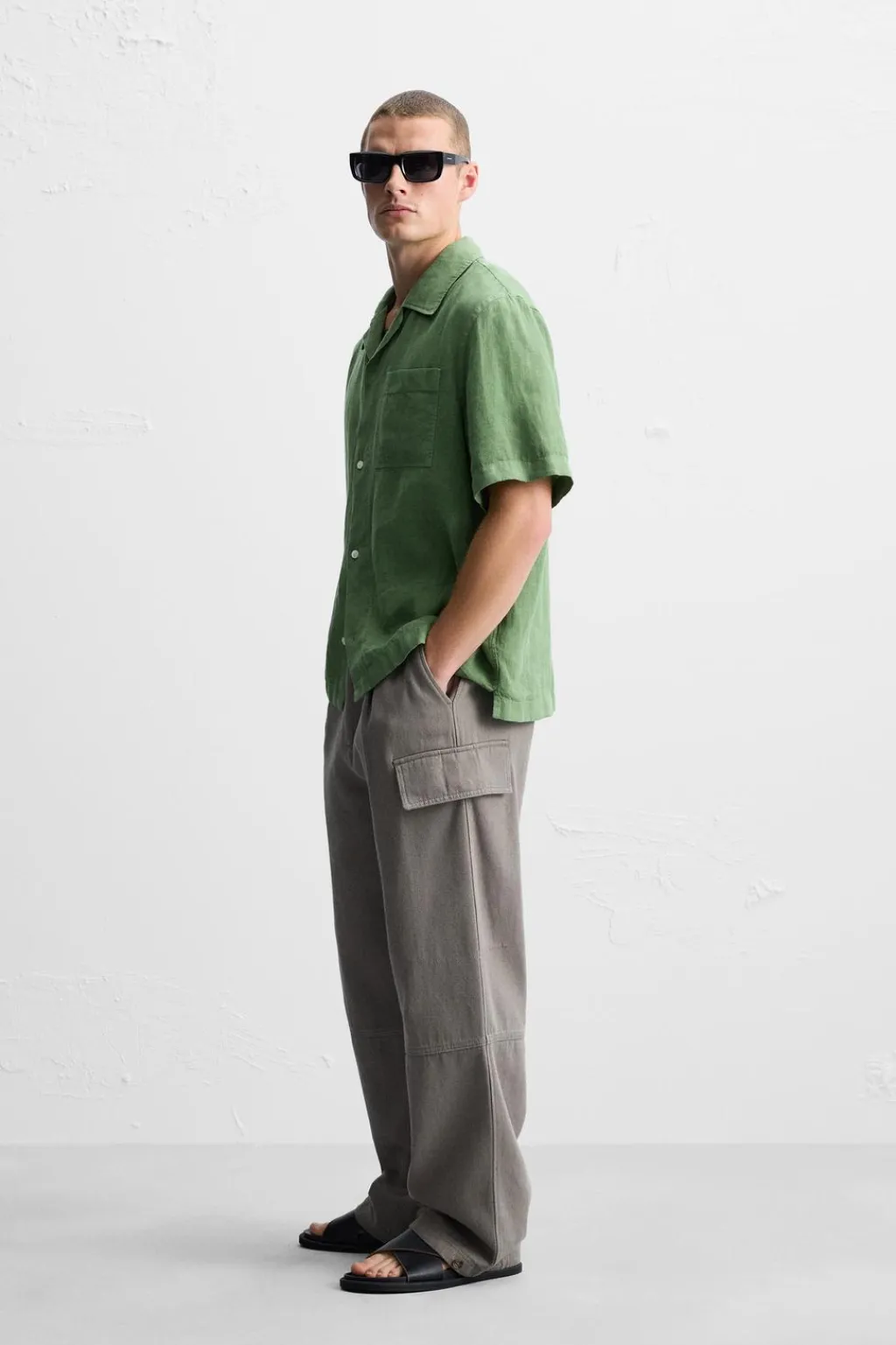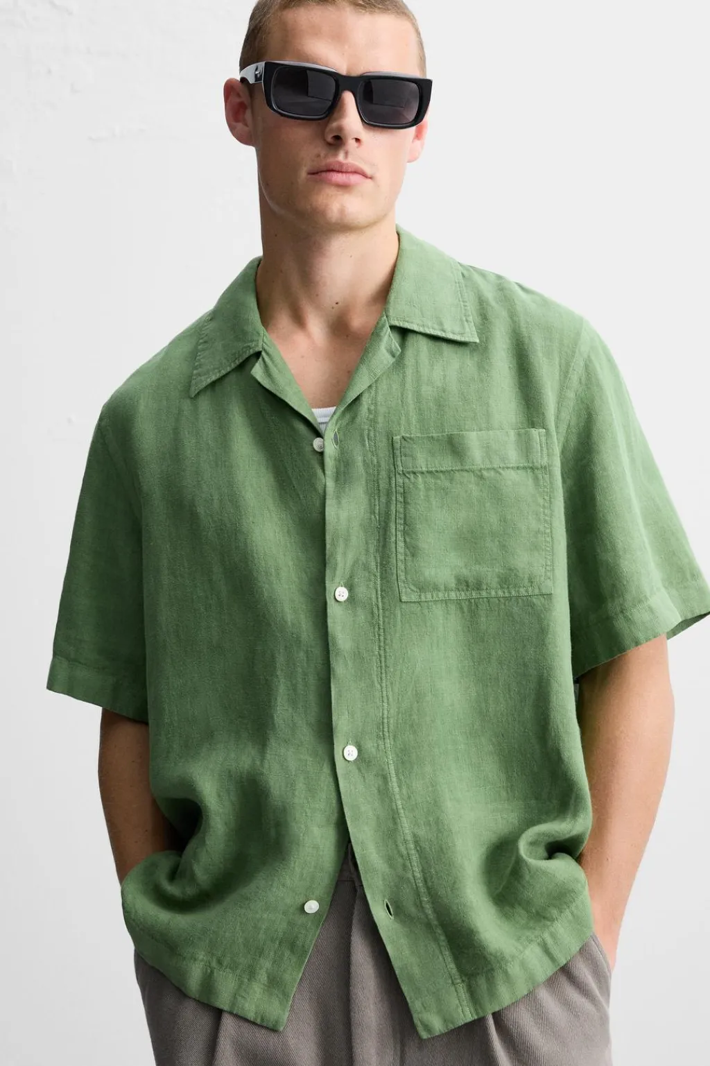 Camisa relaxed fit confeccionada en tejido de lino. Cuello bowling y manga corta. Bajo con aberturas laterales. Cierre frontal de botonadura.