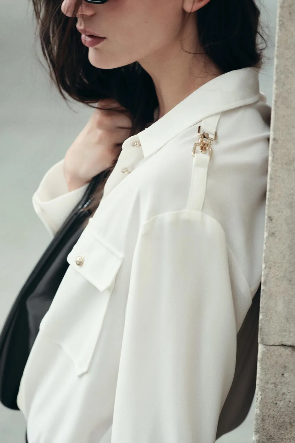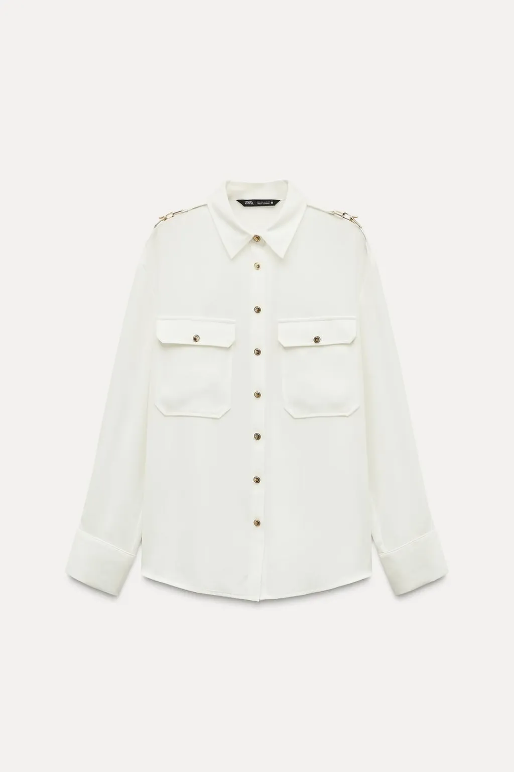 Camisa de cuello solapa y manga larga con apliques dorados en hombros. Bolsillos delanteros de plastrón con solapa. Cierre frontal con botones dorados.