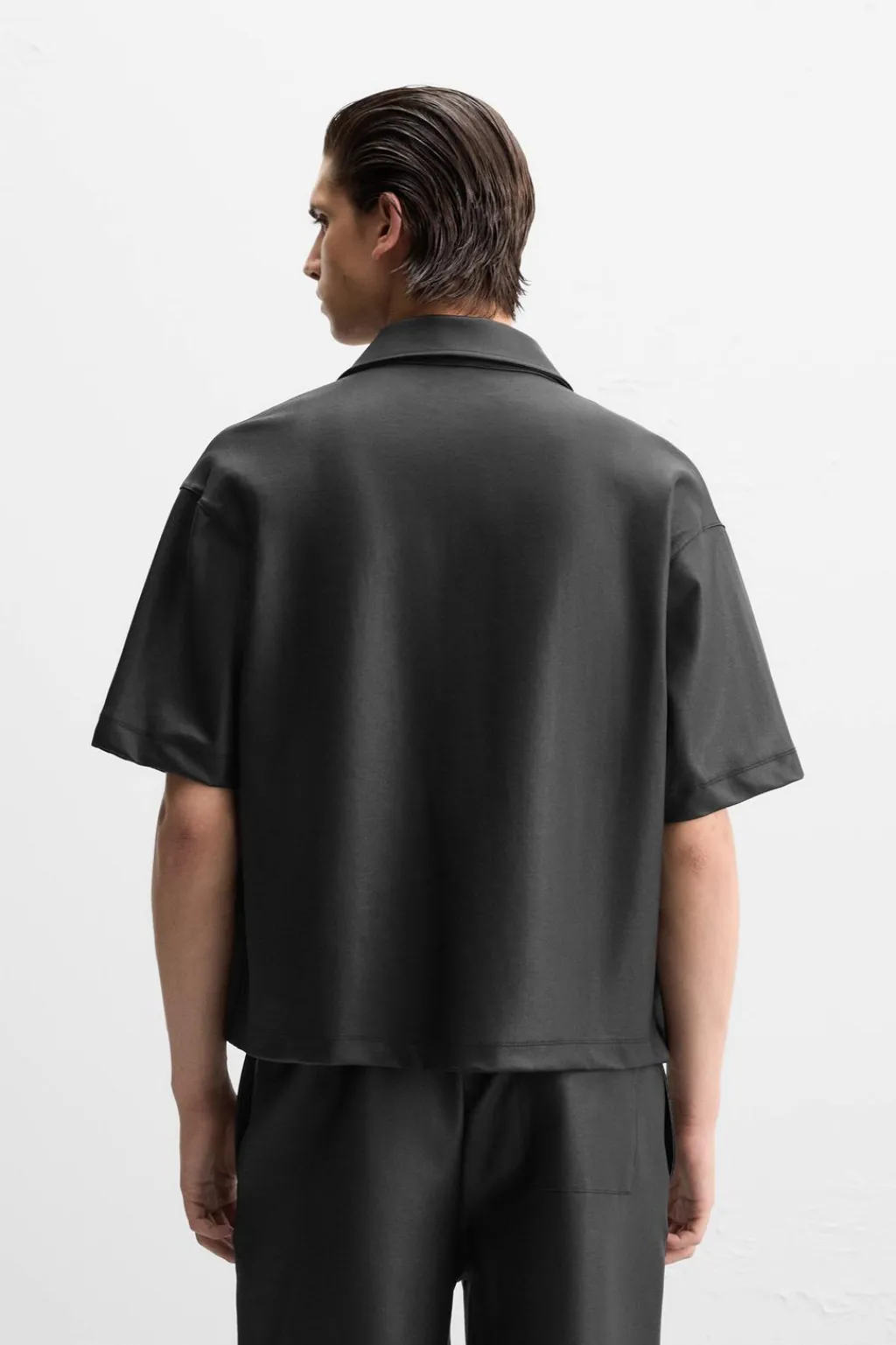 Camisa cropped fit. Cuello solapa y manga corta. Cierre frontal de botonadura oculta por solapa.