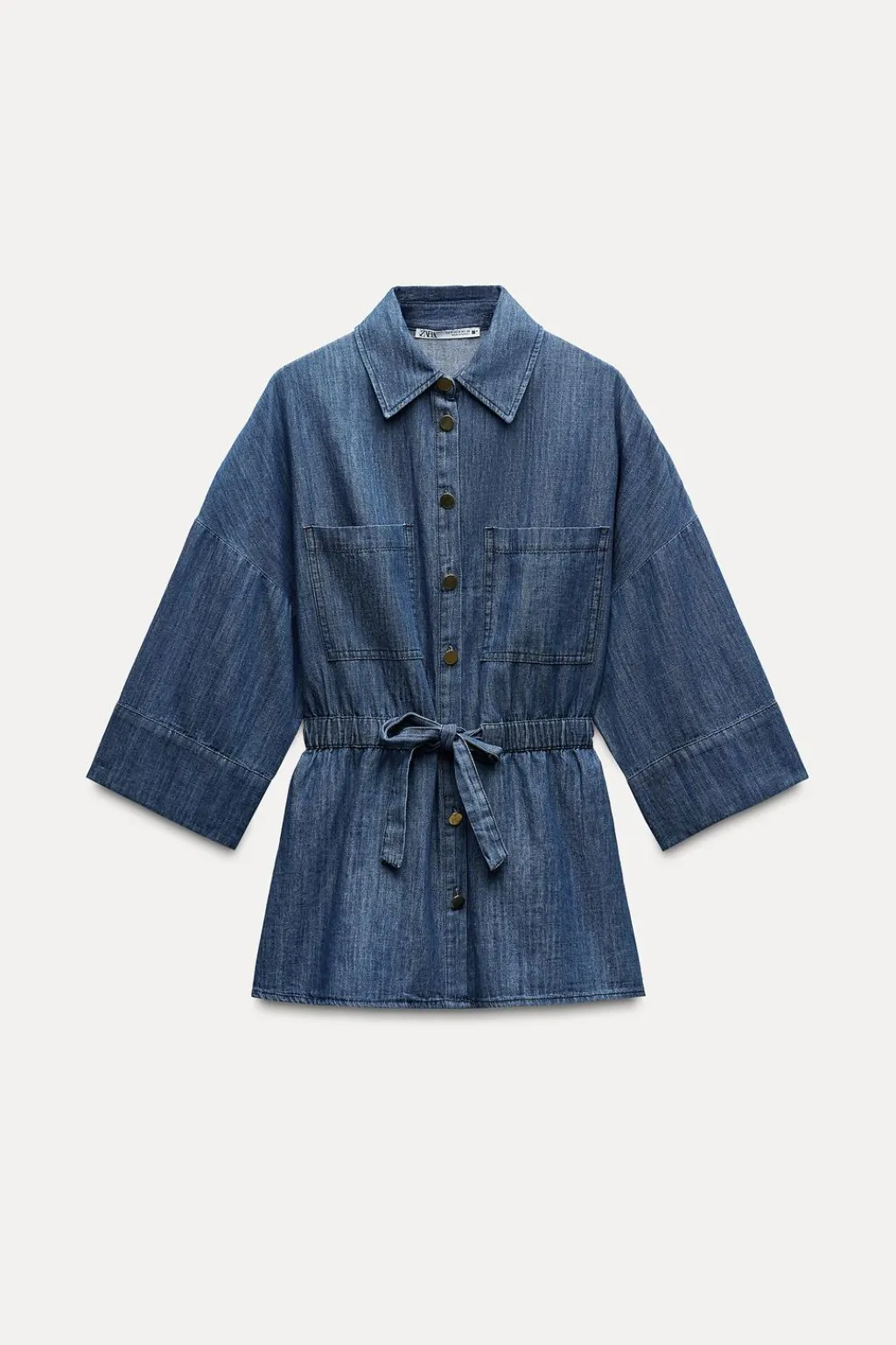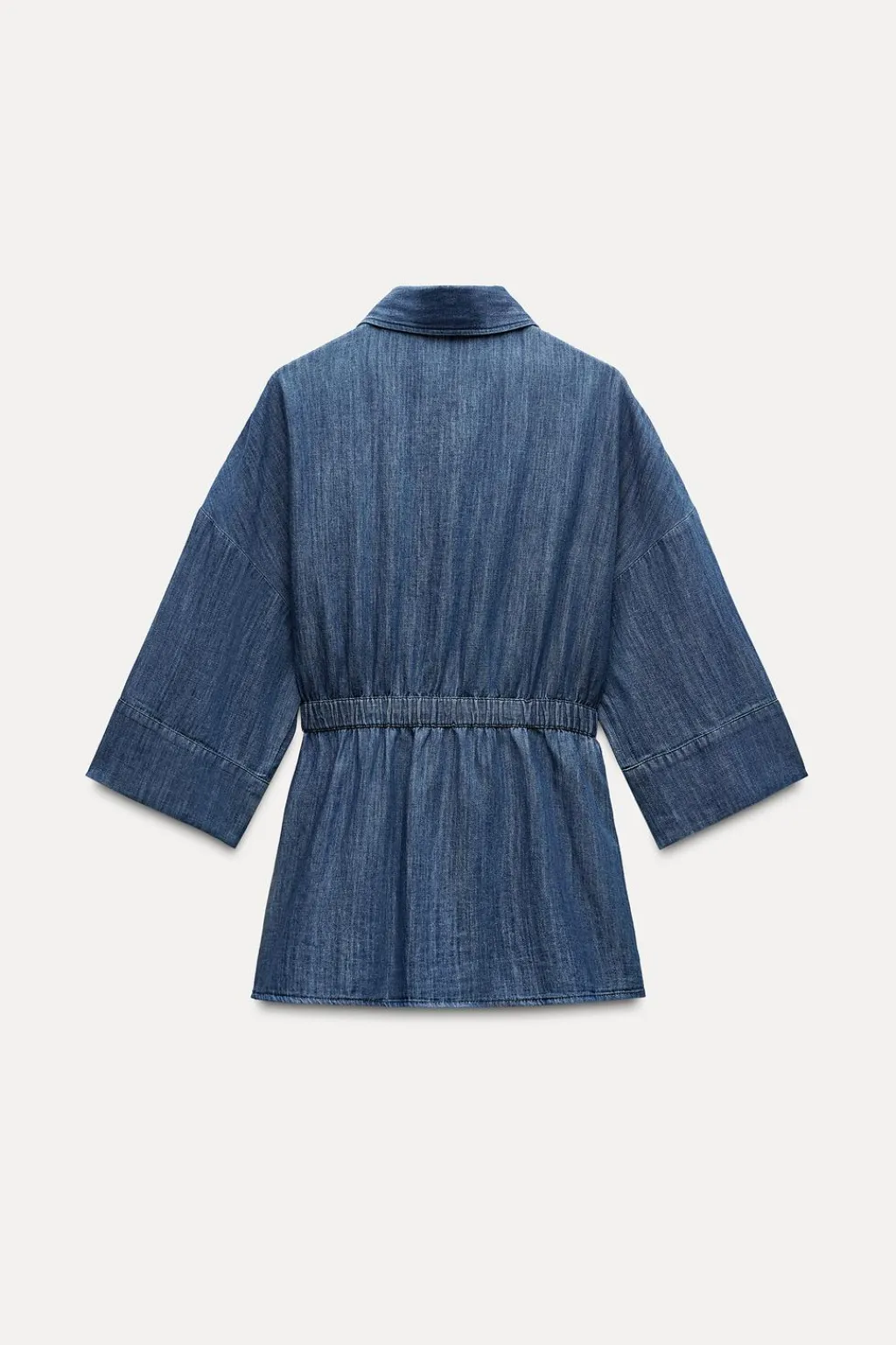 Camisa de cuello solapa y manga por debajo del codo con hombro caído. Bolsillos de plastrón en pecho. Cintura elástica ajustable con lazada en mismo tejido.Cierre frontal con botones metálicos.