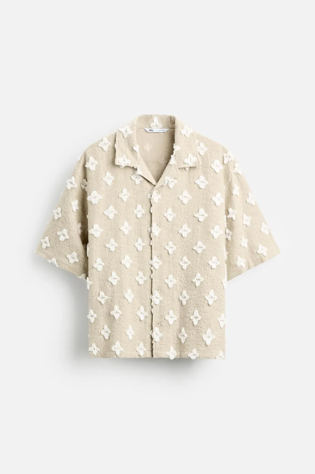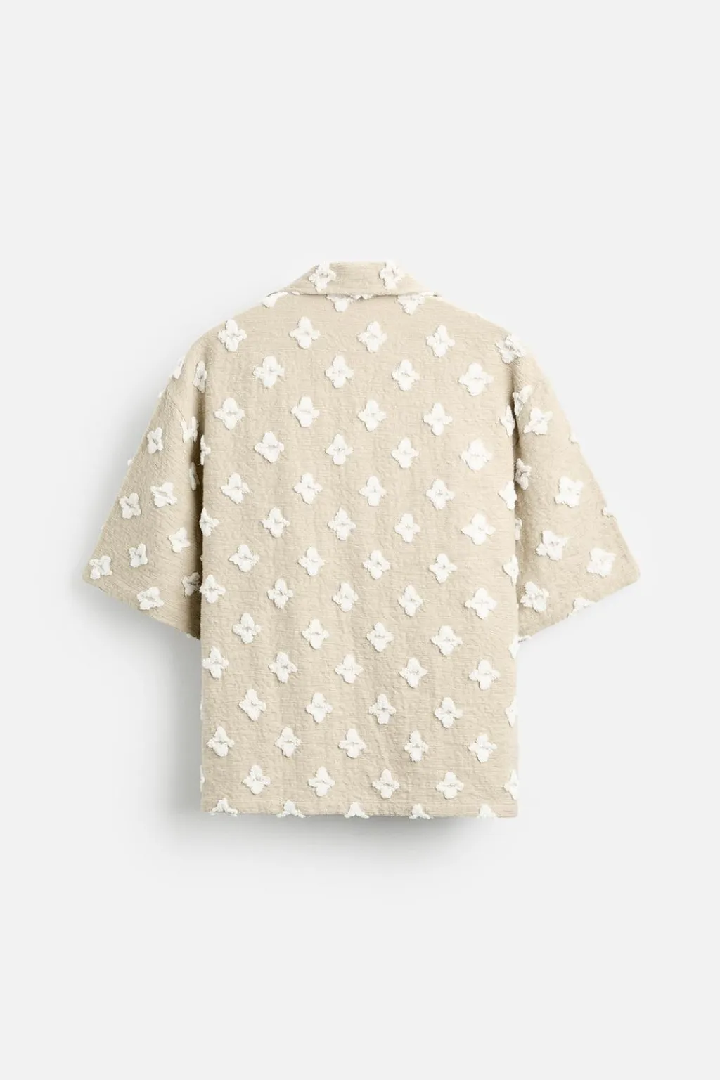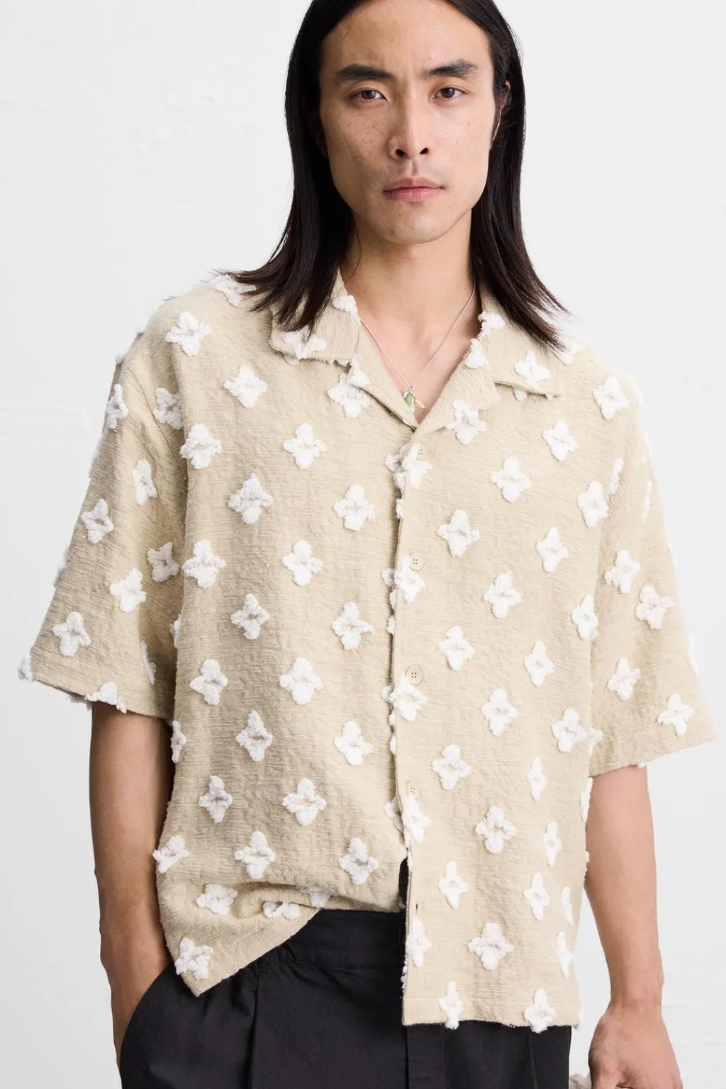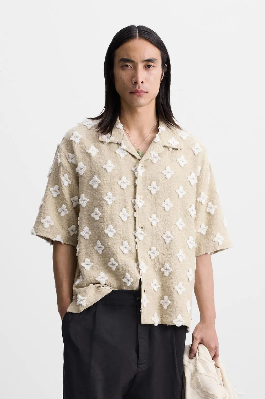 Camisa relaxed fit confeccionada en tejido con mezcla de algodón. Cuello bowling y manga corta. Bajo con aberturas laterales. Cierre frontal de botonadura.