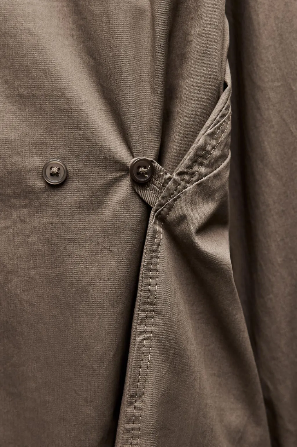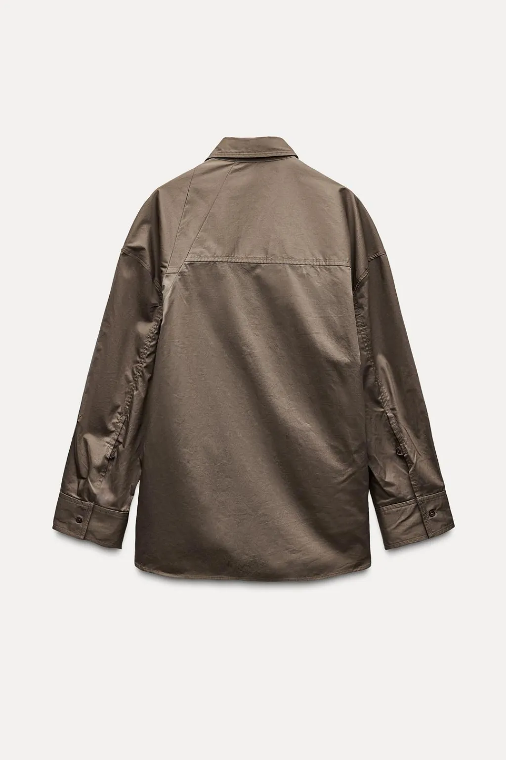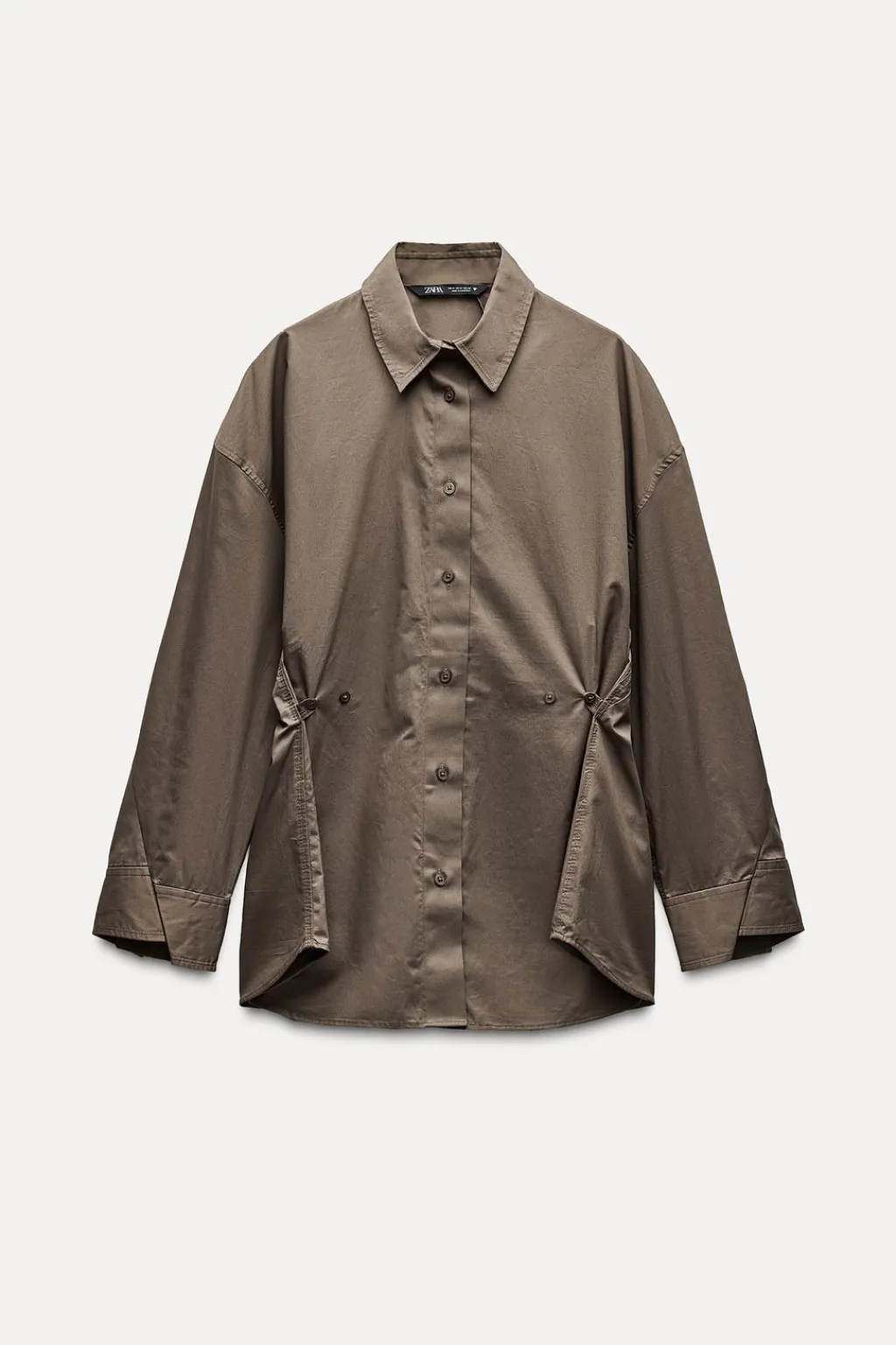 Camisa de cuello solapa y manga larga acabada en puño asimétrico con hombro caído. Detalle de trabillas laterales ajustables con botones. Cierre frontal con botones.