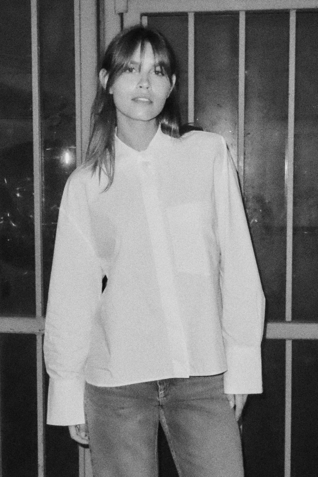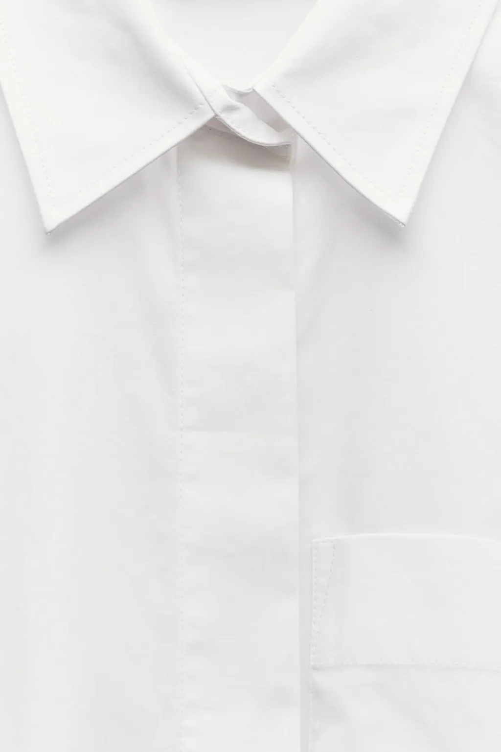 Camisa confeccionada en algodón 100 %. Cuello solapa y manga larga acabada en puño. Bolsillo de plastrón en delantero. Bajo asimétrico con aberturas laterales. Cierre frontal con botones ocultos por sopata.