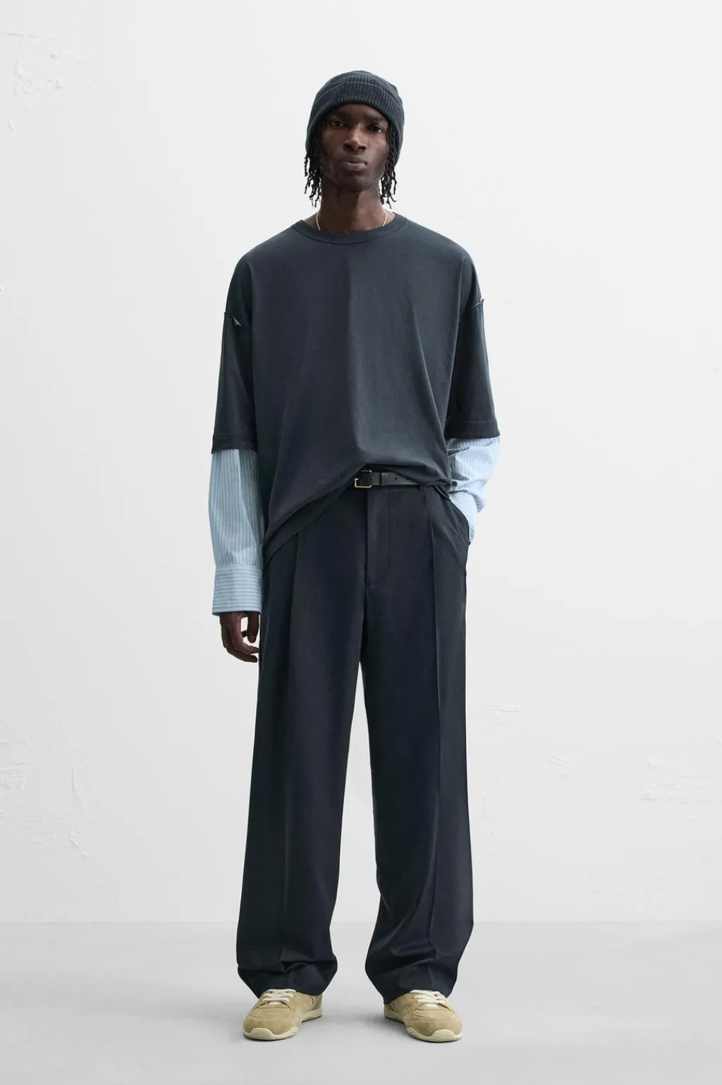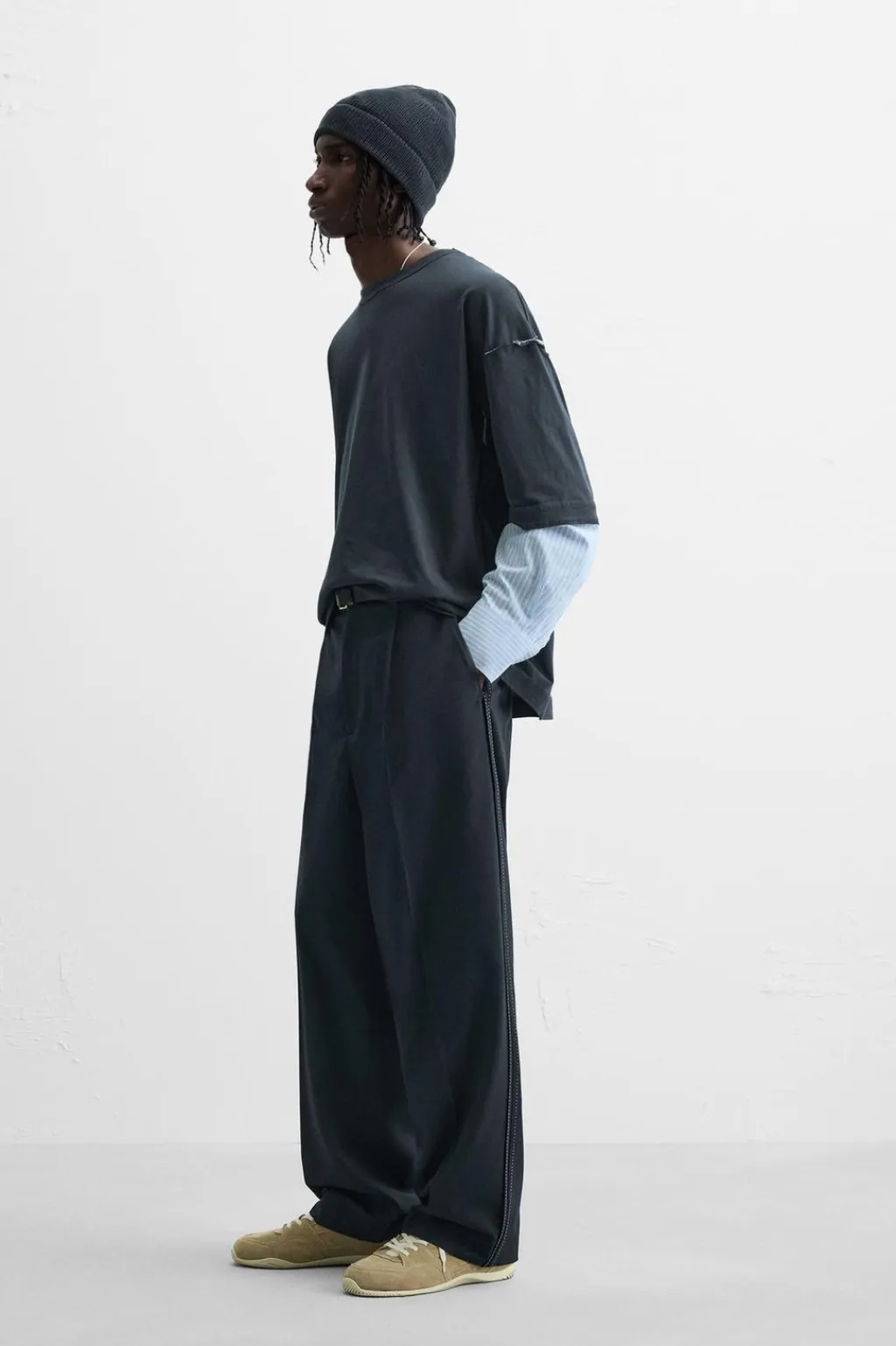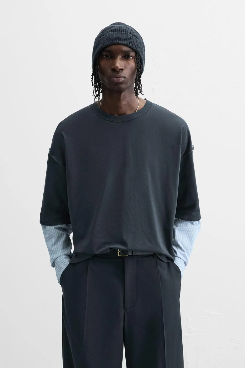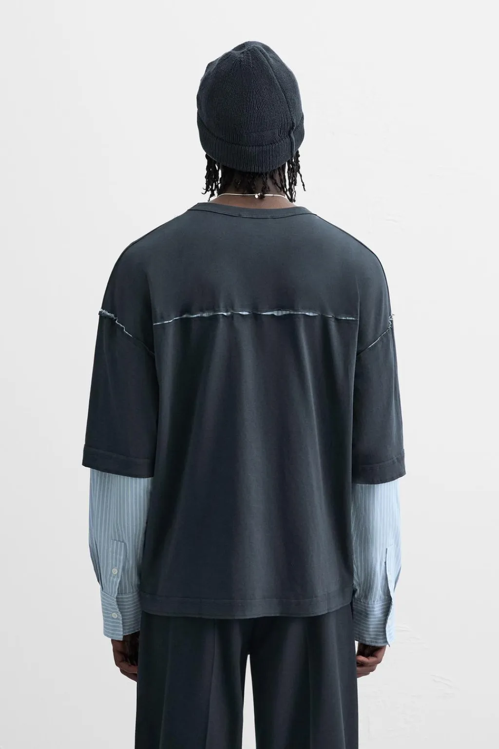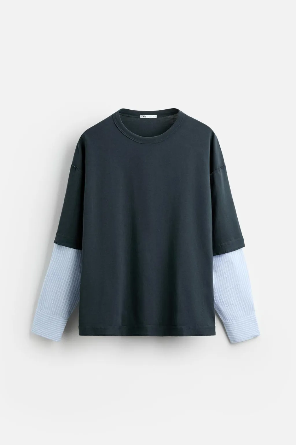 Camiseta relaxed fit. Cuello redondo. Manga larga efecto doble combinada a contraste y acabada en puño con botón. Acabados irregulares.