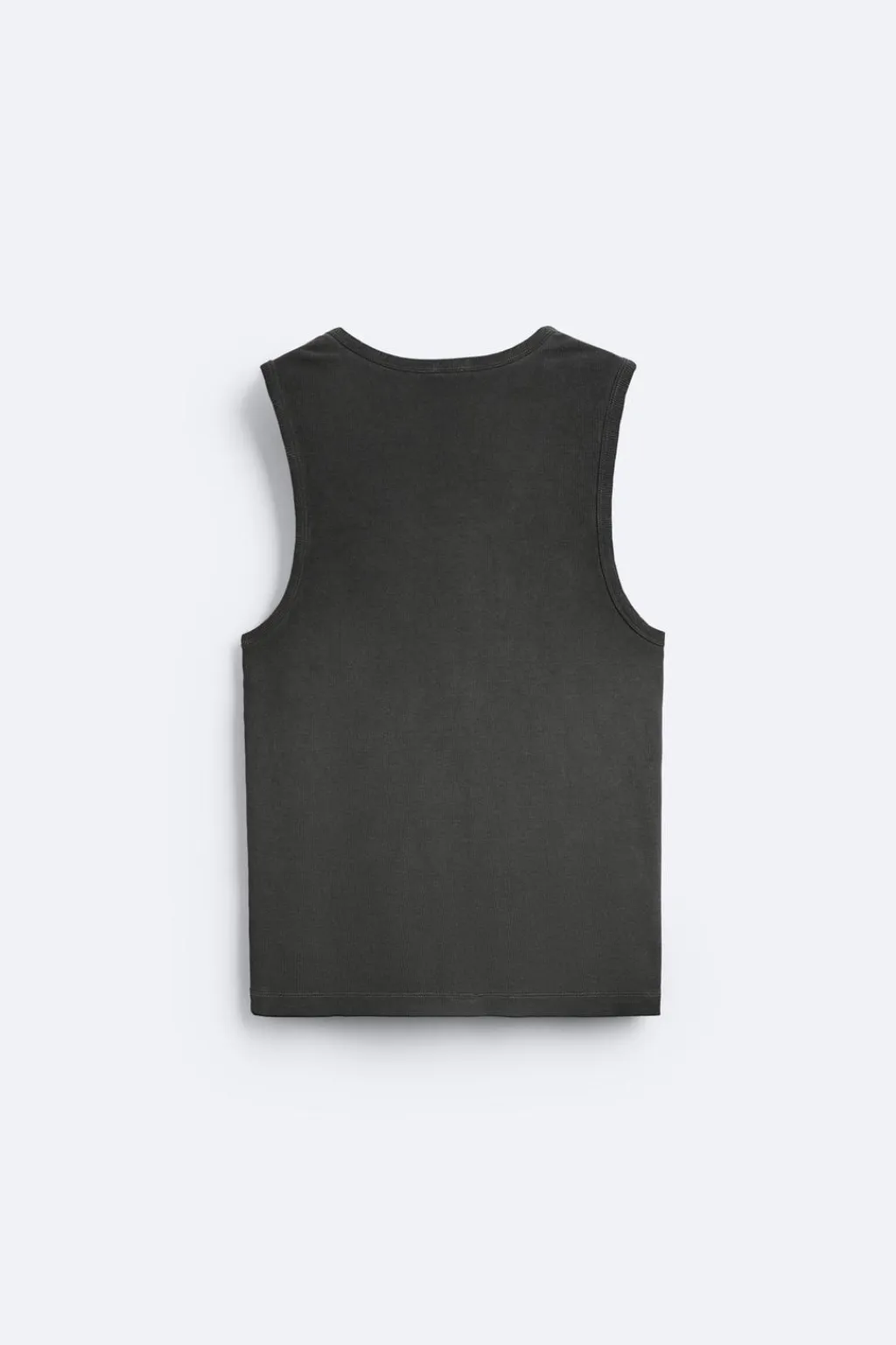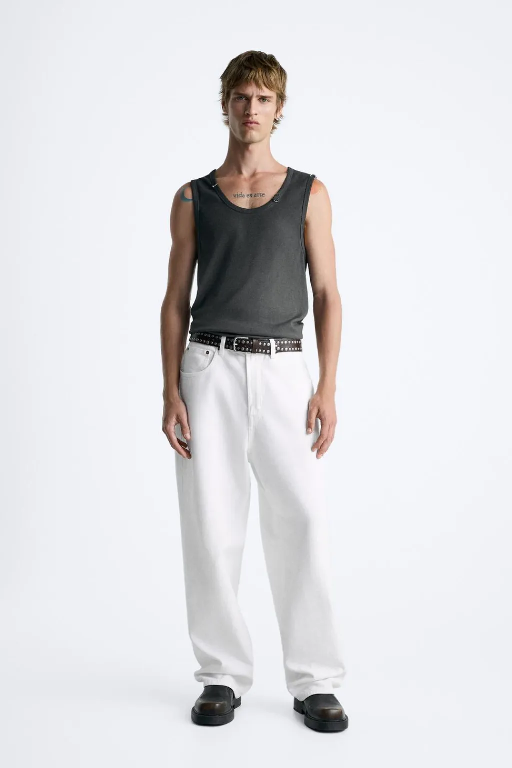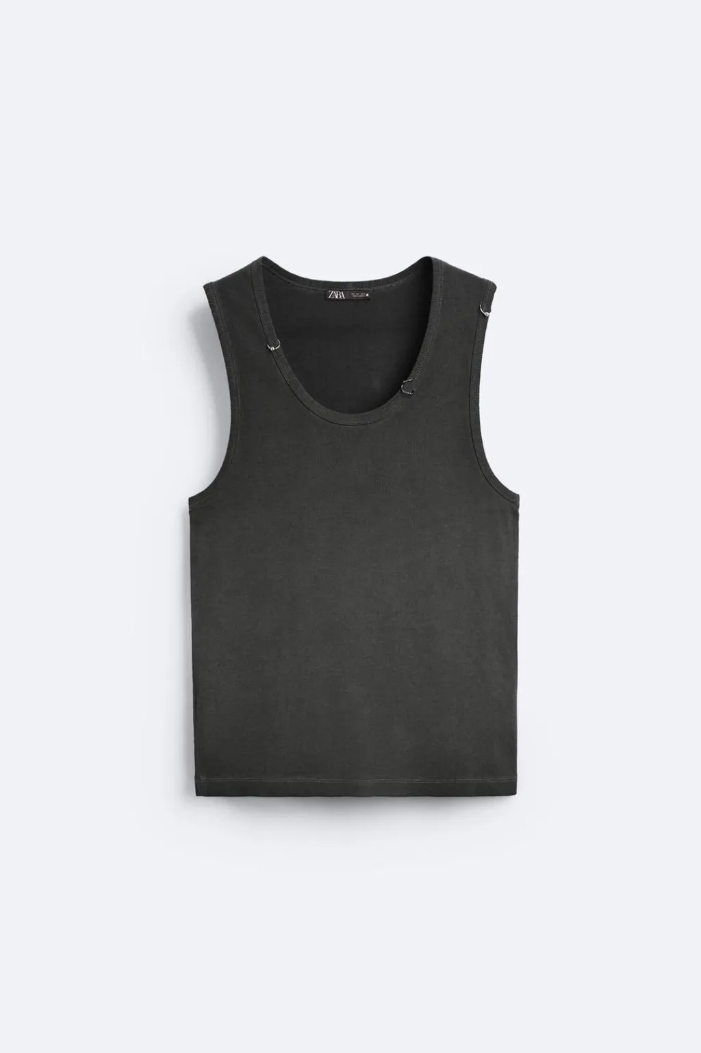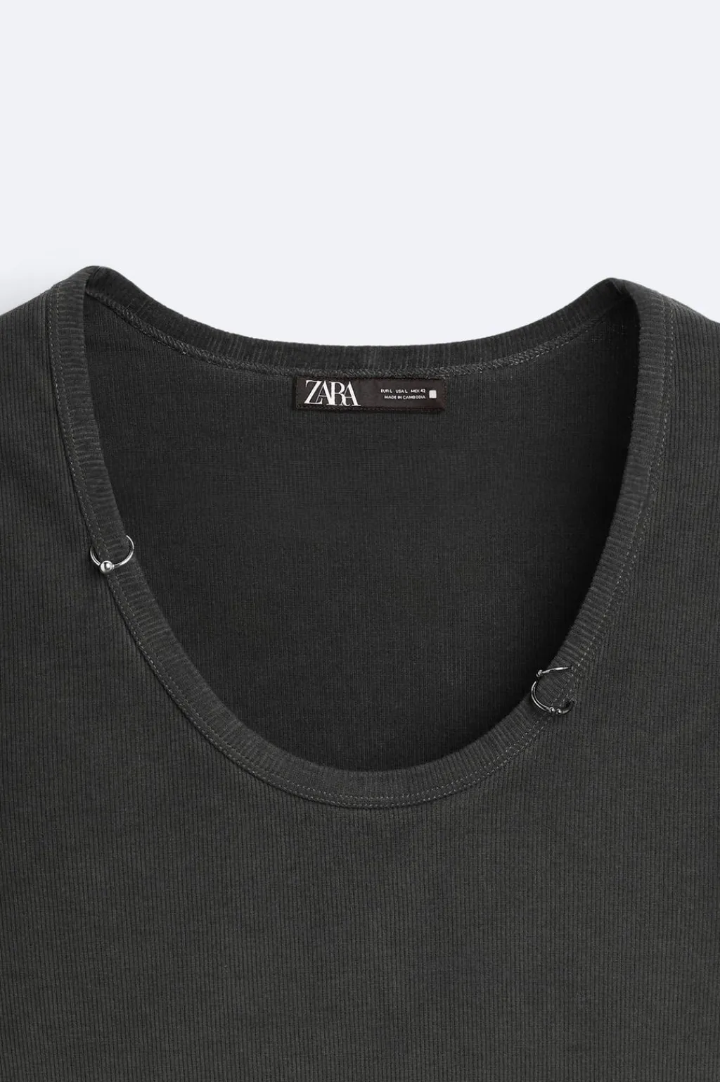 Camiseta slim fit. Cuello redondo amplio con detalle de aplicaciones metálicas y manga sisa. Efecto lavado.