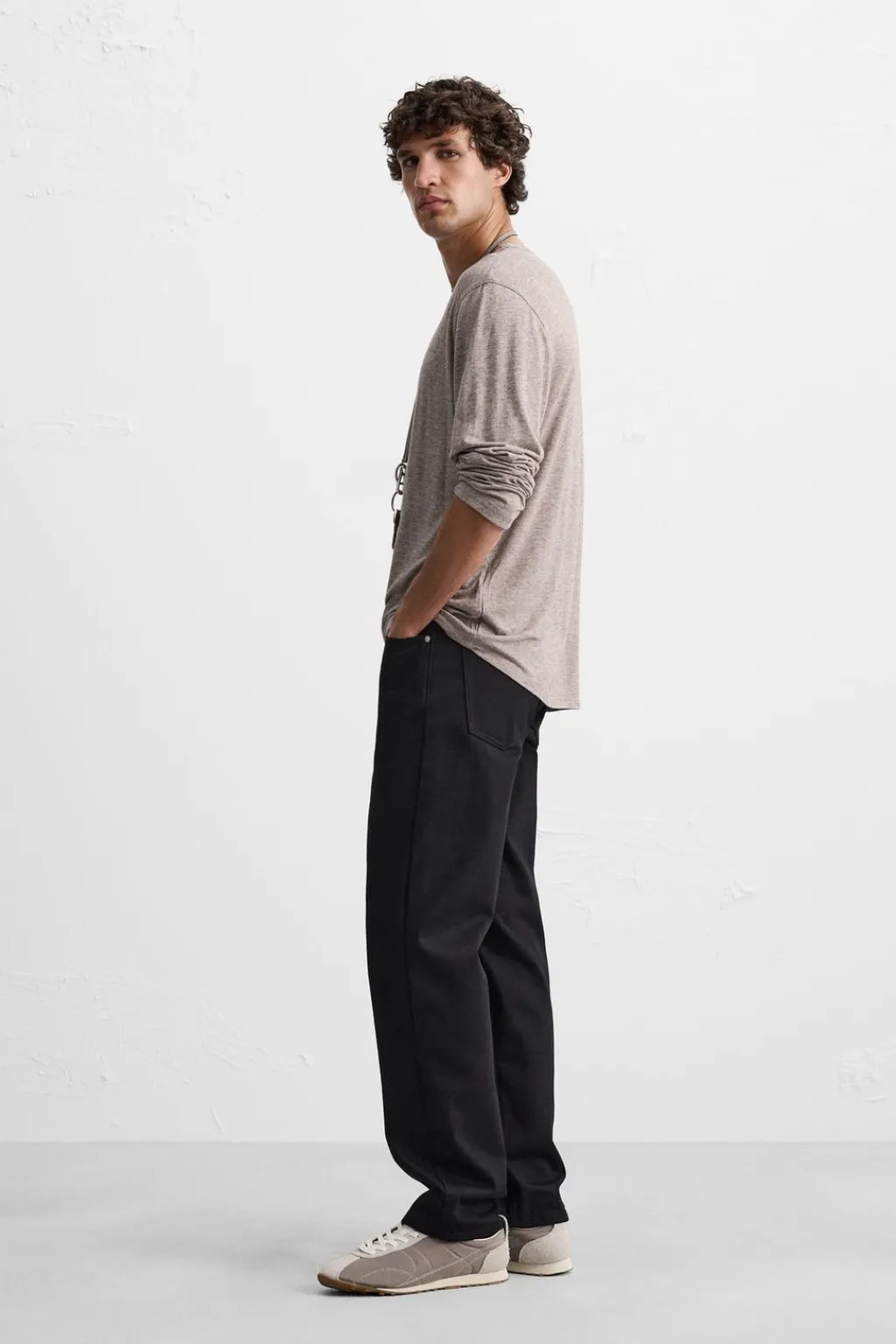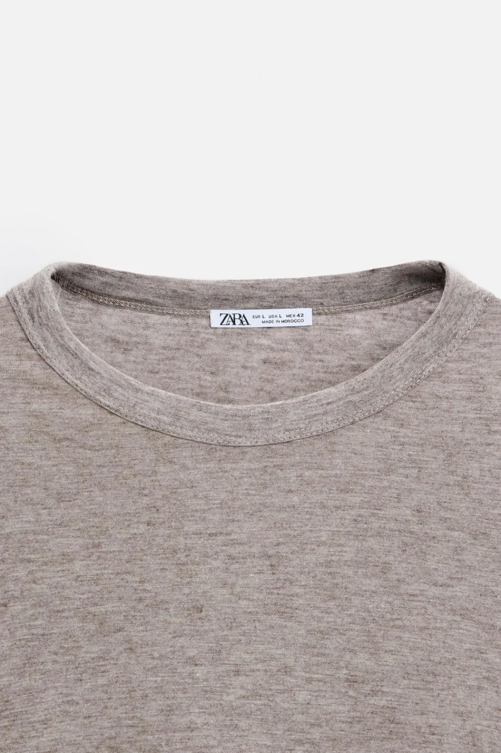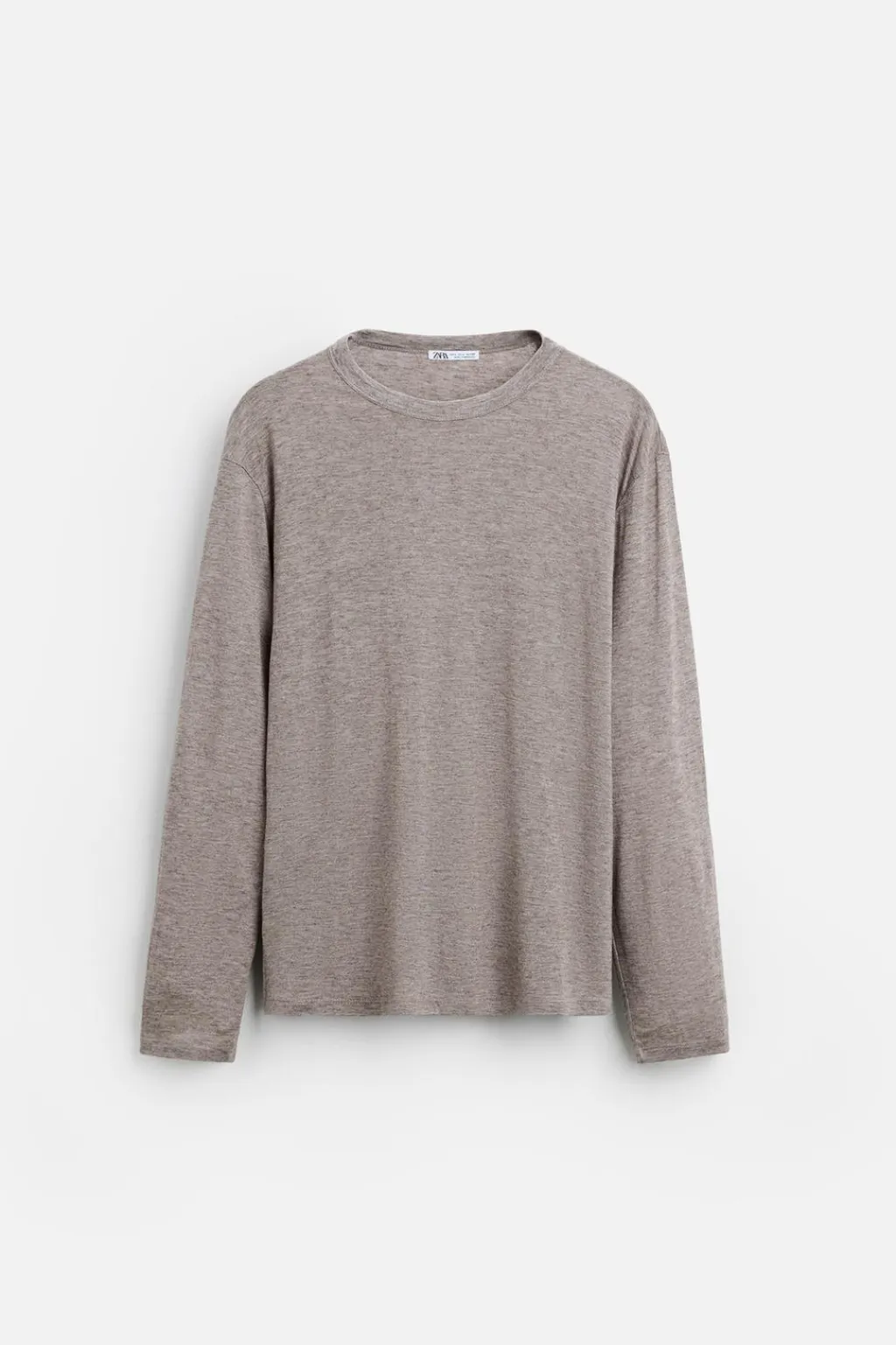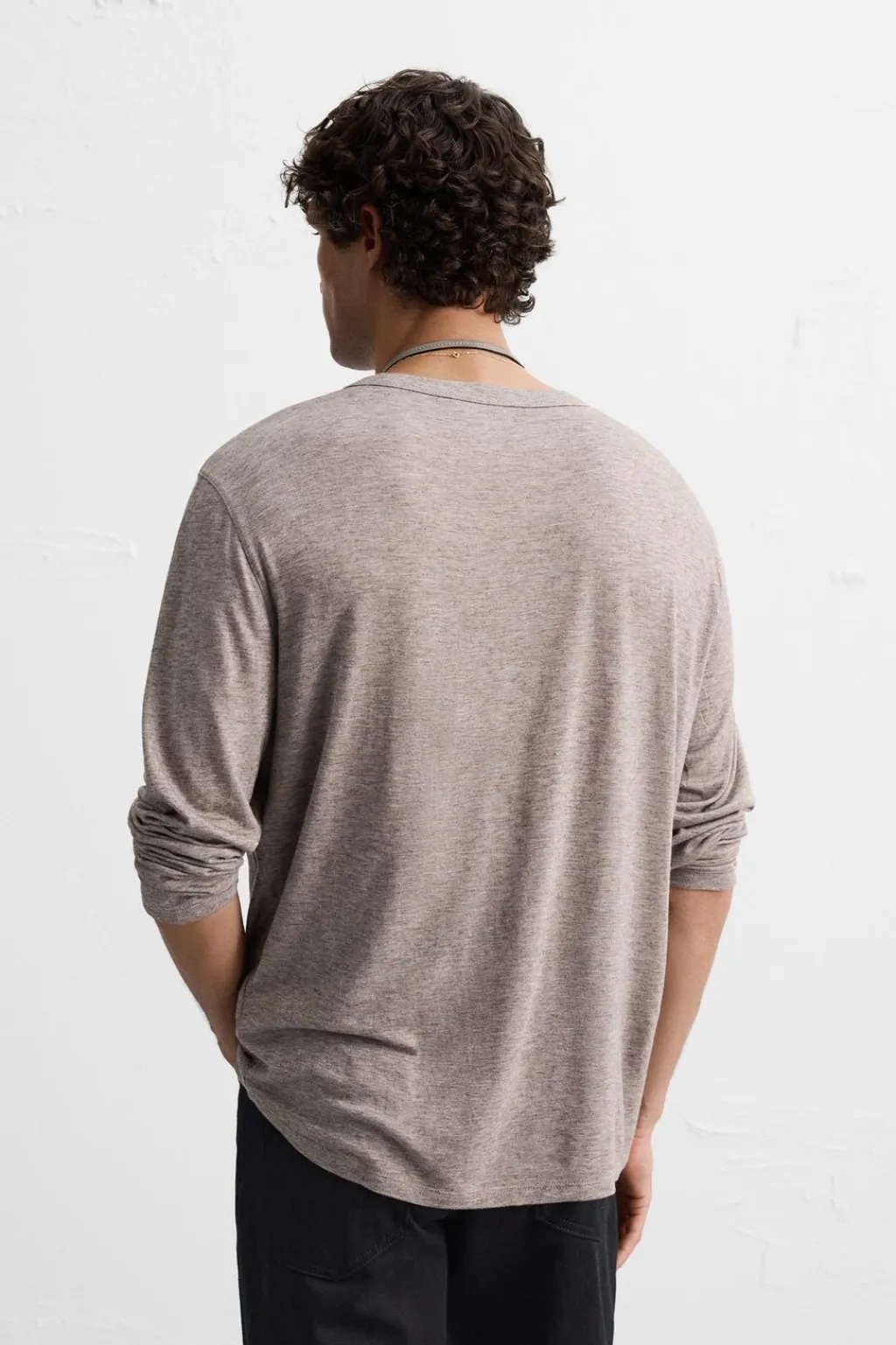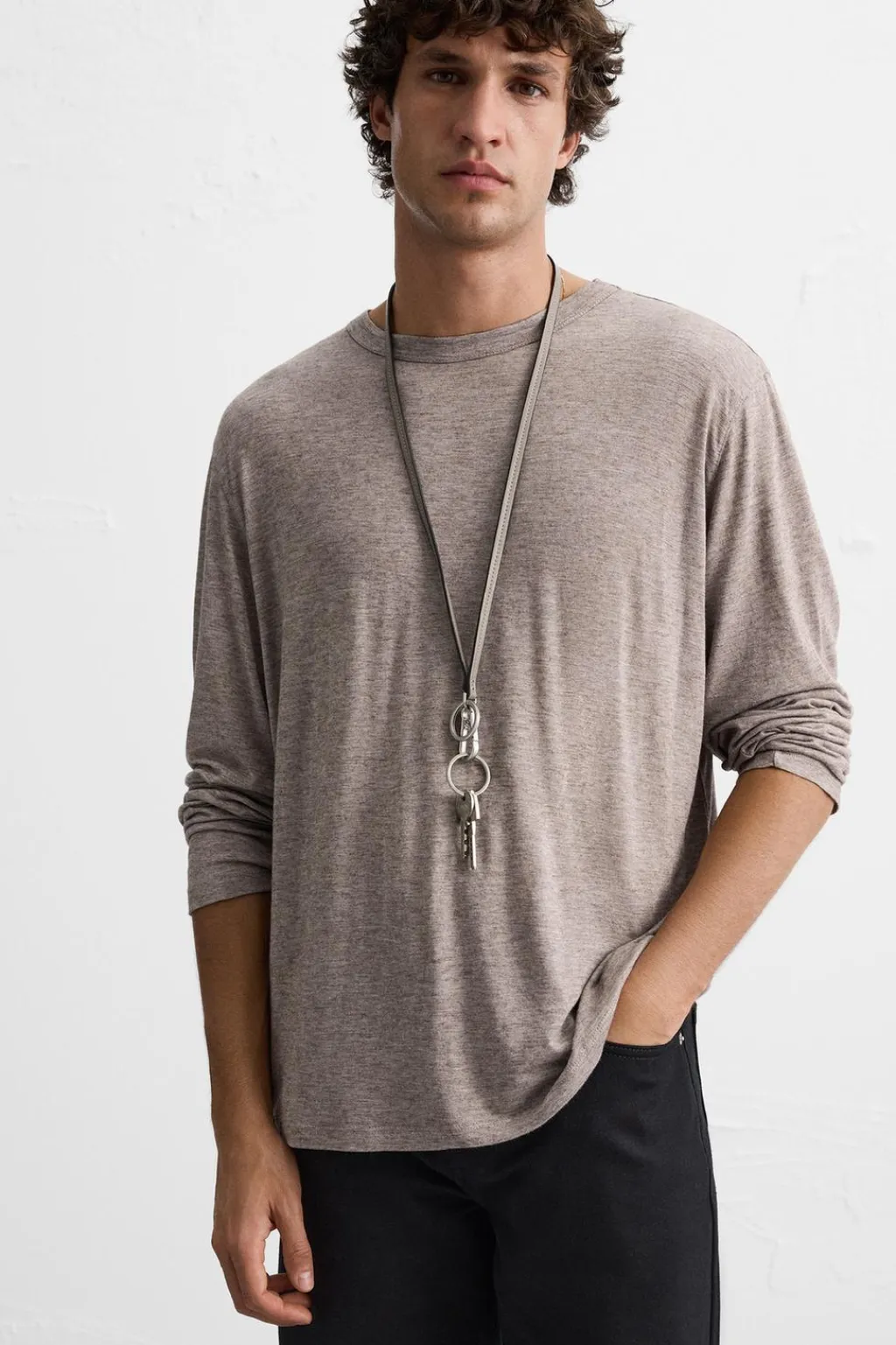 Camiseta relaxed fit confeccionada en tejido con mezcla de viscosa y lana. Cuello redondo y manga larga.
