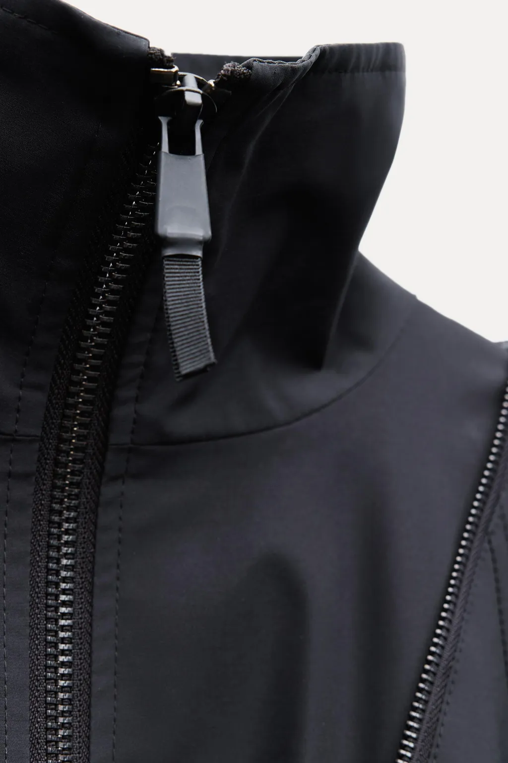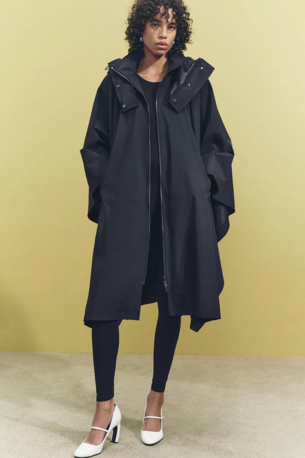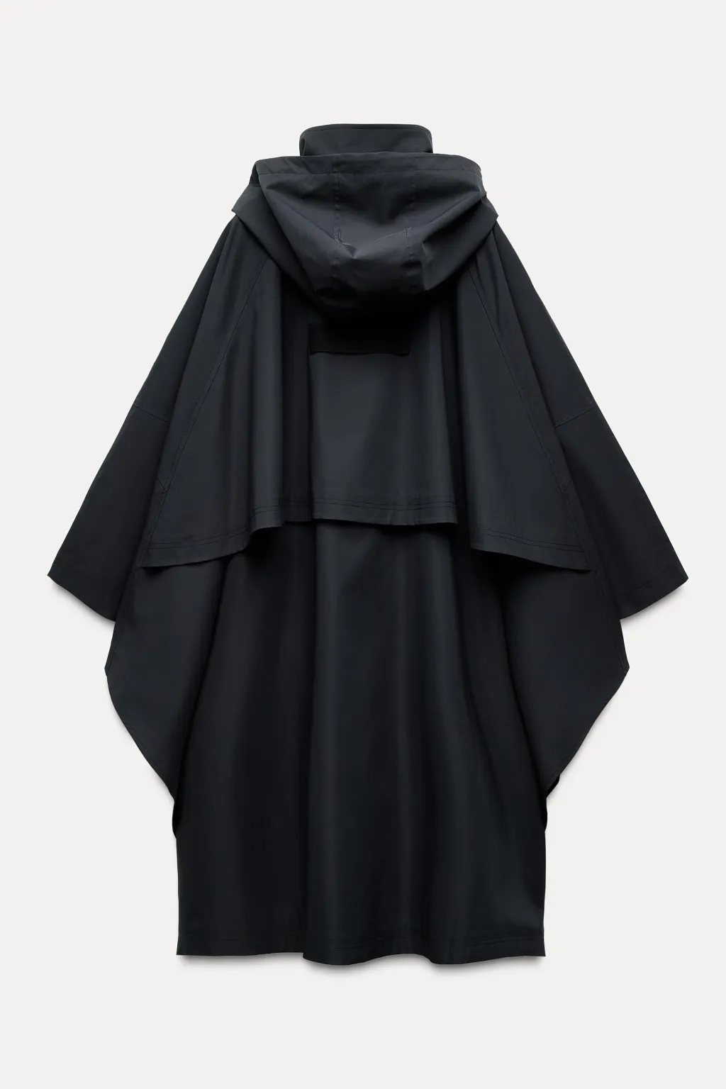 Capa de cuello alto y capucha extraíble con cremallera metálica ajustable con cordón elástico y stopper. Manga tipo capa con botones a presión. Bolsillos delanteros con cremallera metálica. Bajo asimétrico. Cierre frontal con cremallera y botones a presión.