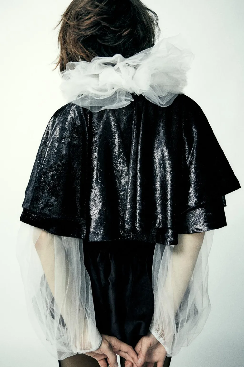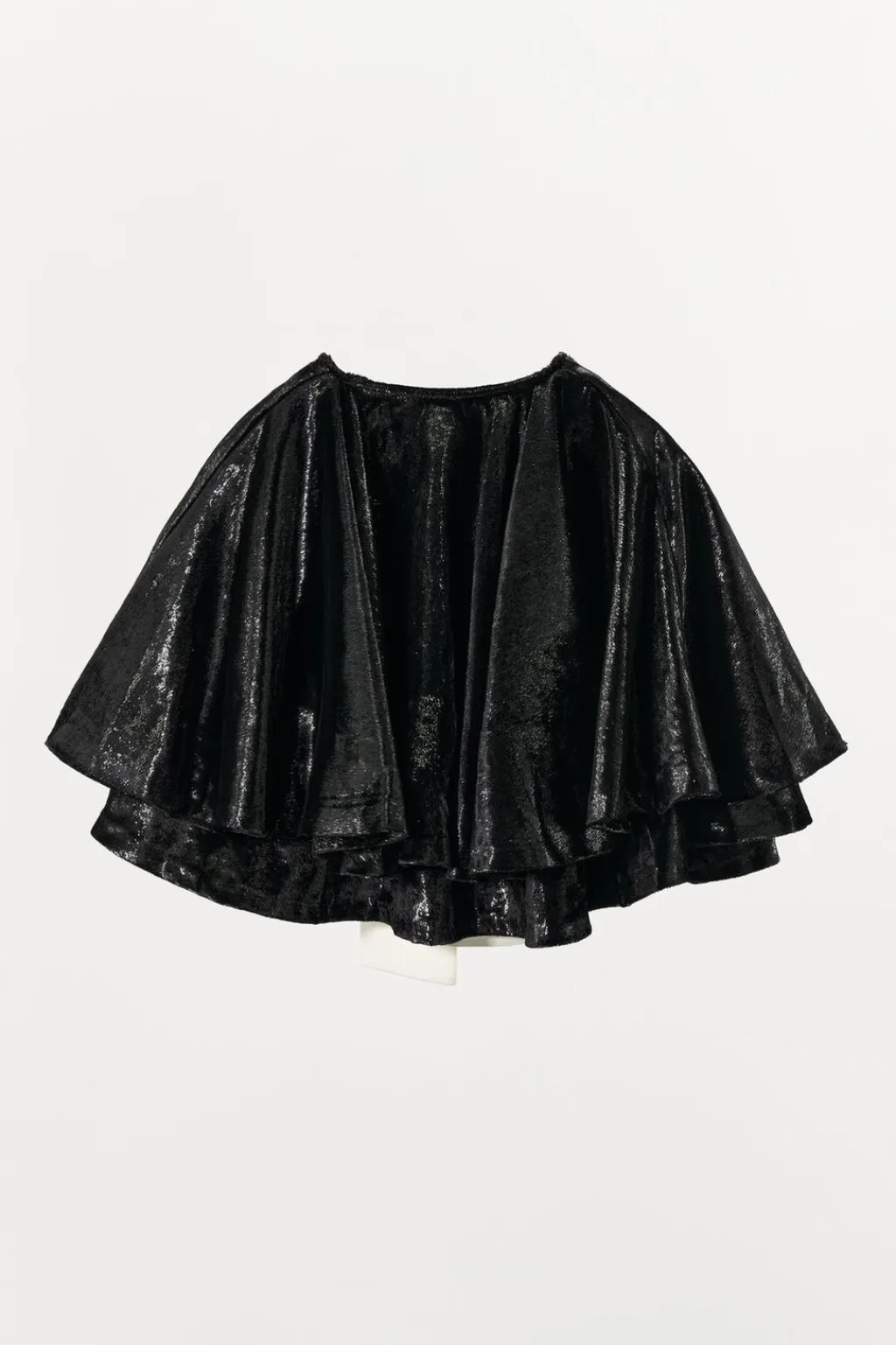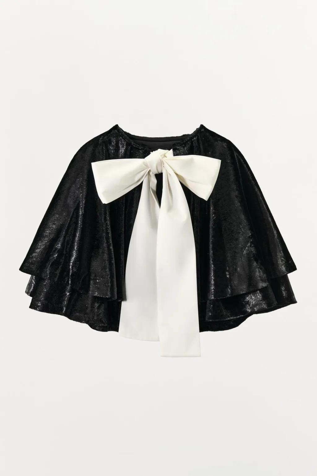 Capa corta de cuello redondo con lazada combinado en tejido satinado.