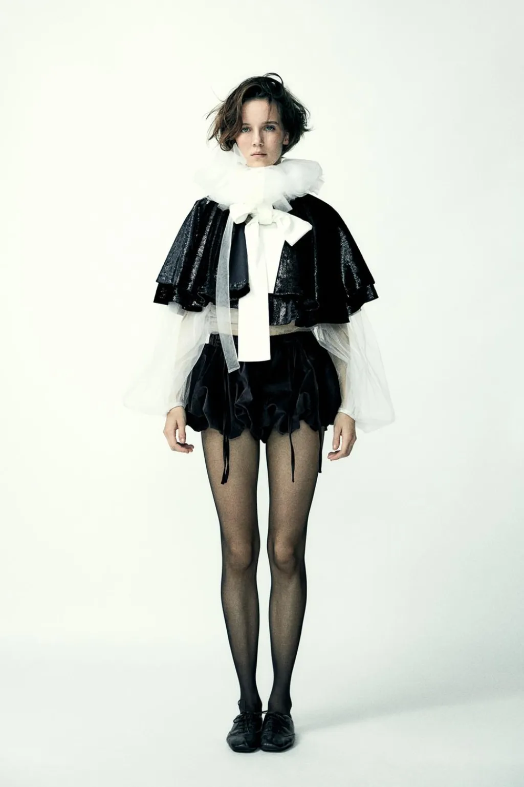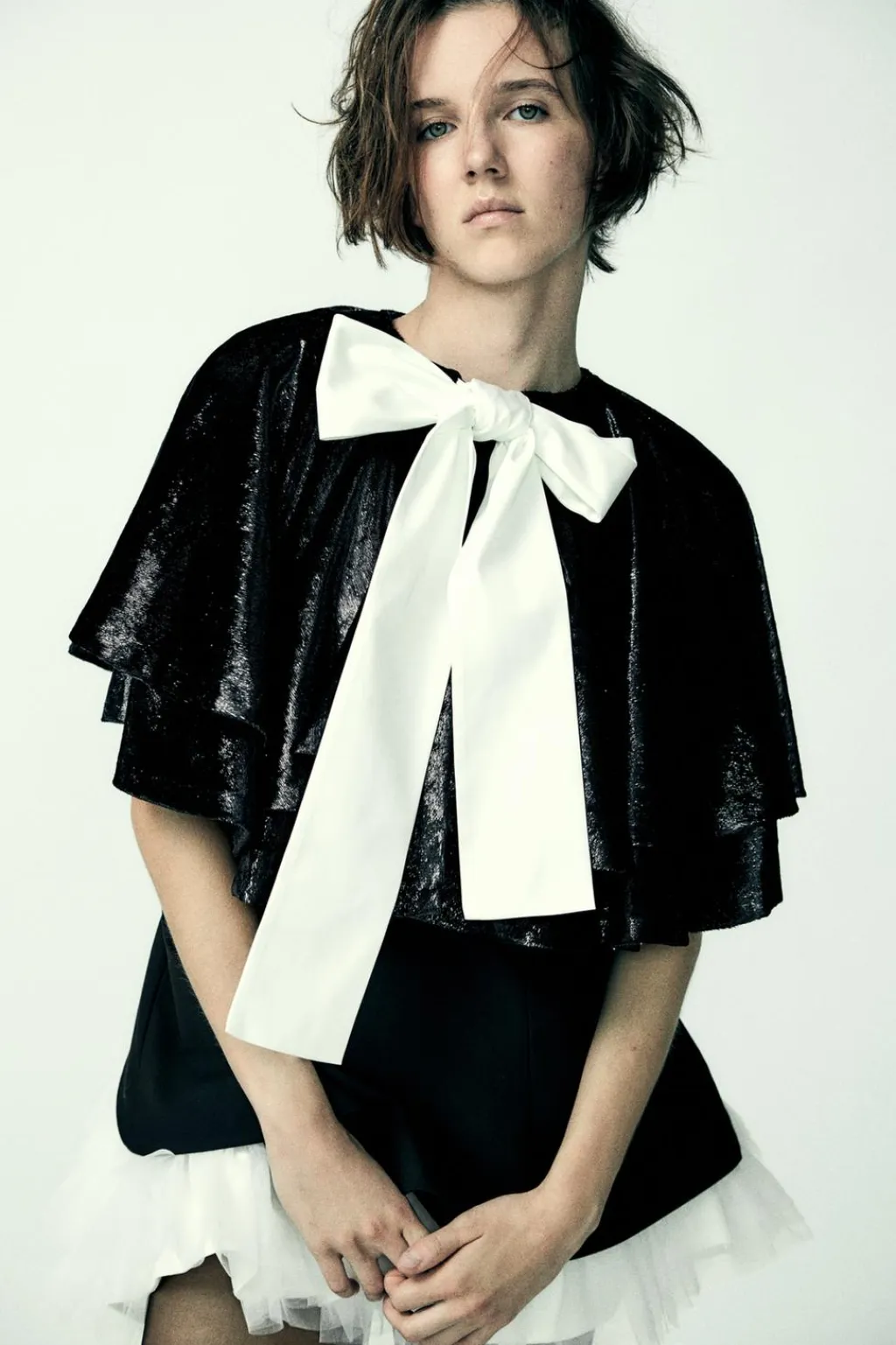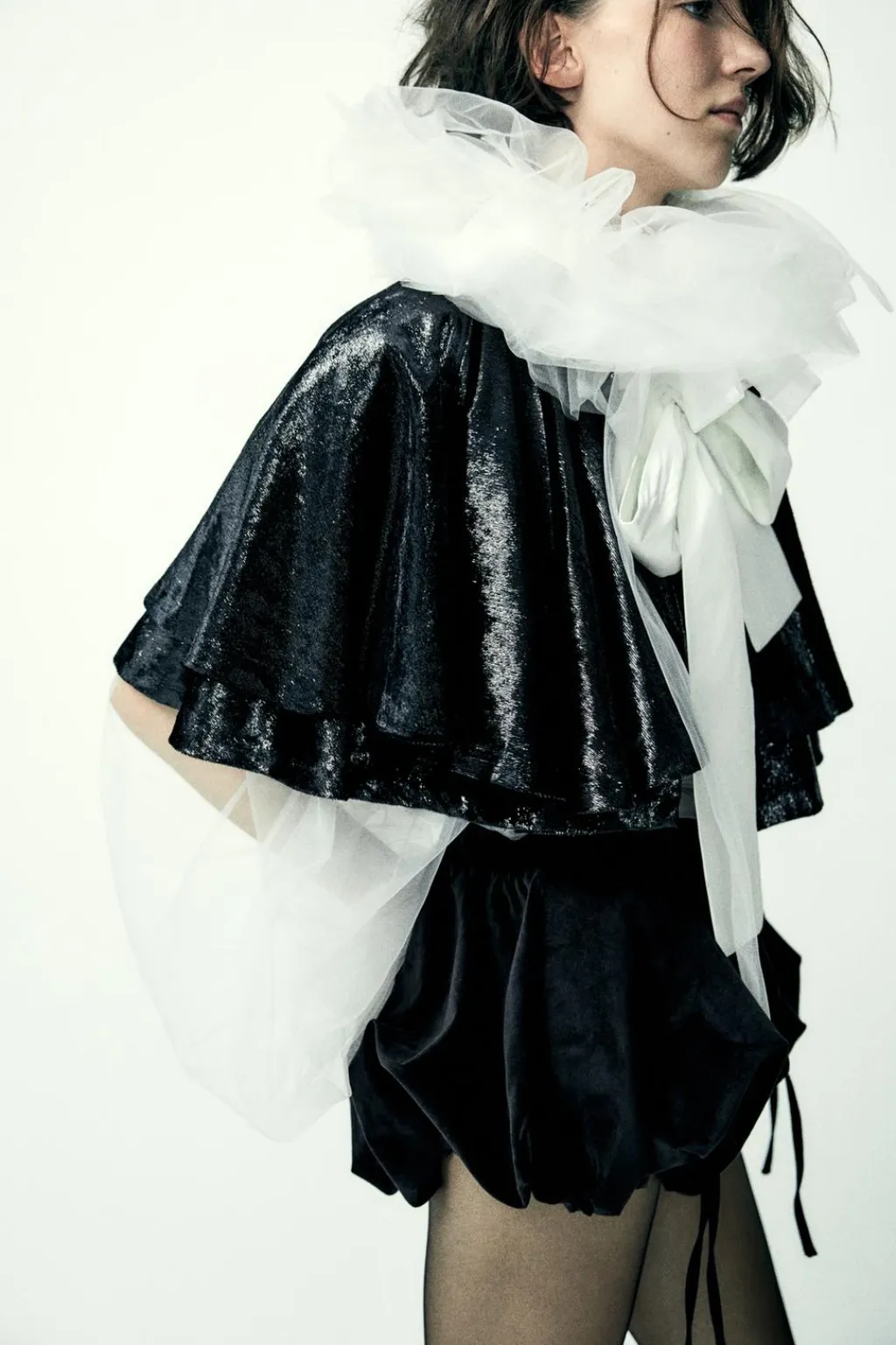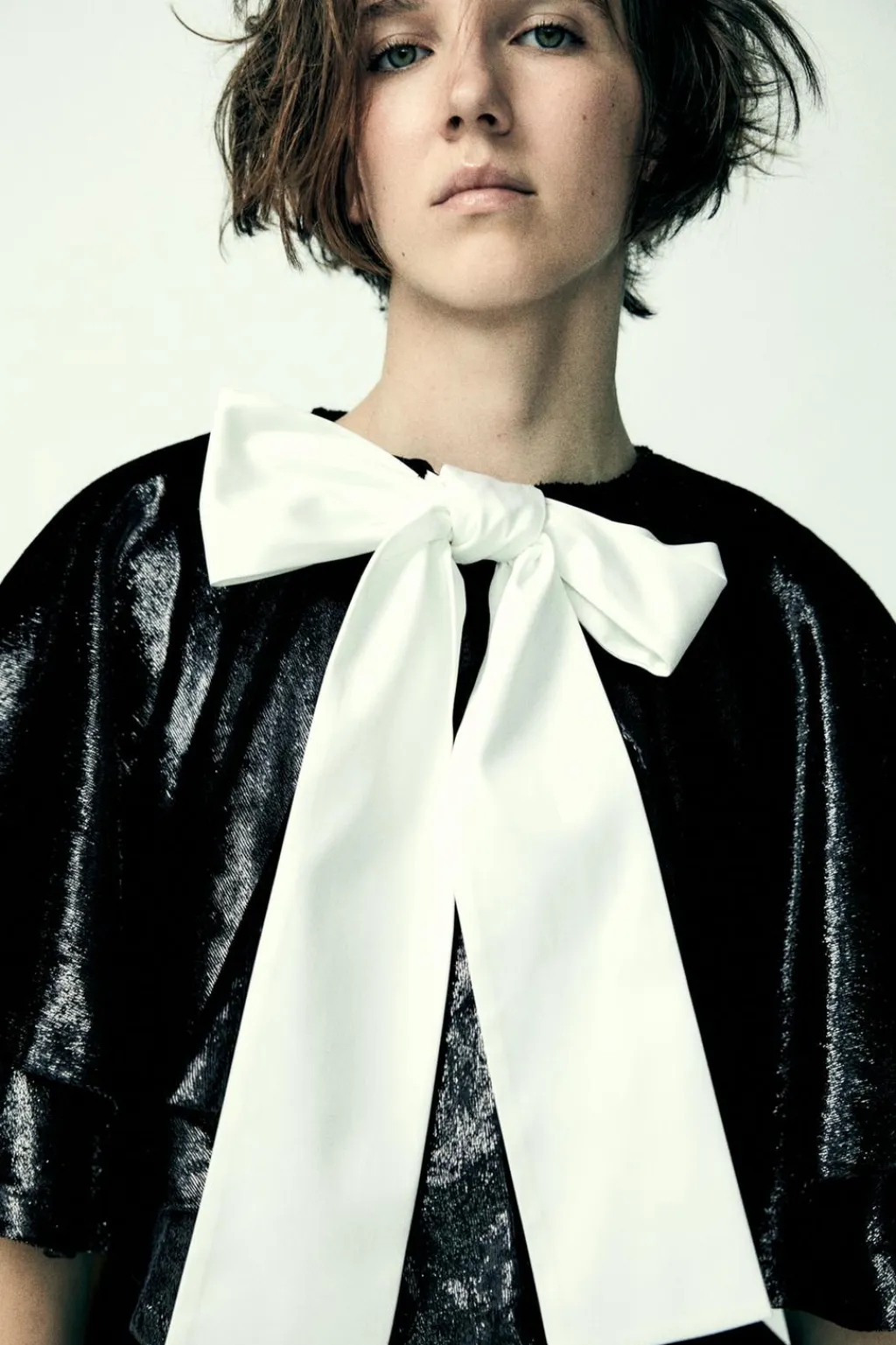 Capa corta de cuello redondo con lazada combinado en tejido satinado.