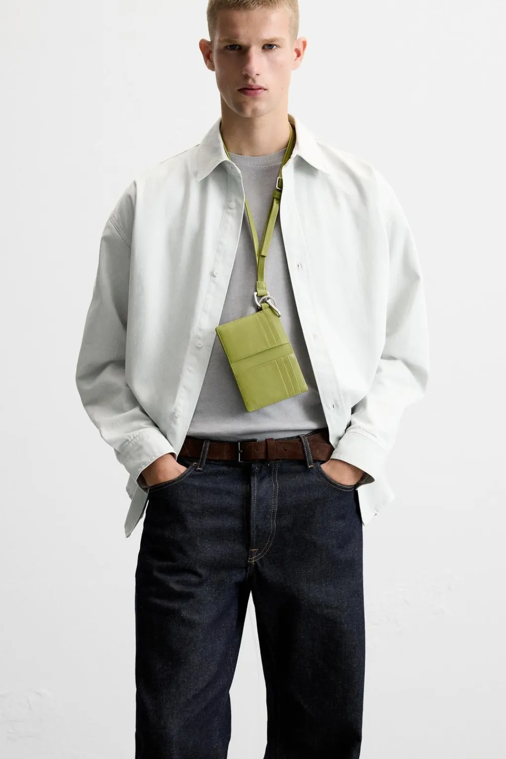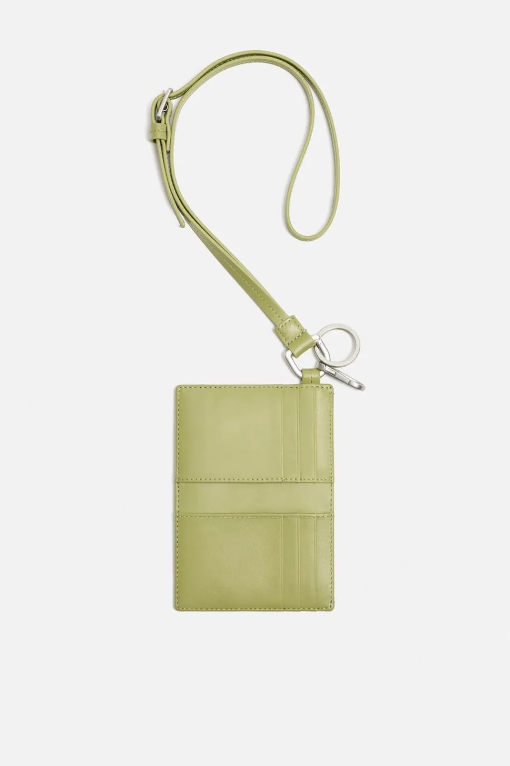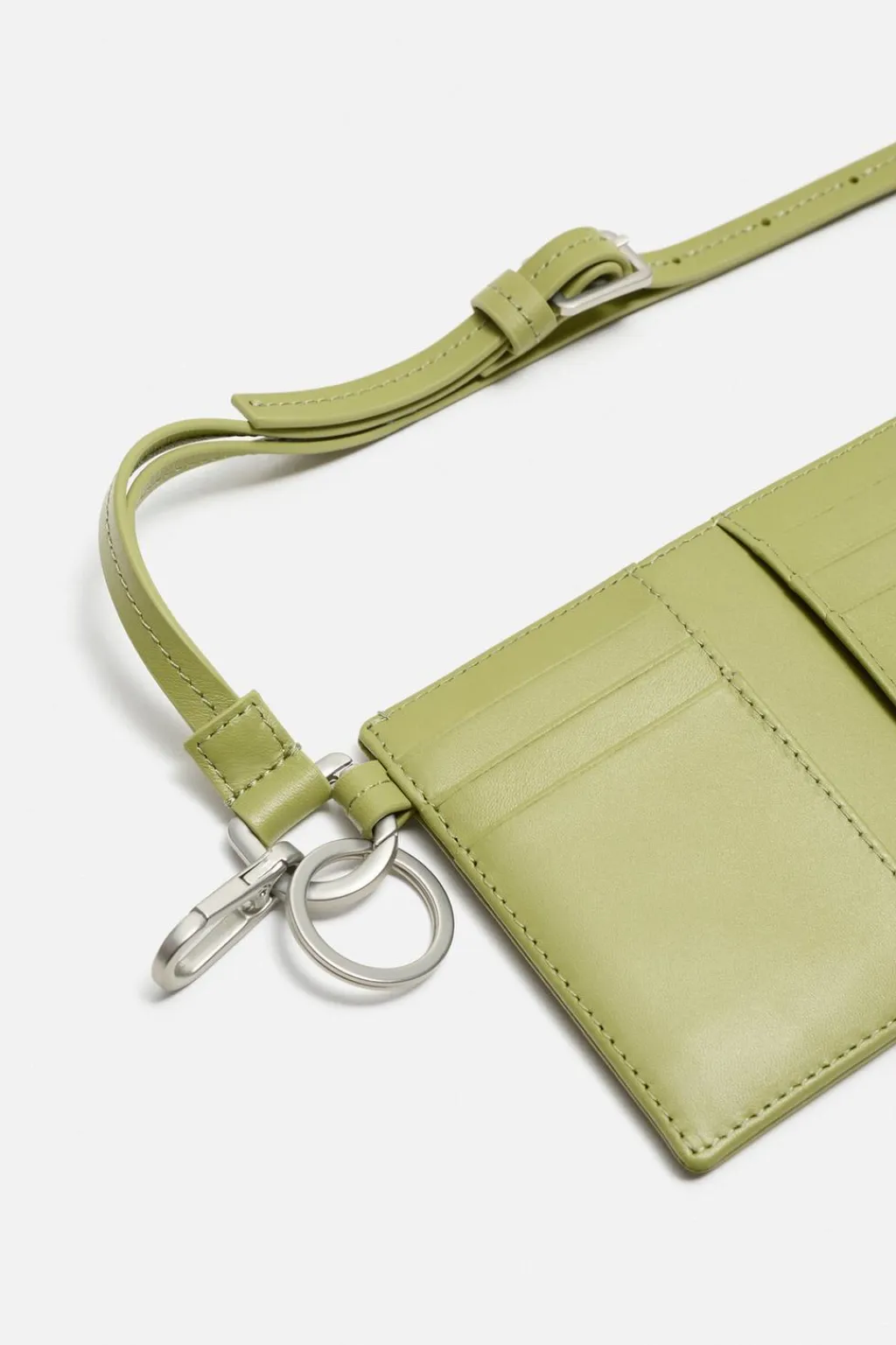 Cartera tipo tarjetero formato maxi. Fabricada en piel. Cuenta con seis posiciones para tarjetas y tres bolsillos. Dispone de un cordón para llevar colgado. Además tiene una anilla y un mosquetón metálicos, ambos extraíbles.