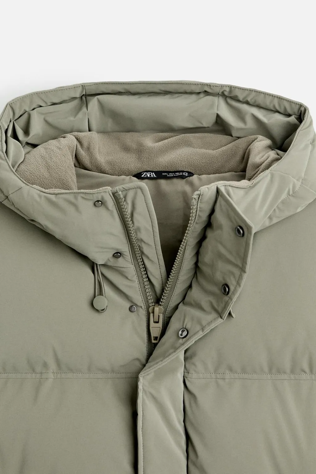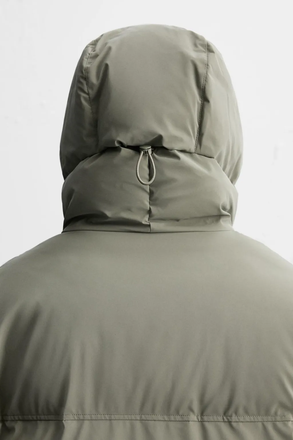 Cazadora acolchada confeccionada en tejido técnico. Cuello subido con capucha ajustable. Manga larga acabada con puño interior con acabado perchado y elástico. Bolsillos de vivo en cadera y detalle de bolsillo interior. Cierre frontal de cremallera oculta por solapa con botones a presión.