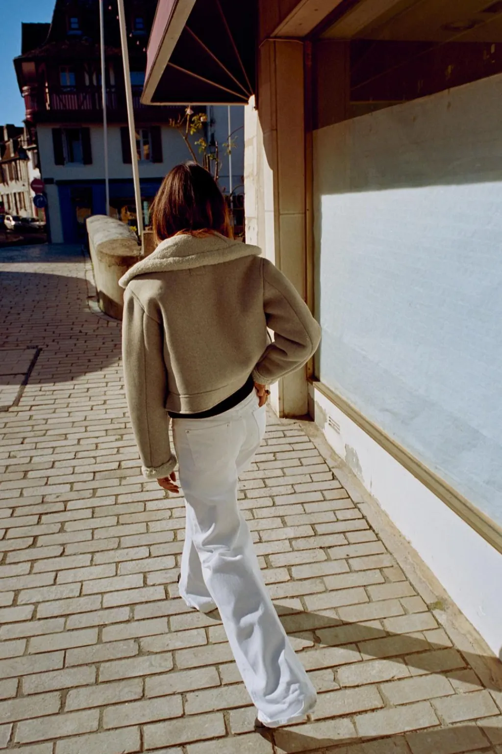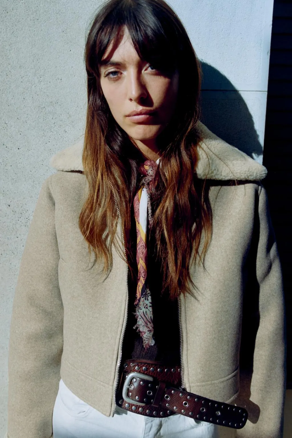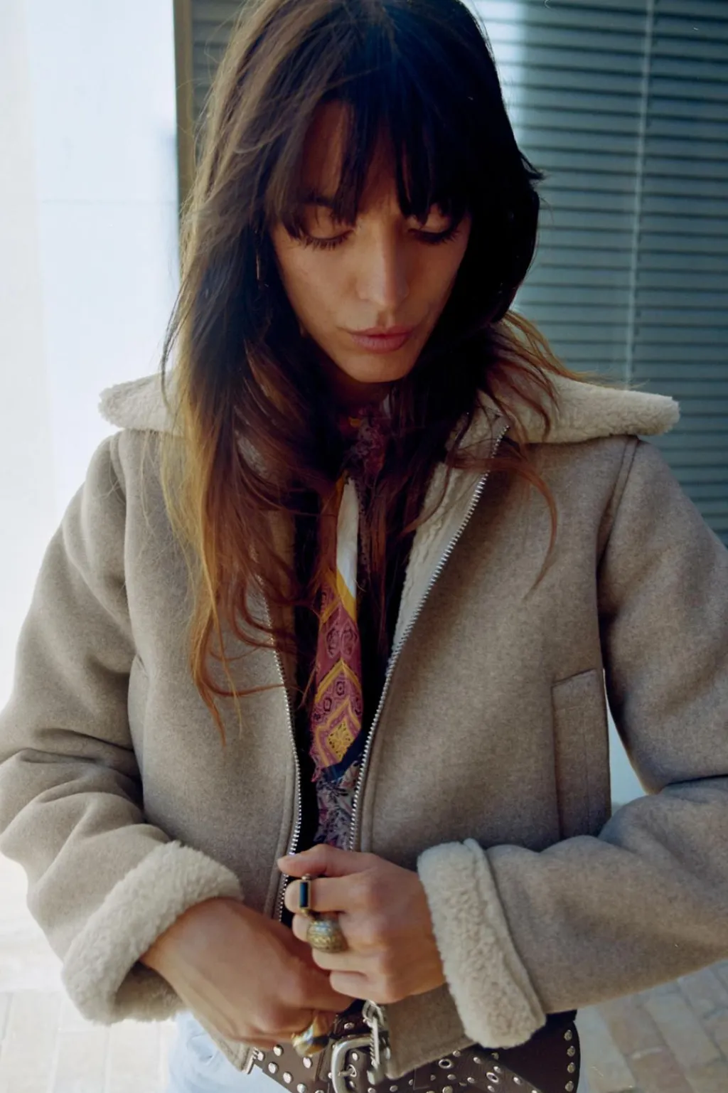 Cazadora de cuello solapa y manga larga. Bolsillos delanteros de vivo. Detalle de tejido interior combinado en borreguillo. Cierre frontal con cremallera.