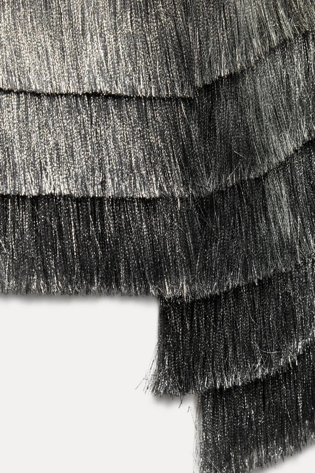 Cazadora de cuello redondo y manga larga. Detalle de flecos con hilo metalizado. Cierre frontal con corchetes ocultos.