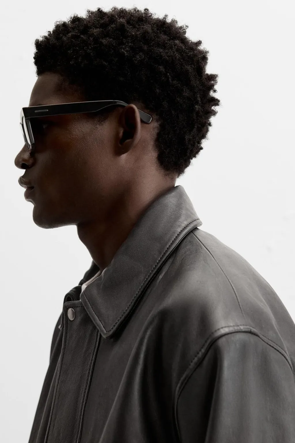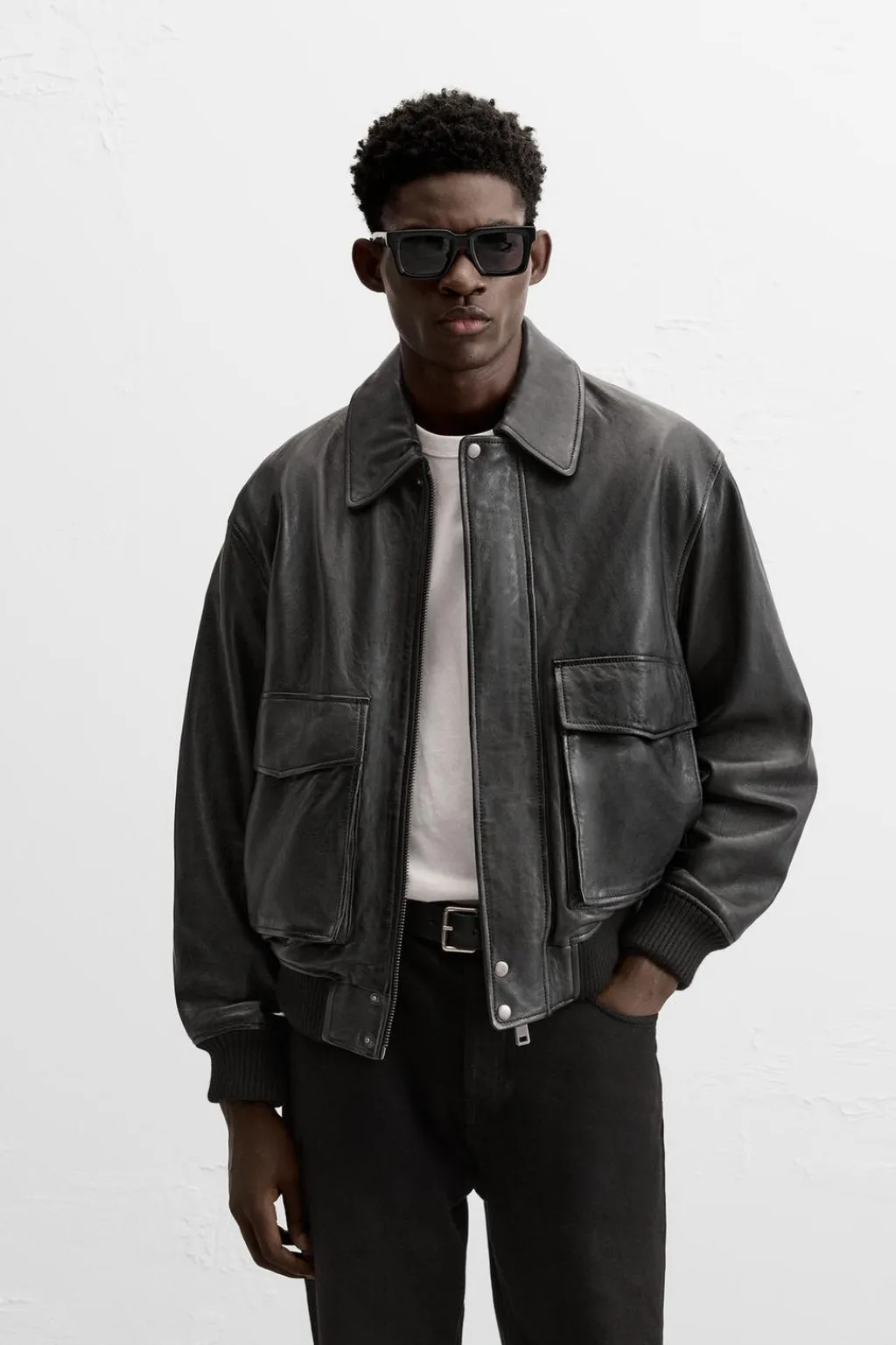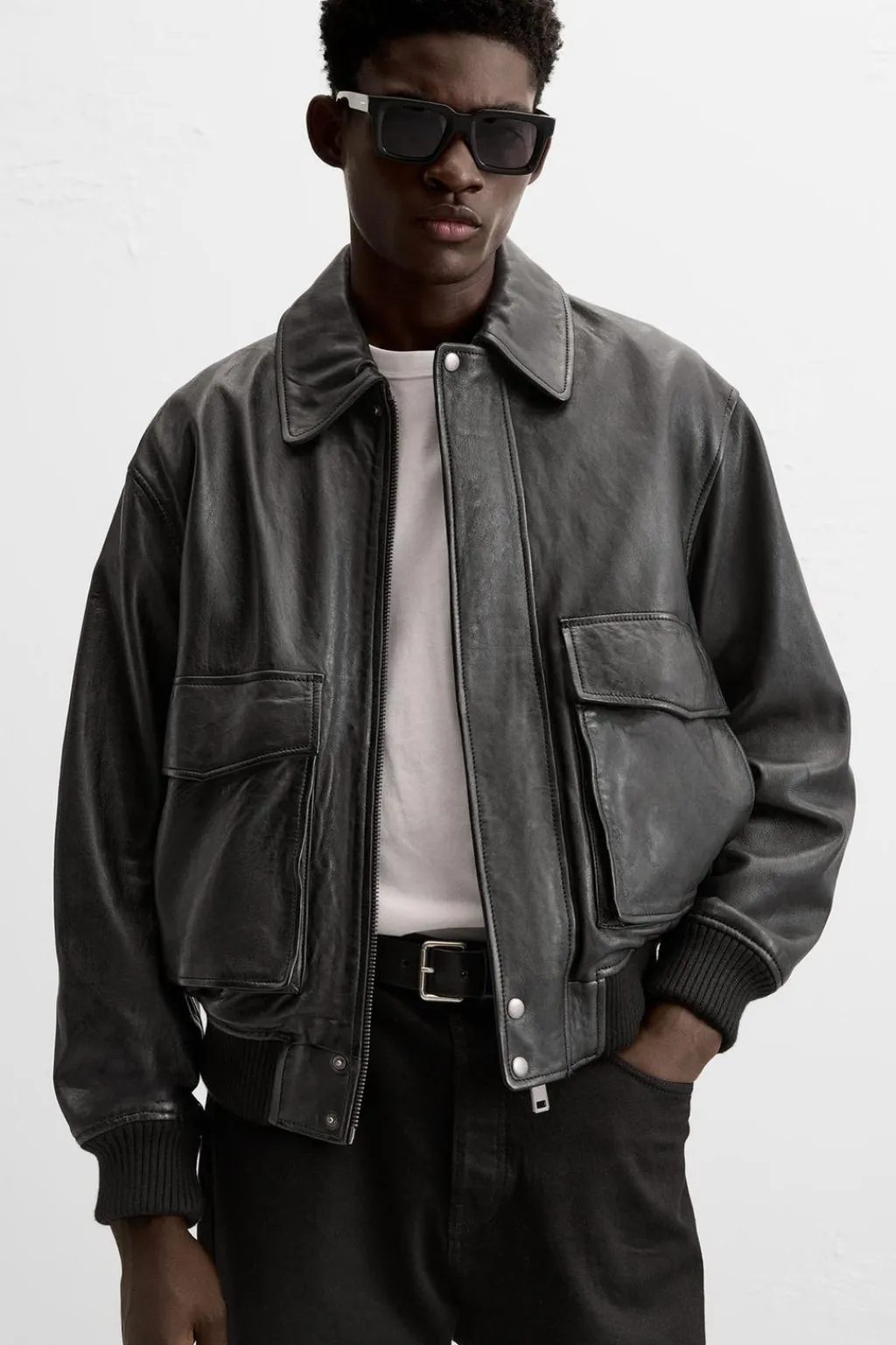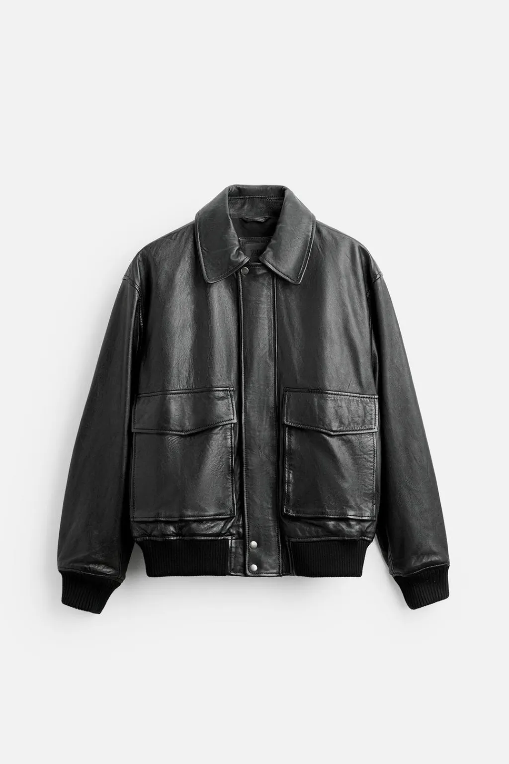 Cazadora relaxed fit confeccionada en piel. Cuello solapa y manga larga. Bolsillos plastrón con solapa en cadera. Acabados en rib. Cierre frontal con cremallera oculta por solapa con botones a presión.