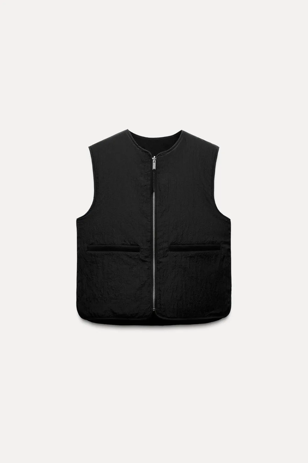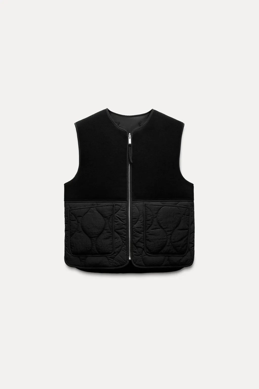 Chaleco reversible confeccionado en hilatura con lana. Cuello redondo y manga sisa. Bolsillos de plastrón en delantero. Bajo redondeado. Cierre frontal con cremallera metálica.