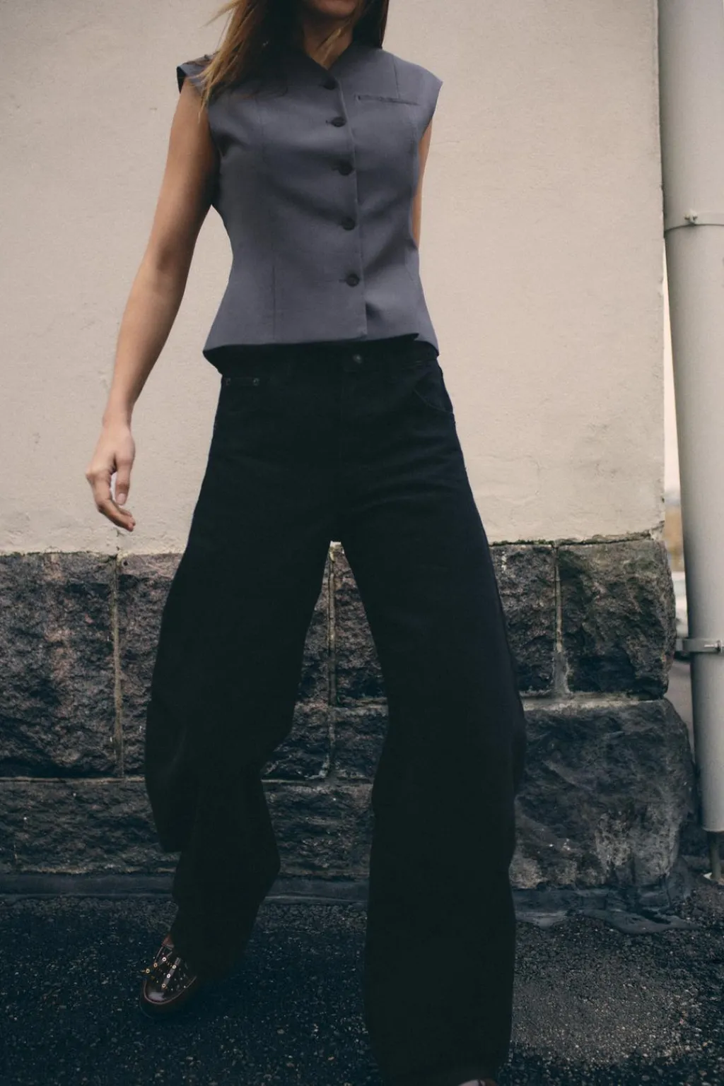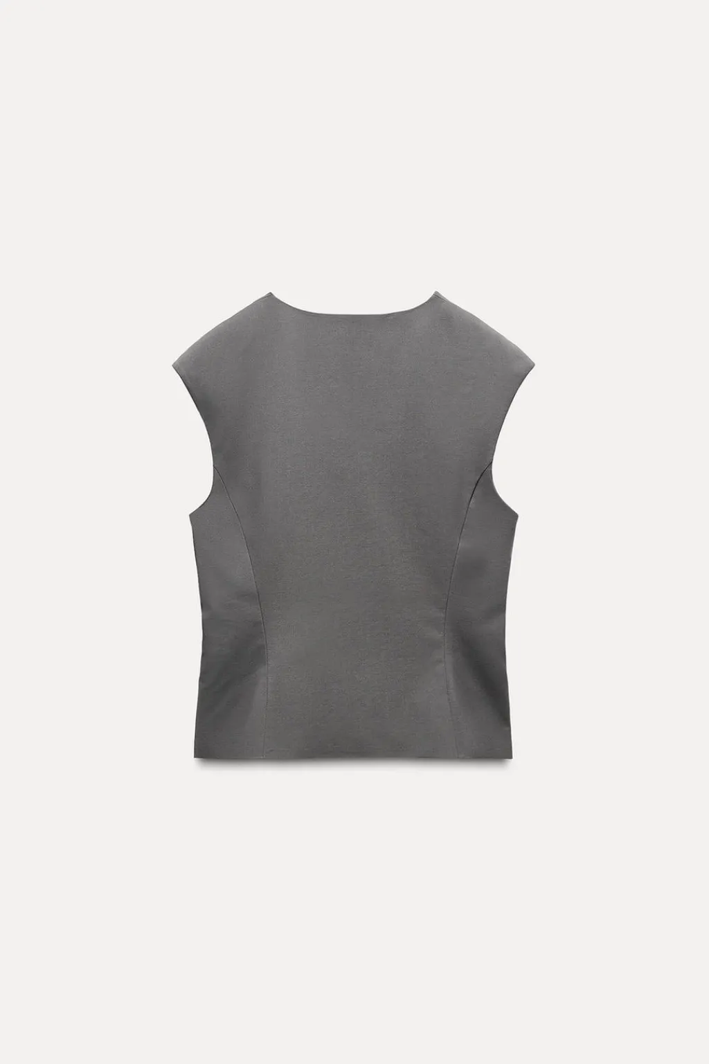 Chaleco top entallado de cuello pico y manga sisa. Falso bolsillo de vivo en pecho. Cierre frontal con botones.