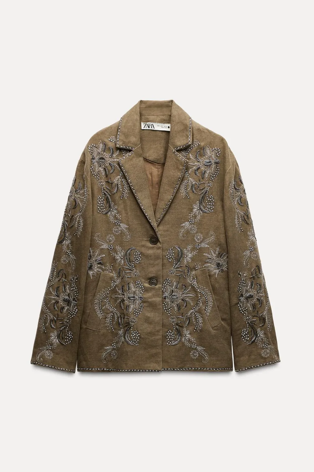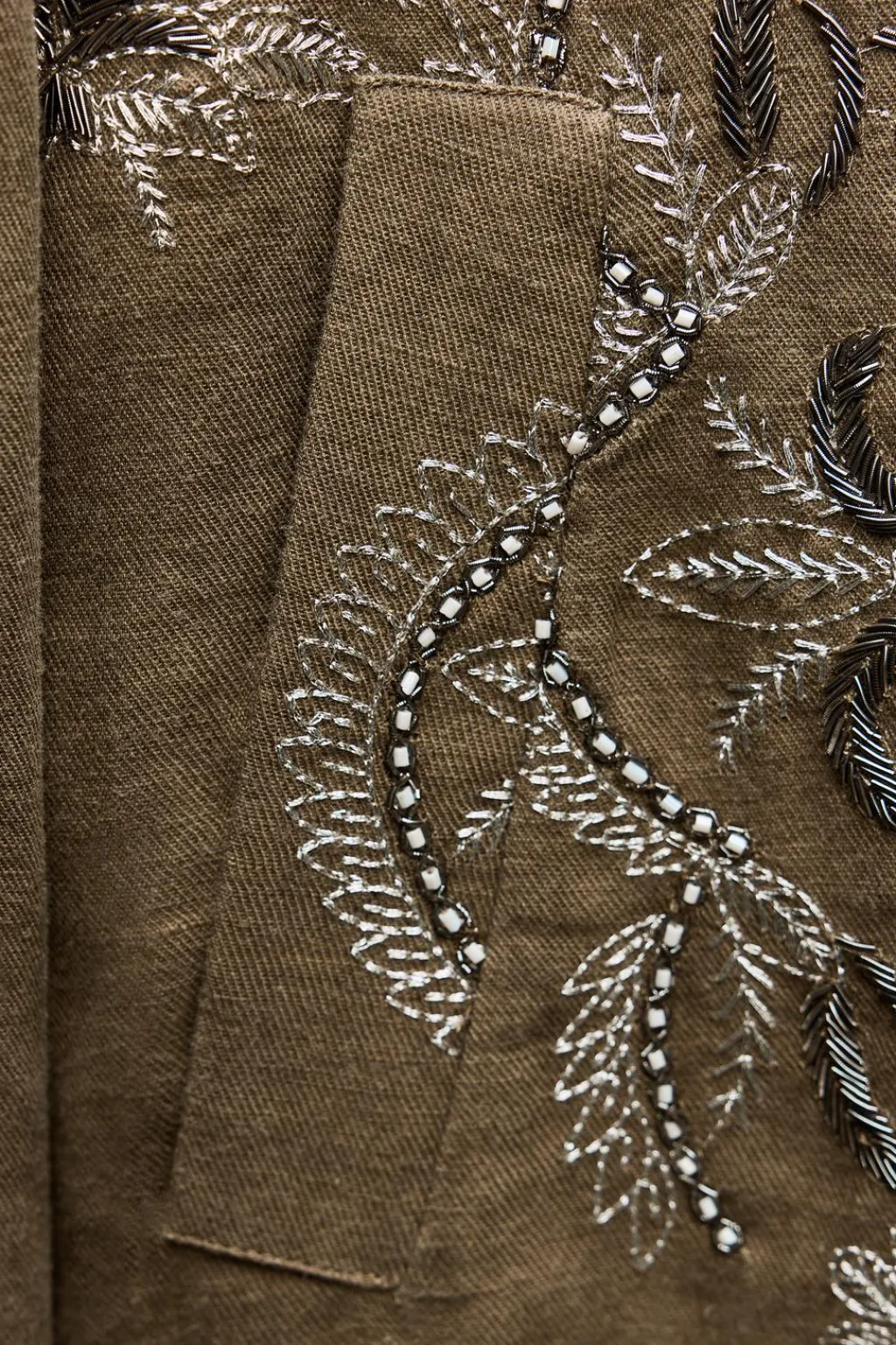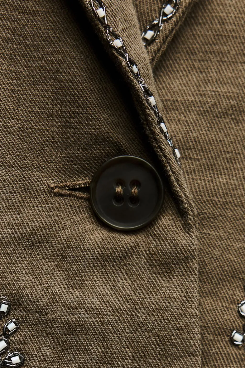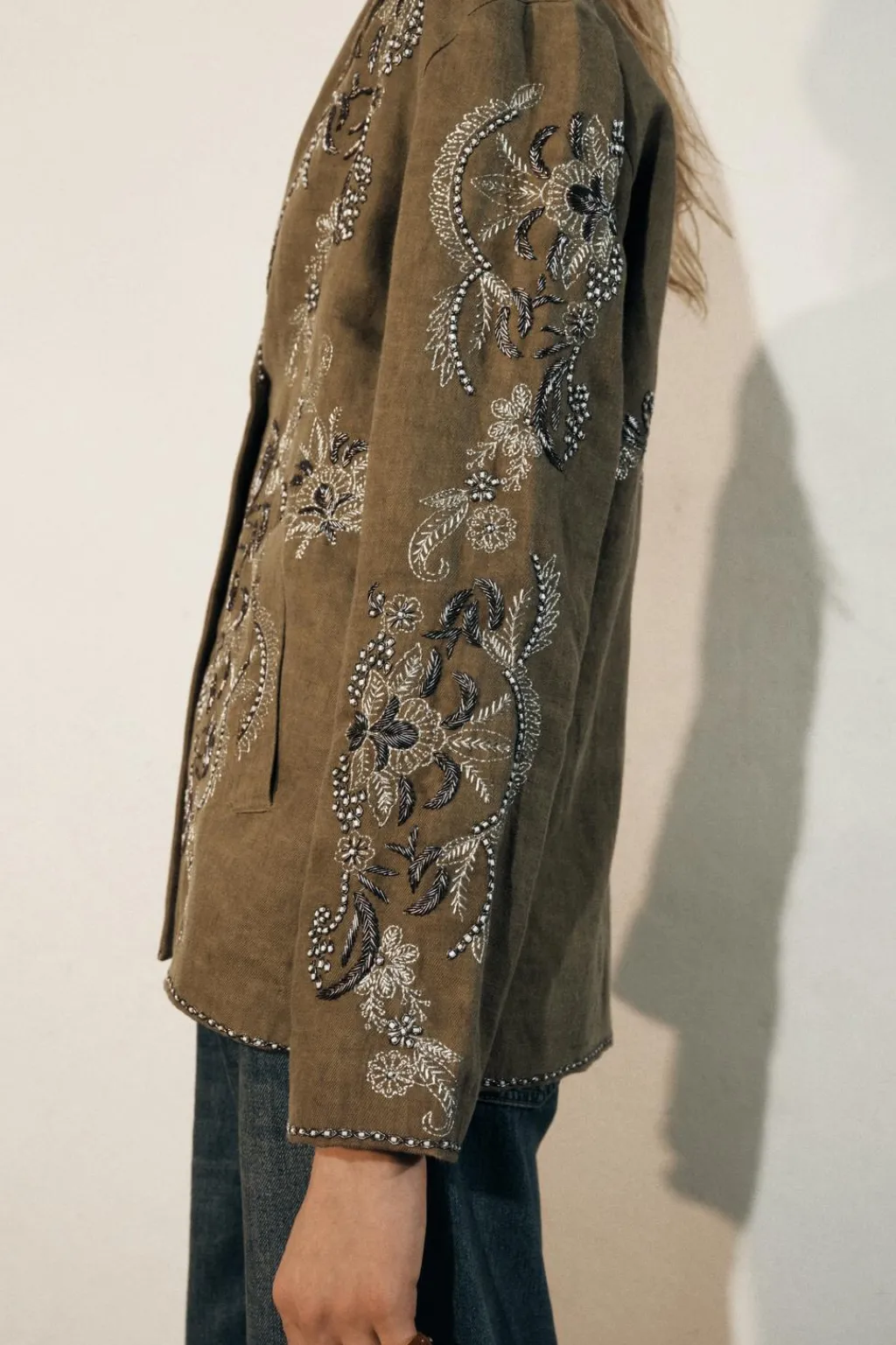 Chaqueta confeccionada en hilatura con lino y con algodón. Cuello solapa de muescas y manga larga. DEtalle de bordados a contraste. Bolsillos delanteros. Cierre frontal con botones.