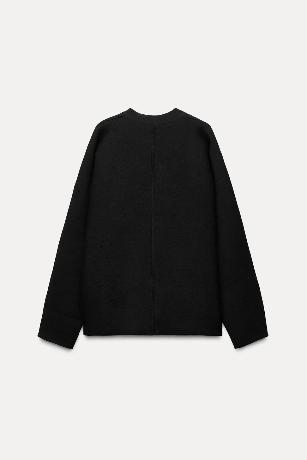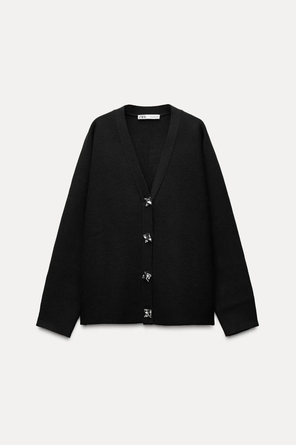Chaqueta amplia de escote pico y manga larga. Cierre frontal con botones metálicos con relieve.