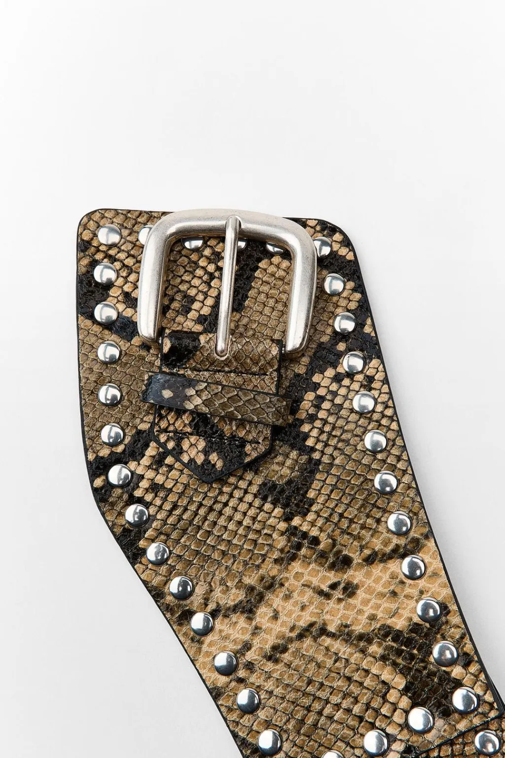 Cinturón tipo fajín de 11 cm de ancho realizado en piel. Detalle aplicación de tachas combinadas a contraste. Hebilla metálica cuadrada.