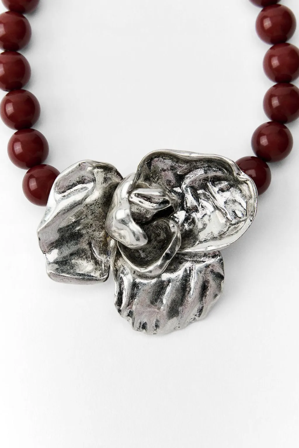 Collar de bolas a color con aplicación de flor metálica labrada en relieve. Cierre con mosquetón.
