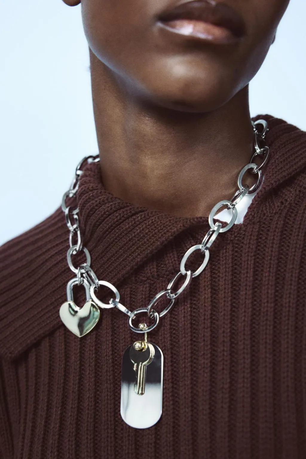 Collar tipo cadena de eslabones metálicos. Colgante de charms en forma de corazón, placa y llave combinados a contraste. Cierre con mosquetón.