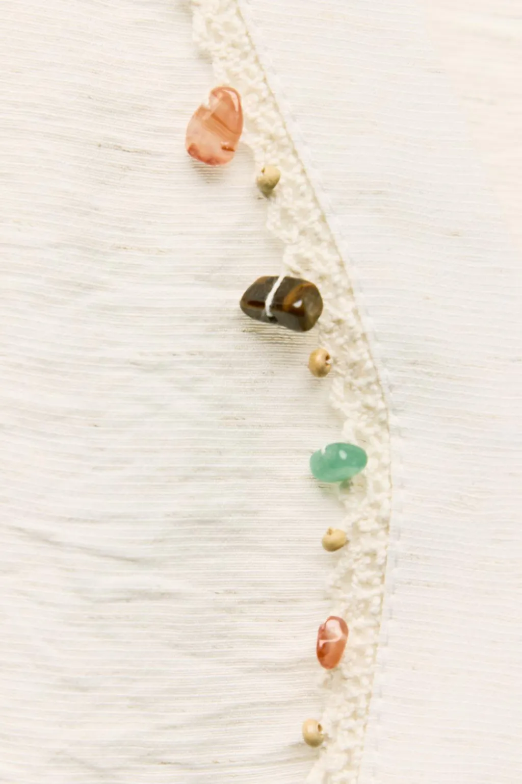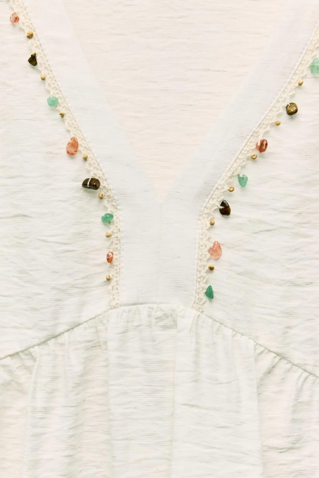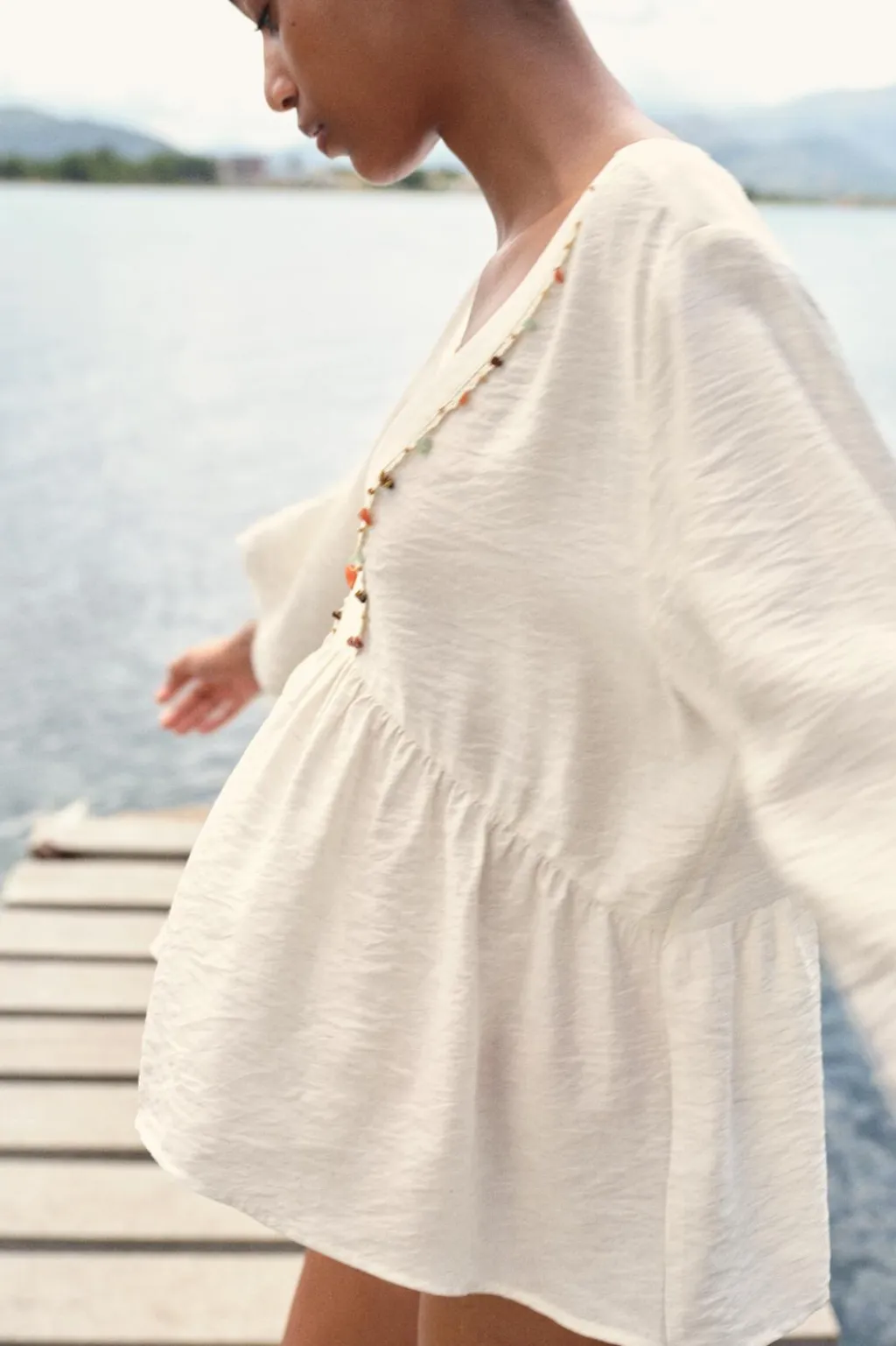 Cuerpo de escote pico con detalle de pasamanería combinada a tono y adornos piedra. Manga larga.